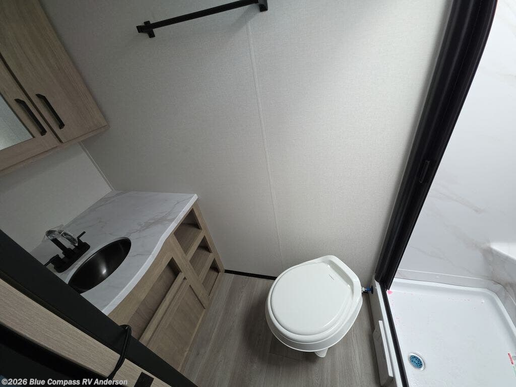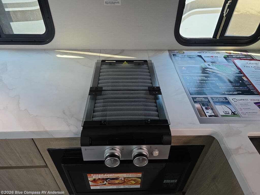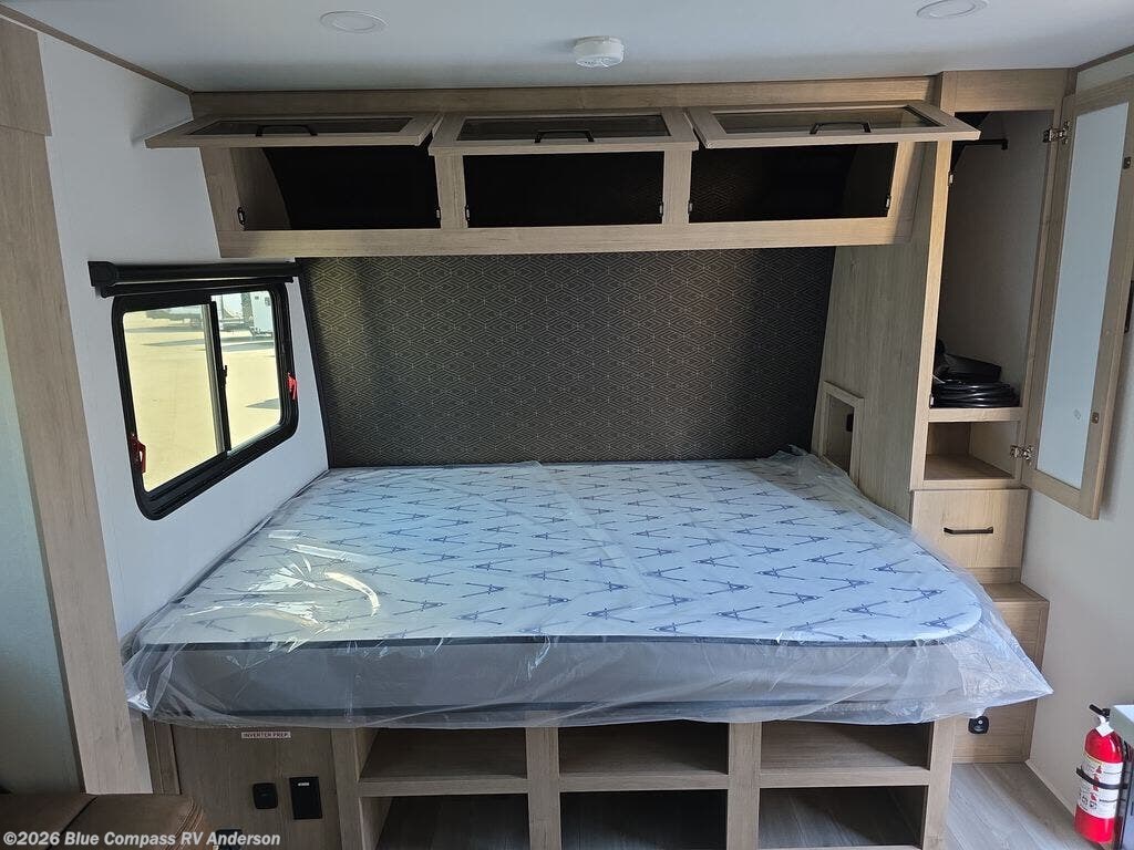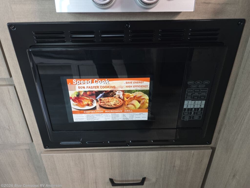 Pack your bags and head out on a fun camping trip in this travel trailer! The front queen bed offers a comfortable place to sleep at night, as well as the roll-over sleeper sofa slide with shoe storage. You can make meals on the cooktop or in the convection microwave. The full rear bathroom has a walk-in shower with an oversized vanity to easily get ready each day. Outside, you'll find a spray port, an unobstructed pass-thru storage, and an interior/exterior table to use at your convenience.