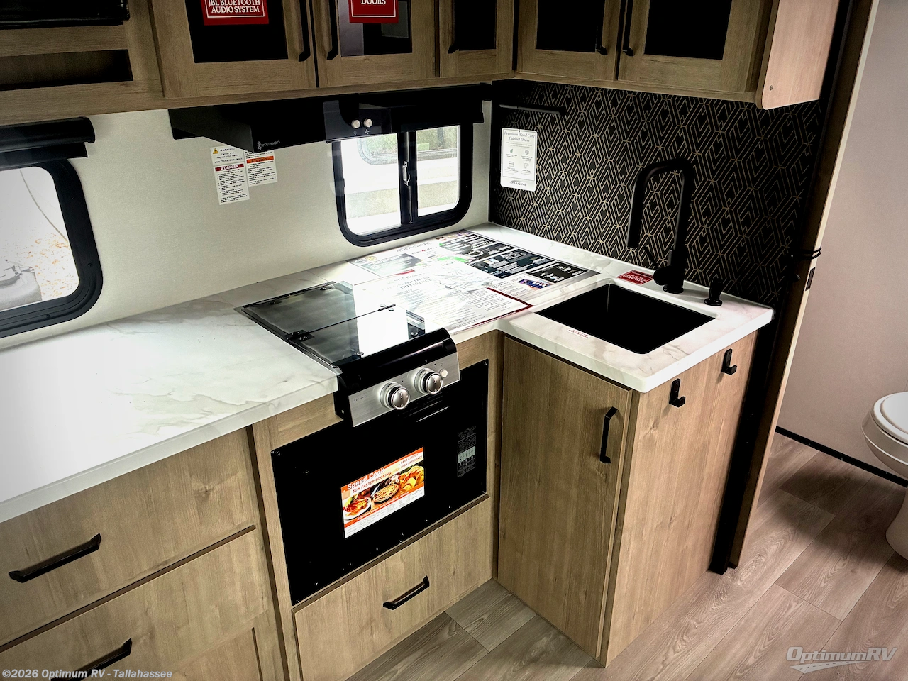 Pack your bags and head out on a fun camping trip in this travel trailer! The front queen bed offers a comfortable place to sleep at night, as well as the roll-over sleeper sofa slide with shoe storage. You can make meals on the cooktop or in the convection microwave. The full rear bathroom has a walk-in shower with an oversized vanity to easily get ready each day. Outside, you'll find a spray port, an unobstructed pass-thru storage, and an interior/exterior table to use at your convenience.