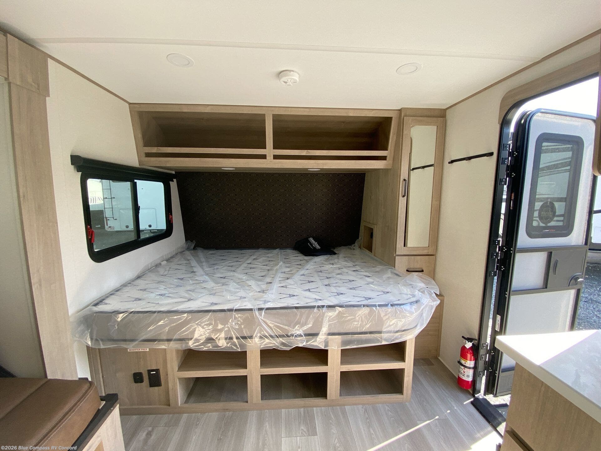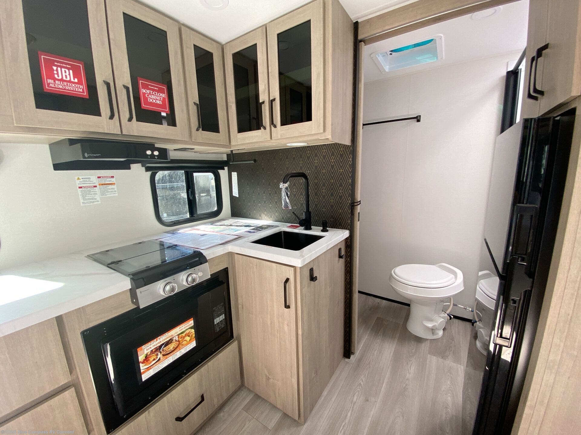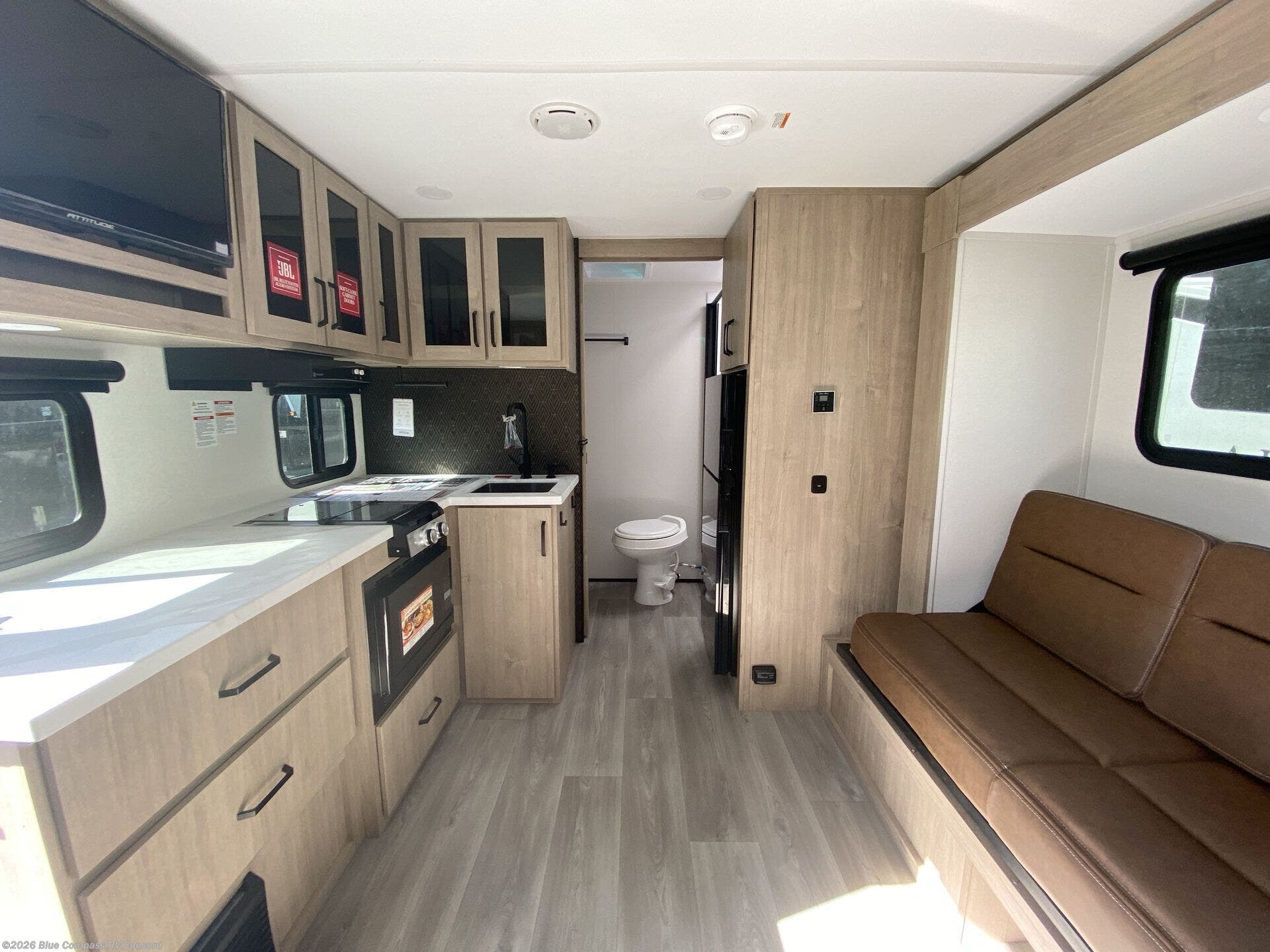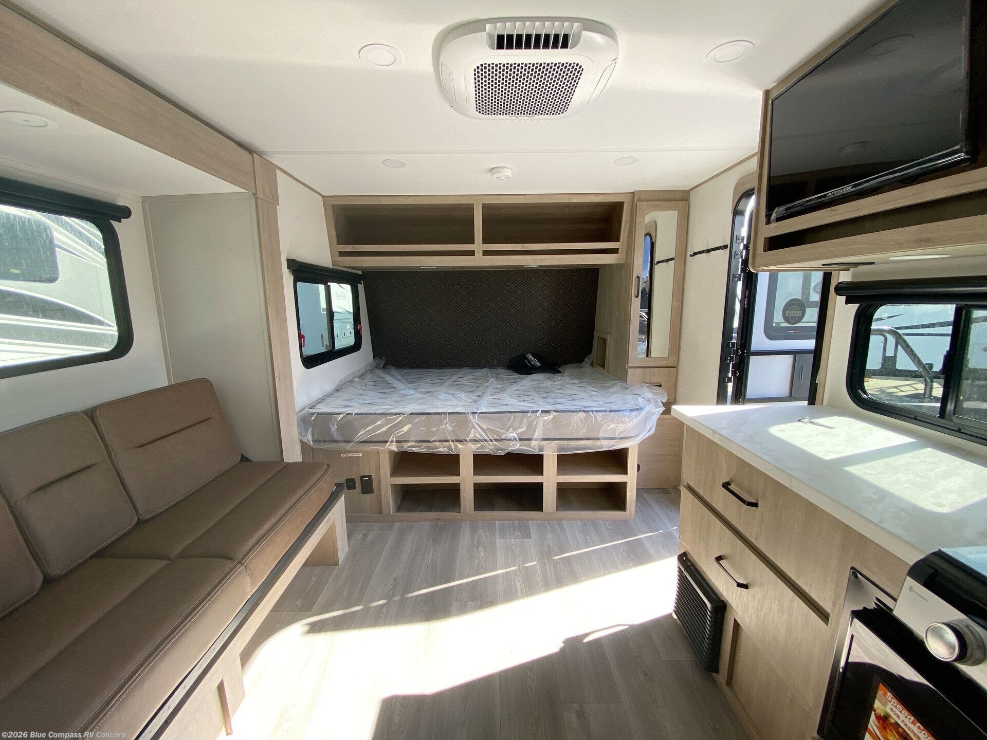Pack your bags and head out on a fun camping trip in this travel trailer! The front queen bed offers a comfortable place to sleep at night, as well as the roll-over sleeper sofa slide with shoe storage. You can make meals on the cooktop or in the convection microwave. The full rear bathroom has a walk-in shower with an oversized vanity to easily get ready each day. Outside, you'll find a spray port, an unobstructed pass-thru storage, and an interior/exterior table to use at your convenience.