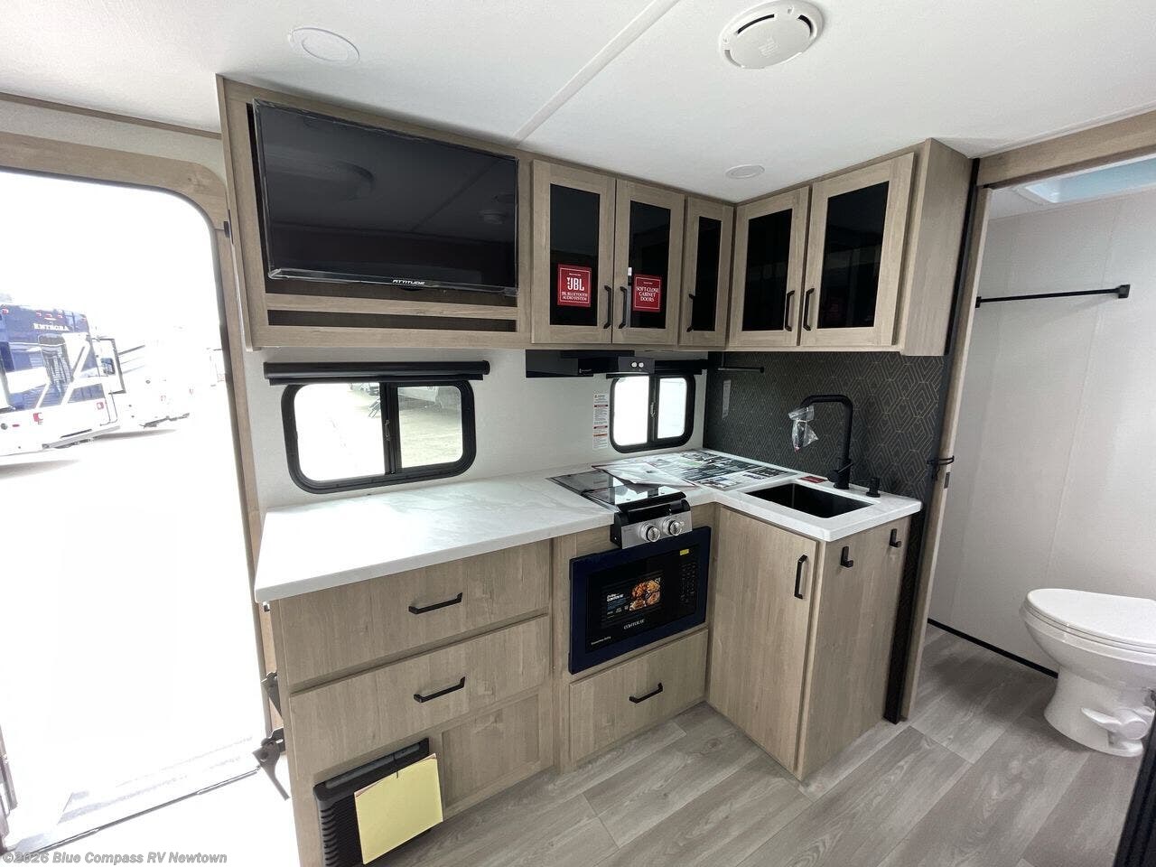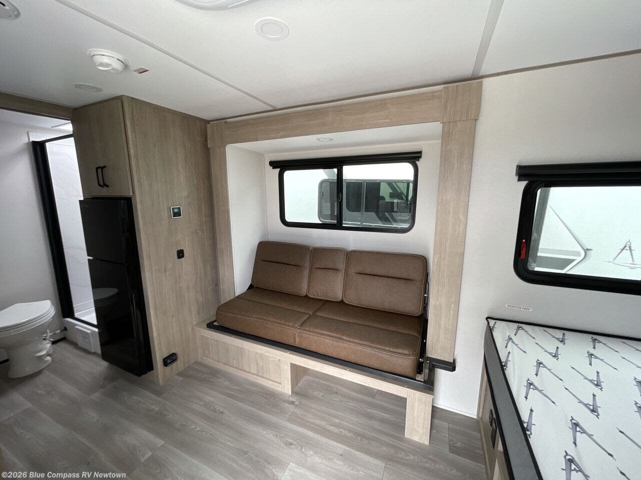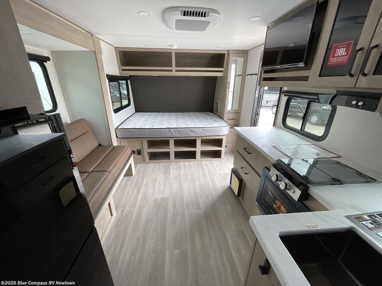 Pack your bags and head out on a fun camping trip in this travel trailer! The front queen bed offers a comfortable place to sleep at night, as well as the roll-over sleeper sofa slide with shoe storage. You can make meals on the cooktop or in the convection microwave. The full rear bathroom has a walk-in shower with an oversized vanity to easily get ready each day. Outside, you'll find a spray port, an unobstructed pass-thru storage, and an interior/exterior table to use at your convenience.