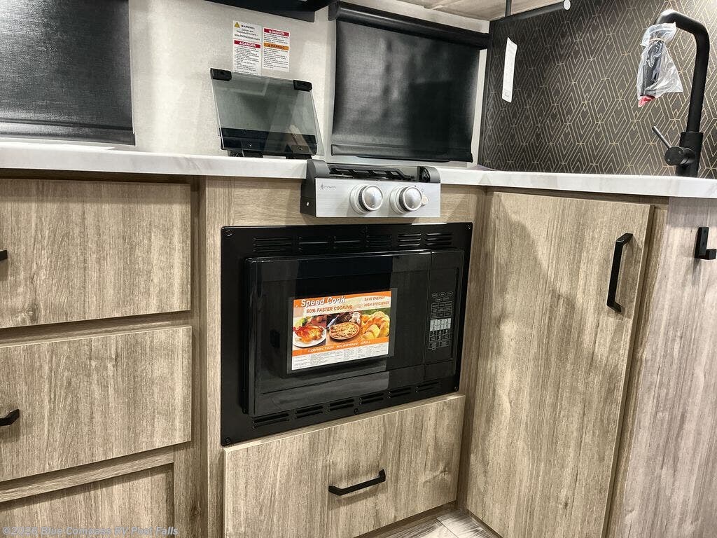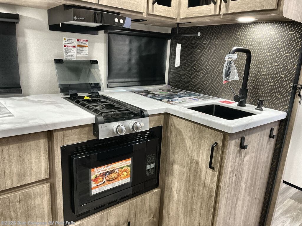 Pack your bags and head out on a fun camping trip in this travel trailer! The front queen bed offers a comfortable place to sleep at night, as well as the roll-over sleeper sofa slide with shoe storage. You can make meals on the cooktop or in the convection microwave. The full rear bathroom has a walk-in shower with an oversized vanity to easily get ready each day. Outside, you'll find a spray port, an unobstructed pass-thru storage, and an interior/exterior table to use at your convenience.