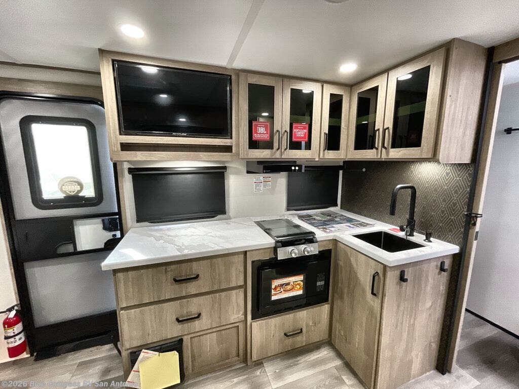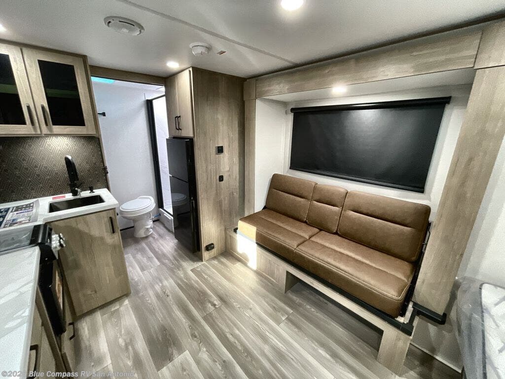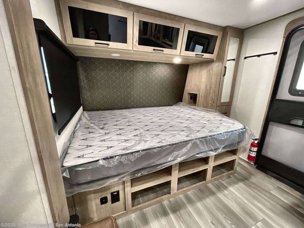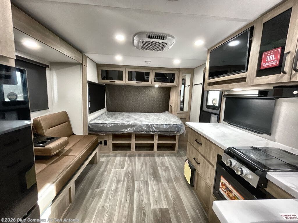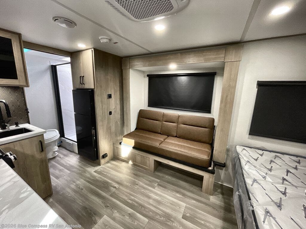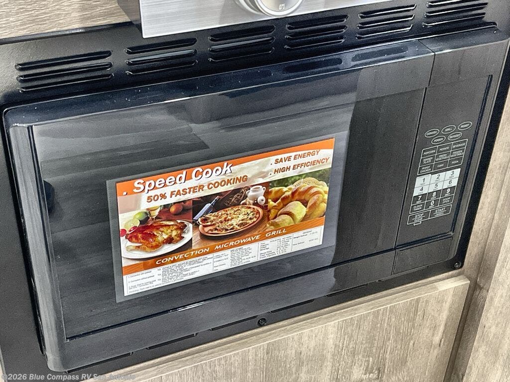 Pack your bags and head out on a fun camping trip in this travel trailer! The front queen bed offers a comfortable place to sleep at night, as well as the roll-over sleeper sofa slide with shoe storage. You can make meals on the cooktop or in the convection microwave. The full rear bathroom has a walk-in shower with an oversized vanity to easily get ready each day. Outside, you'll find a spray port, an unobstructed pass-thru storage, and an interior/exterior table to use at your convenience.