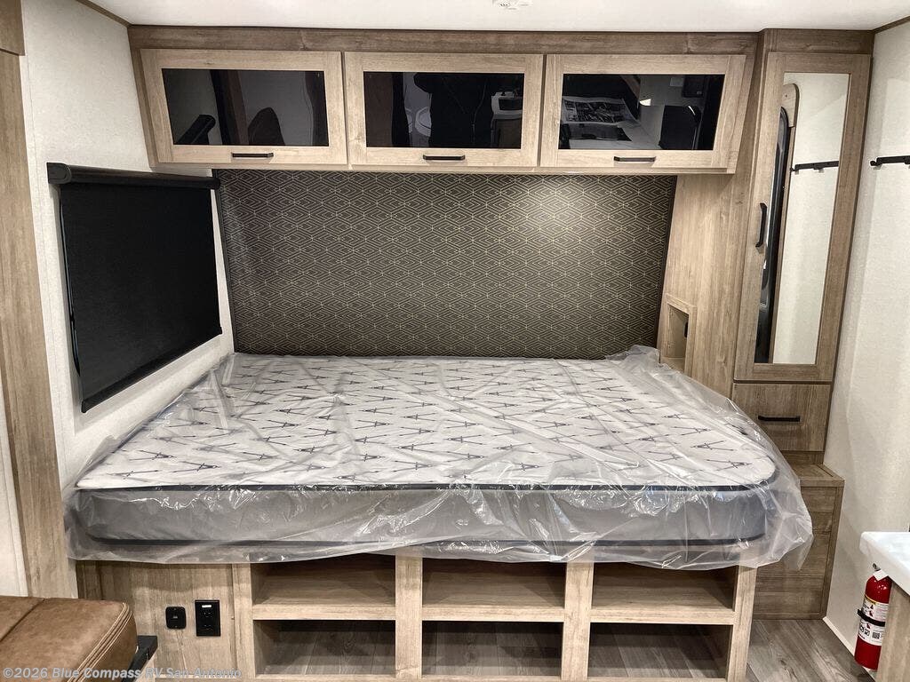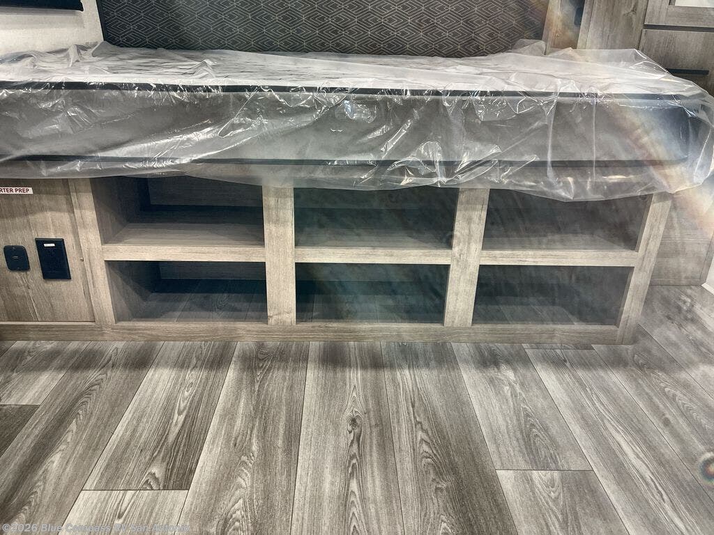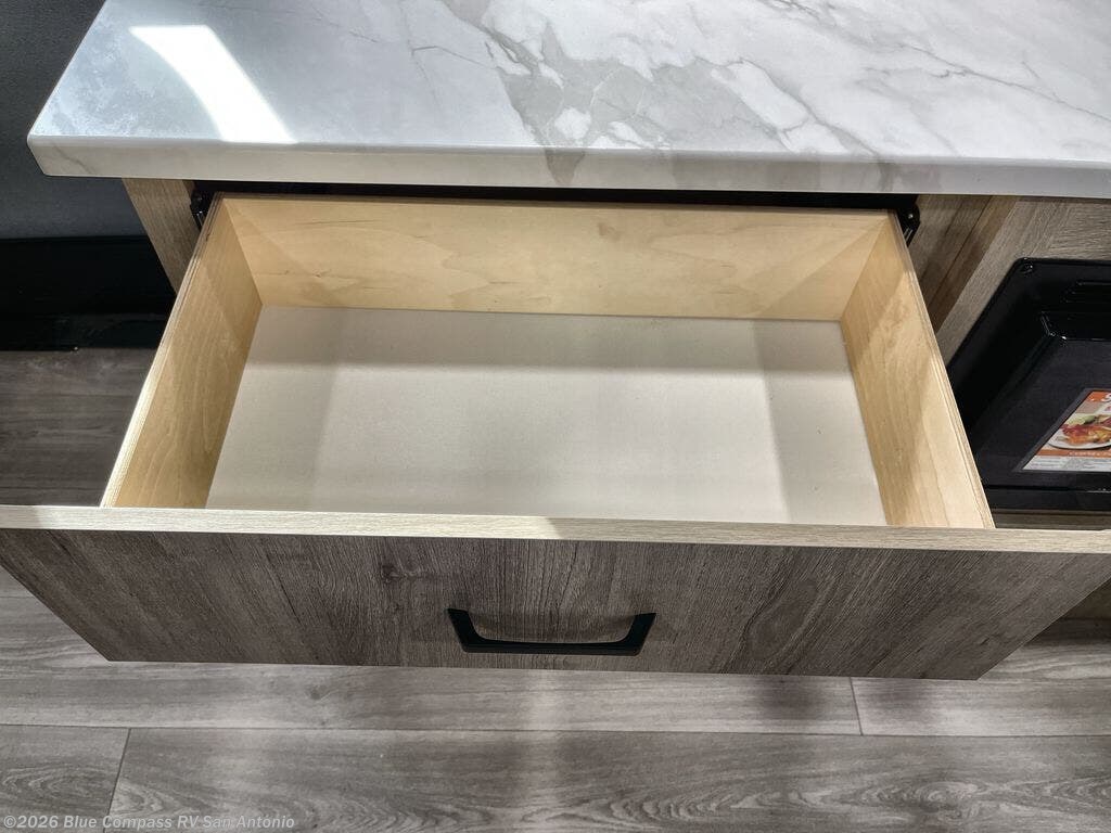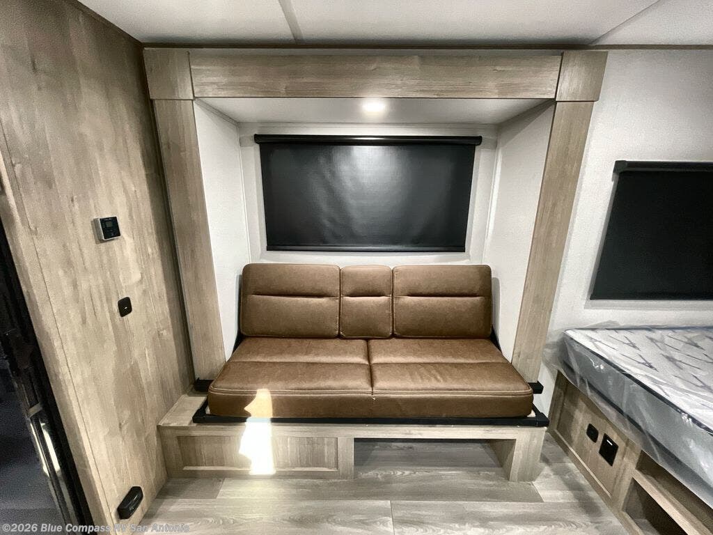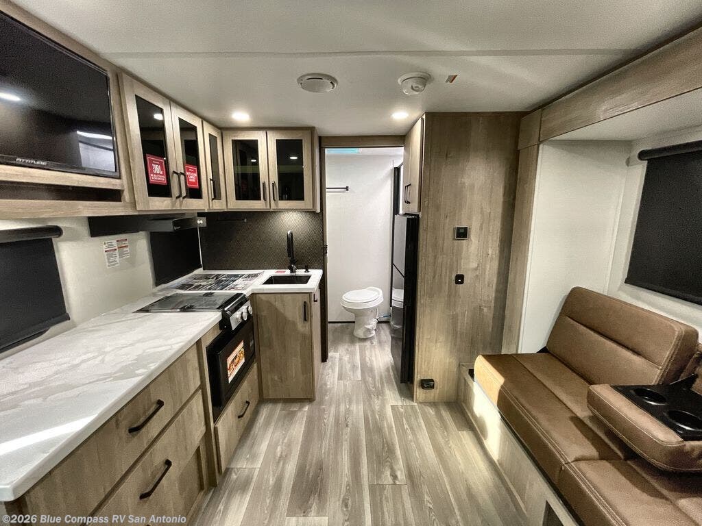 Pack your bags and head out on a fun camping trip in this travel trailer! The front queen bed offers a comfortable place to sleep at night, as well as the roll-over sleeper sofa slide with shoe storage. You can make meals on the cooktop or in the convection microwave. The full rear bathroom has a walk-in shower with an oversized vanity to easily get ready each day. Outside, you'll find a spray port, an unobstructed pass-thru storage, and an interior/exterior table to use at your convenience.