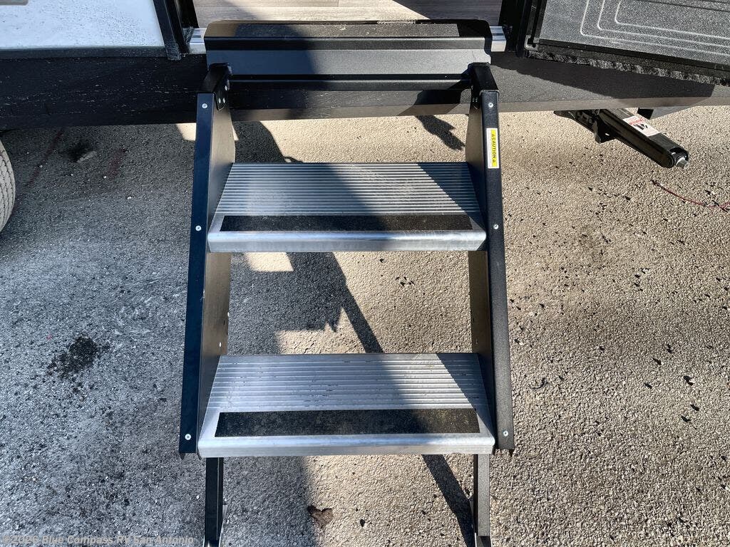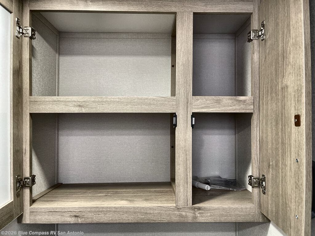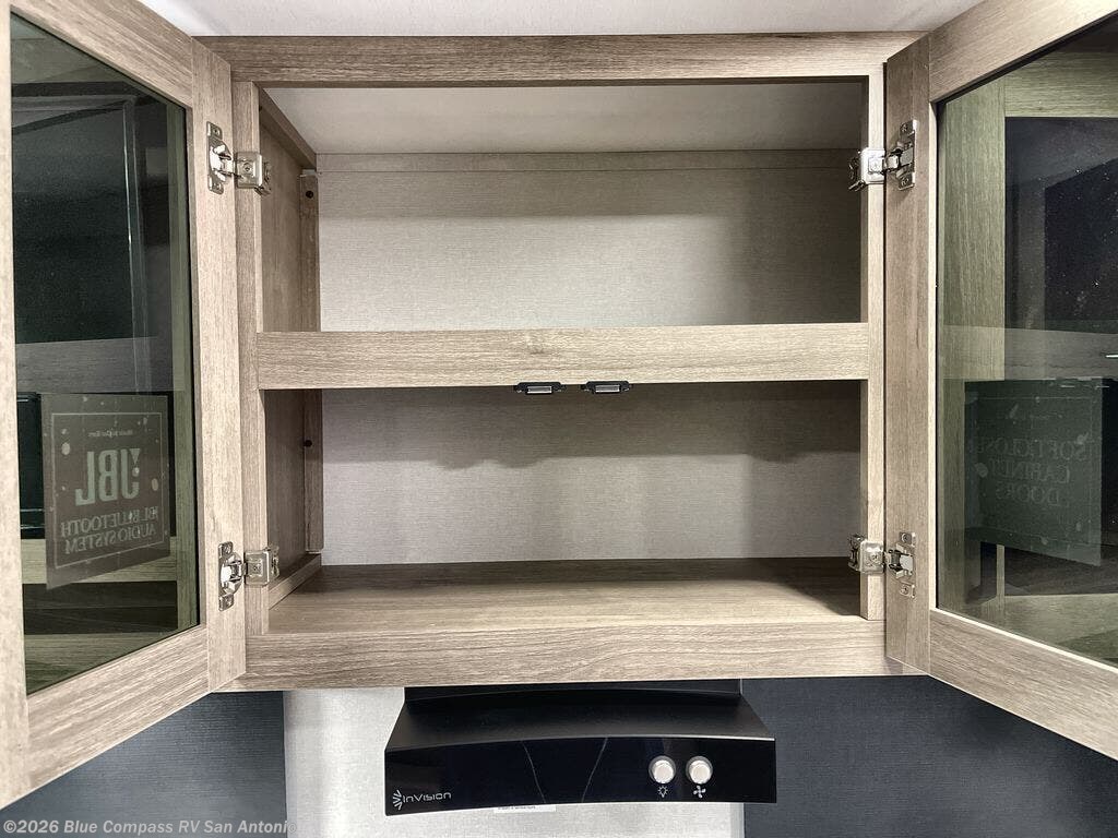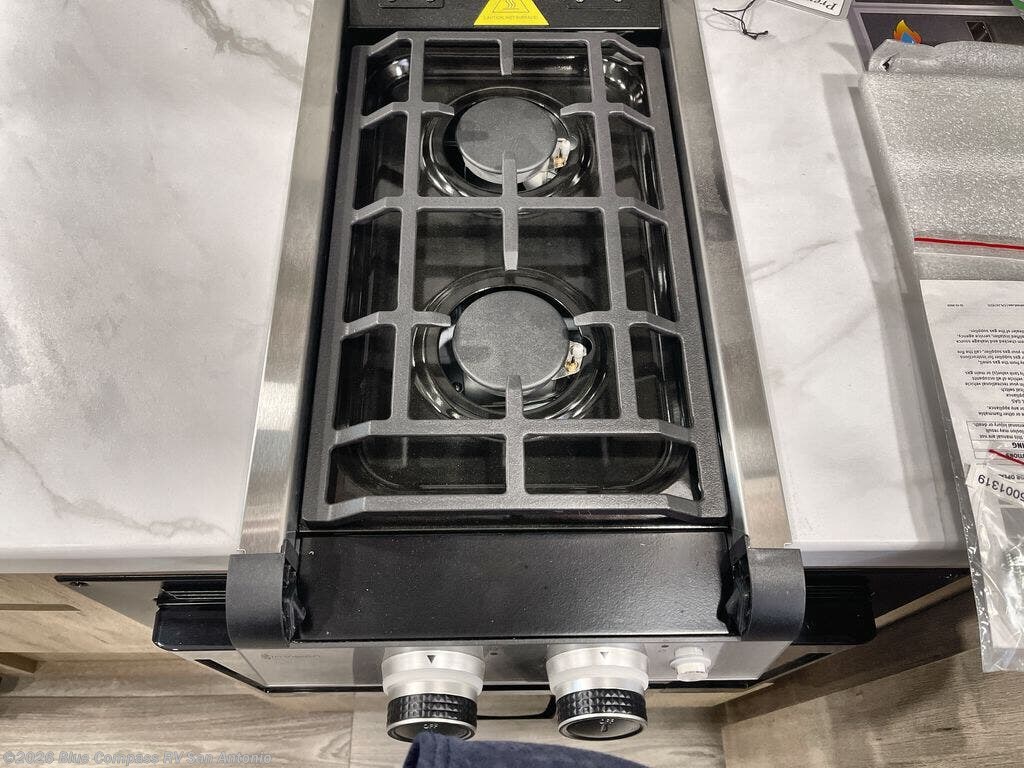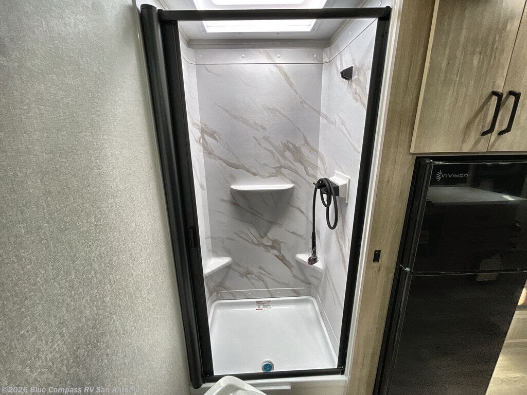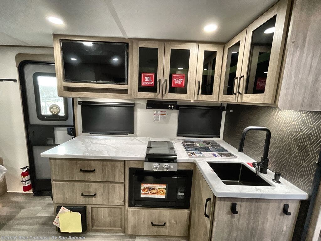 Pack your bags and head out on a fun camping trip in this travel trailer! The front queen bed offers a comfortable place to sleep at night, as well as the roll-over sleeper sofa slide with shoe storage. You can make meals on the cooktop or in the convection microwave. The full rear bathroom has a walk-in shower with an oversized vanity to easily get ready each day. Outside, you'll find a spray port, an unobstructed pass-thru storage, and an interior/exterior table to use at your convenience.