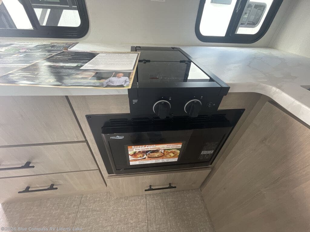 Pack your bags and head out on a fun camping trip in this travel trailer! The front queen bed offers a comfortable place to sleep at night, as well as the roll-over sleeper sofa slide with shoe storage. You can make meals on the cooktop or in the convection microwave. The full rear bathroom has a walk-in shower with an oversized vanity to easily get ready each day. Outside, you'll find a spray port, an unobstructed pass-thru storage, and an interior/exterior table to use at your convenience.
