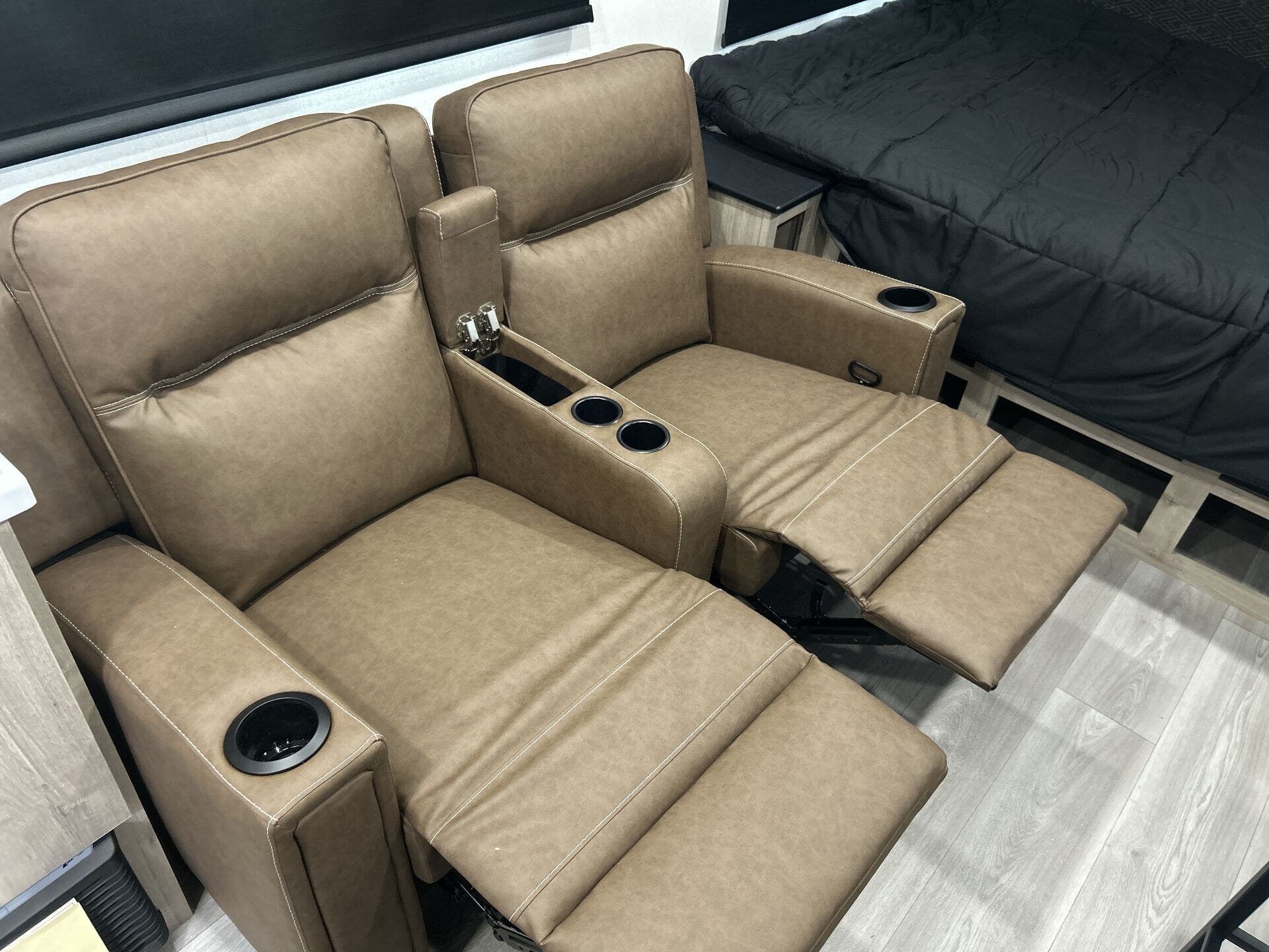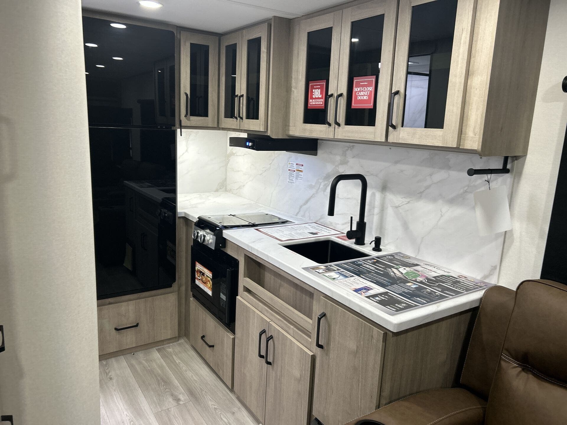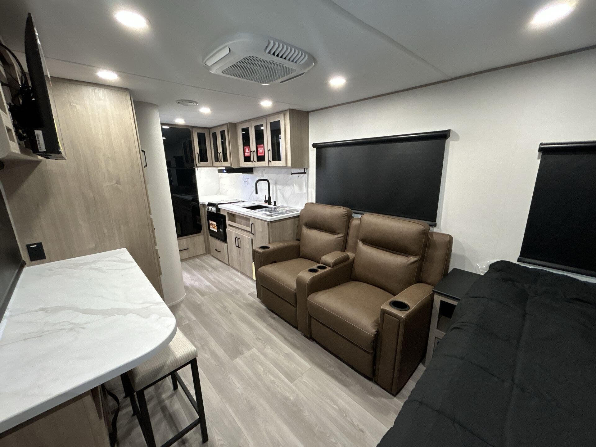 The 19MLA floor plan offers a practical and inviting living space with a front bedroom, a mid living area, a rear bath, and a rear kitchen. This configuration maximizes everyday usability while keeping trailer length manageable for easy towing and parking. The layout is designed to feel open and connected, with comfortable seating, a functional kitchen, and a private sleeping area that ensures rest after a day of outdoor exploration.