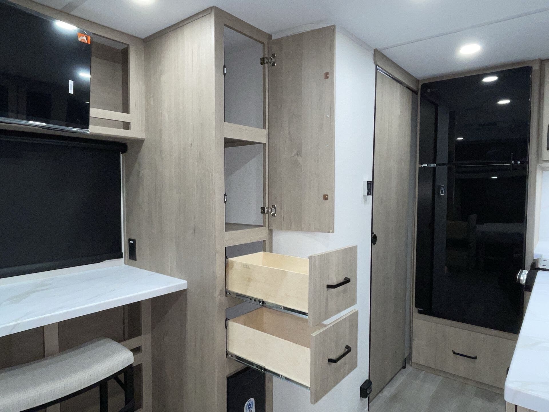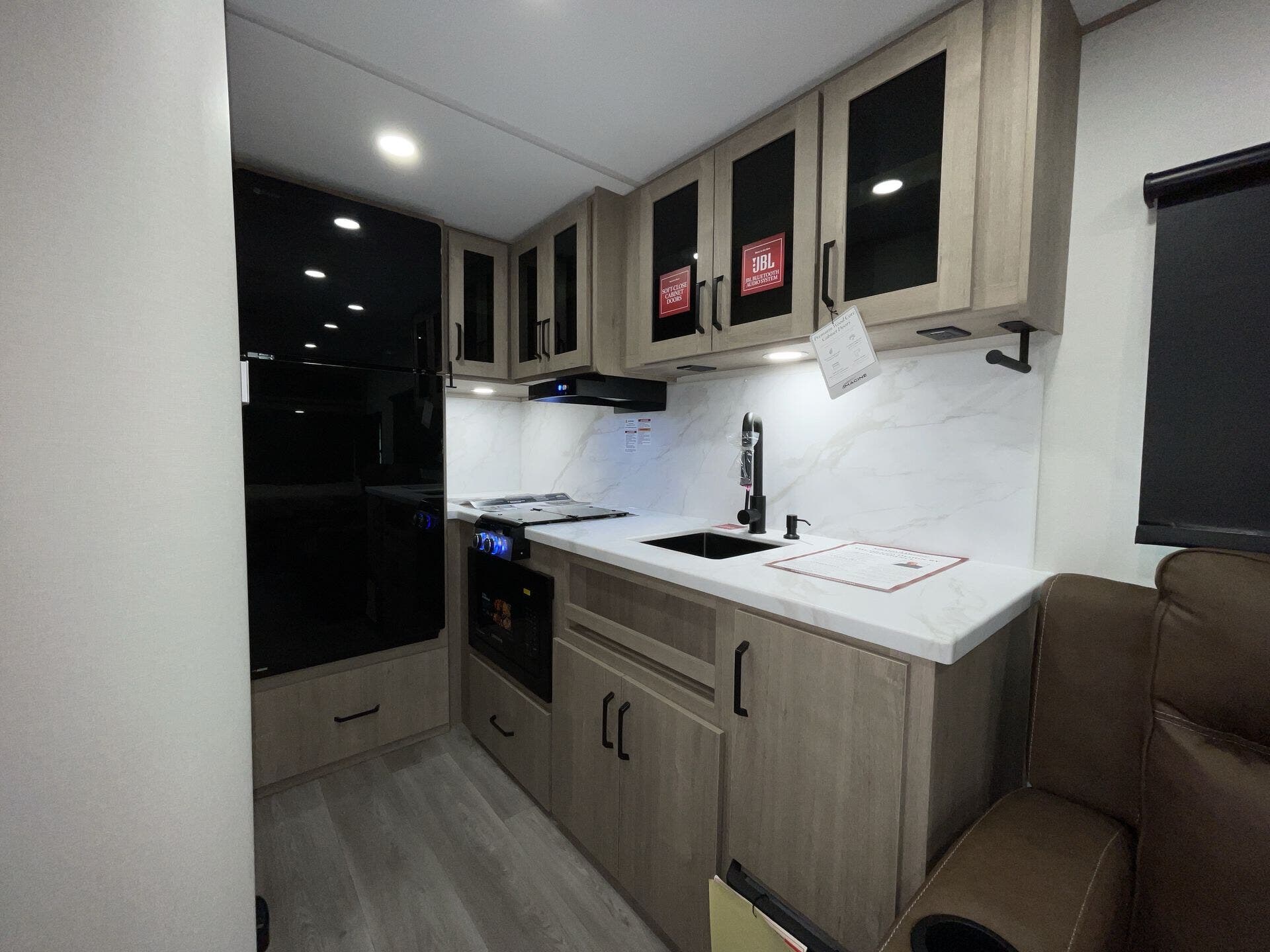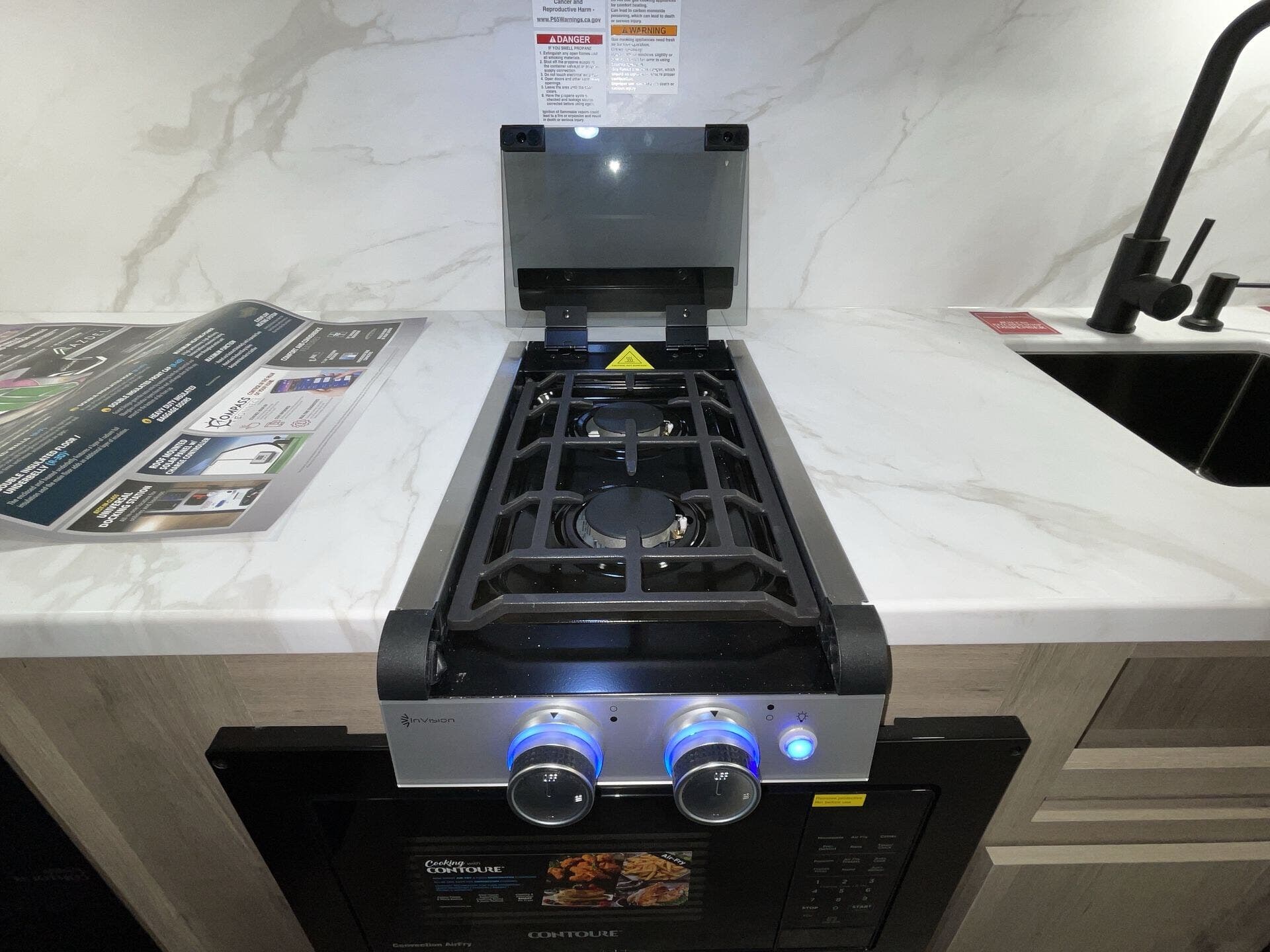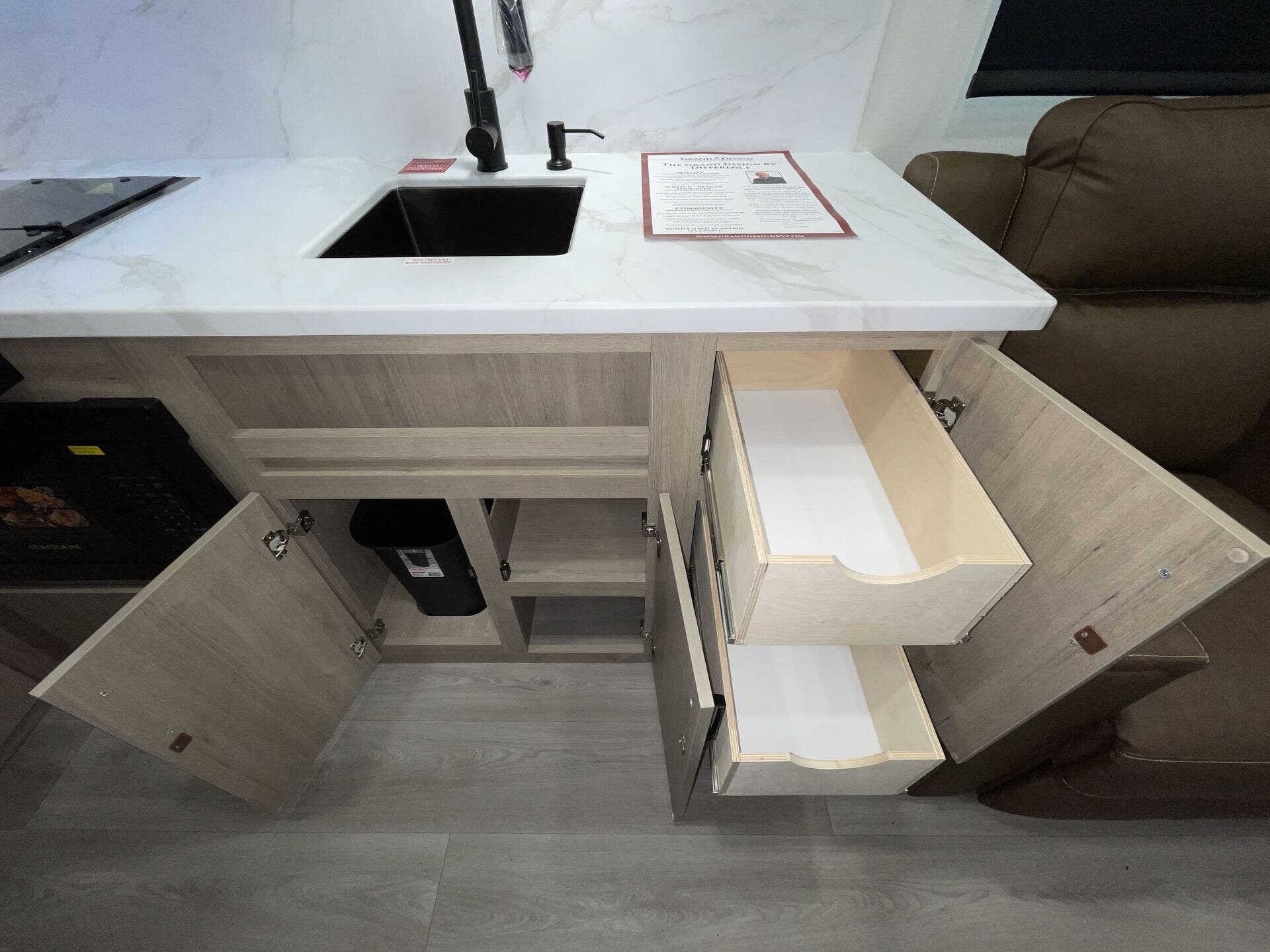 - Compact kitchen: 2-burner cooktop, convection microwave, 12V refrigerator