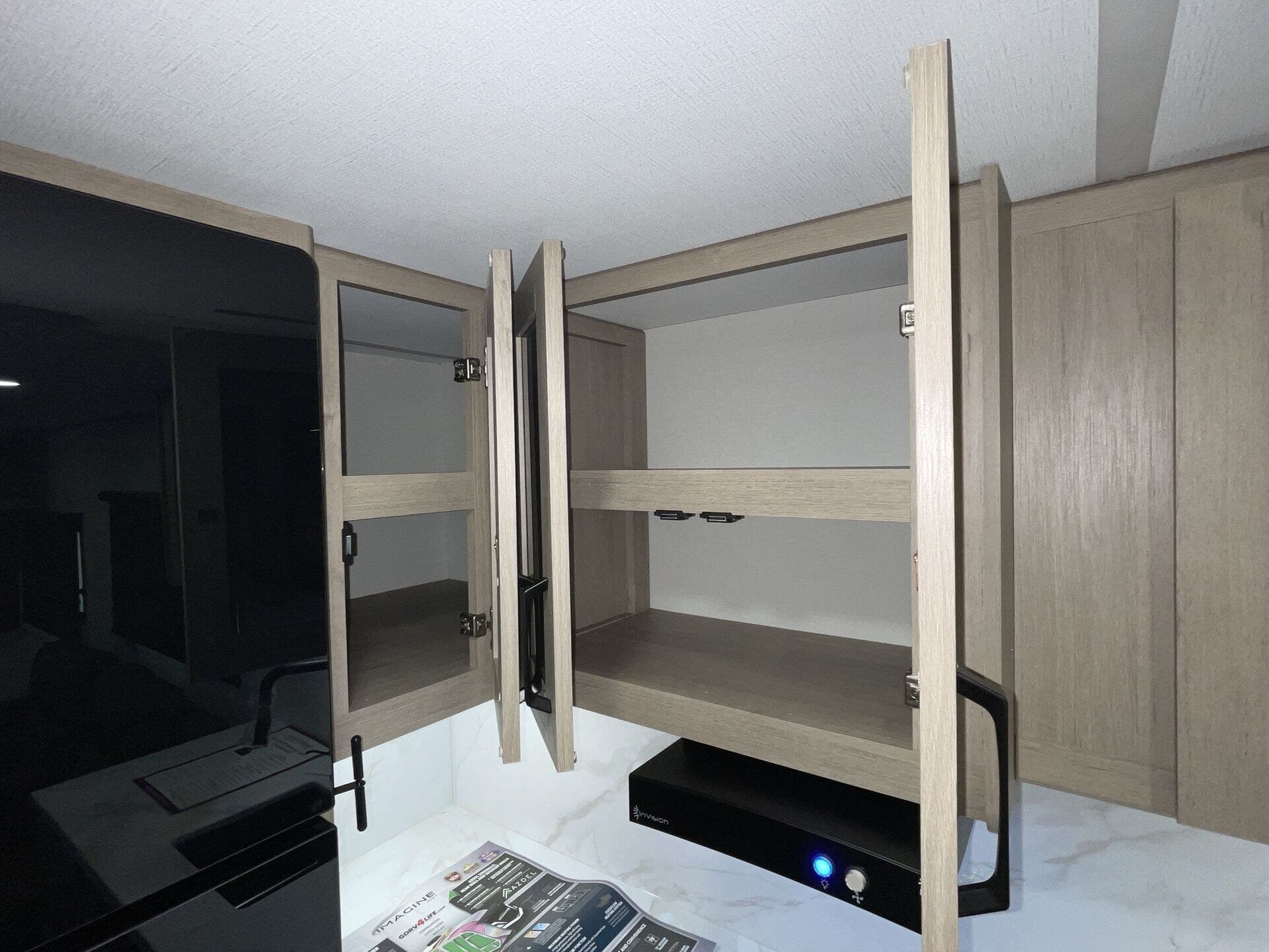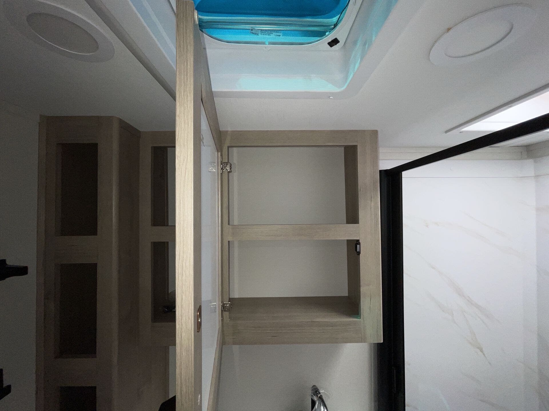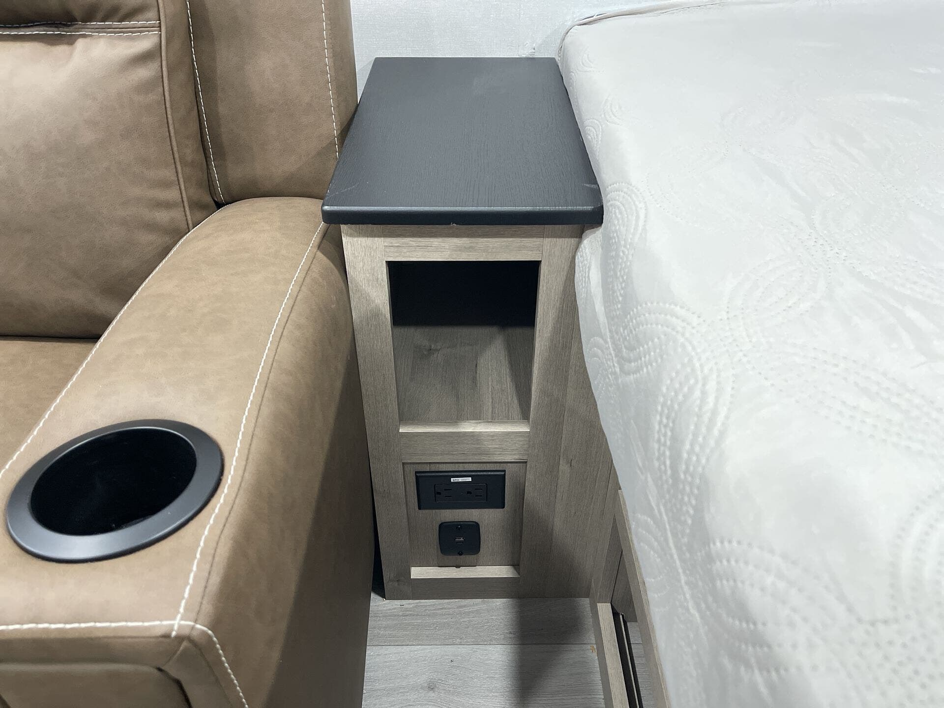 - Compact kitchen: 2-burner cooktop, convection microwave, 12V refrigerator