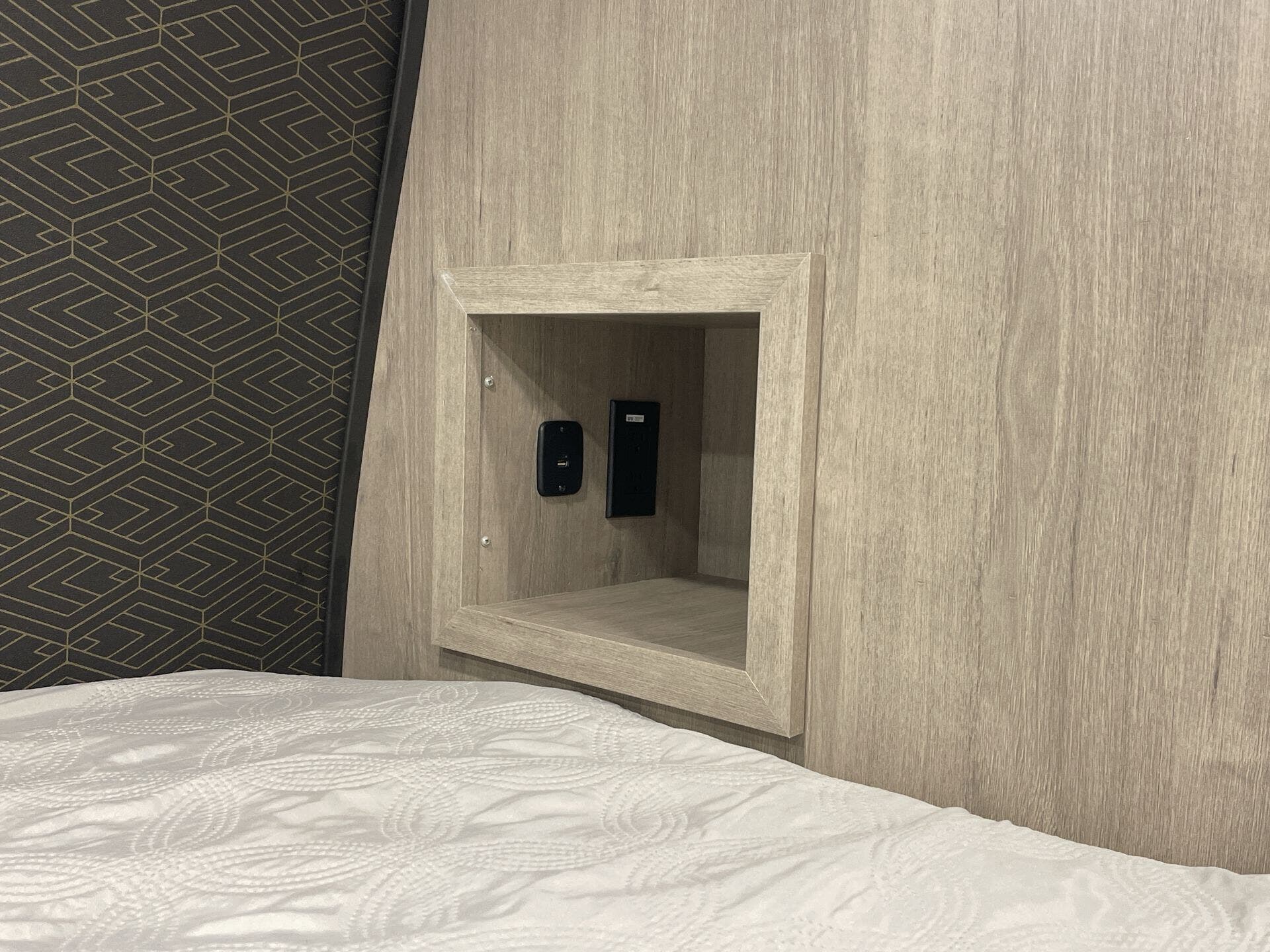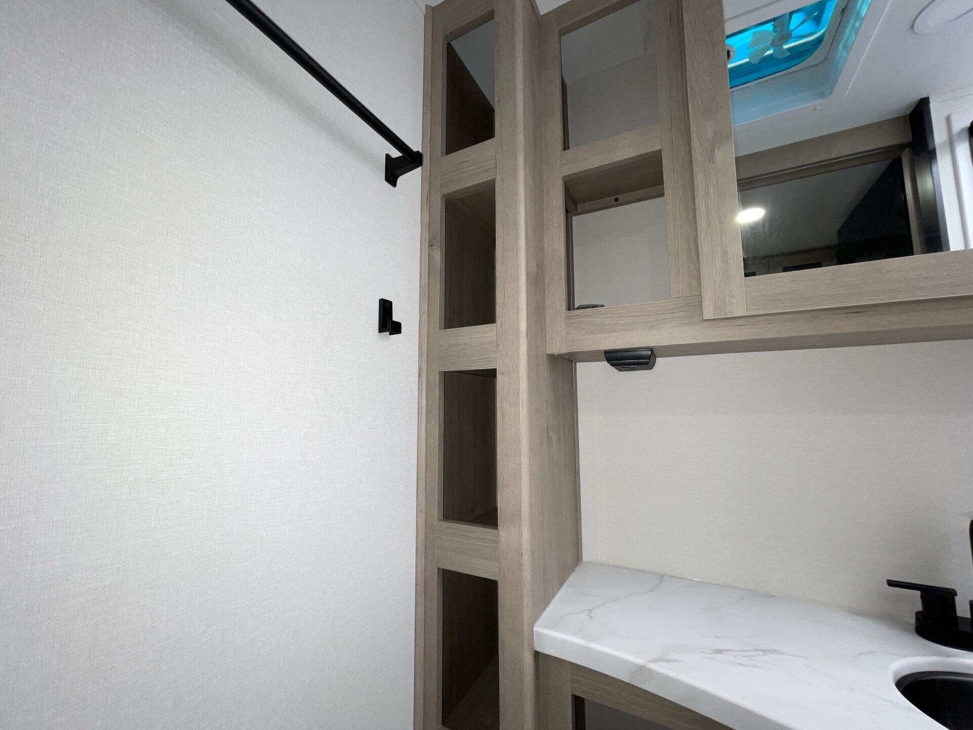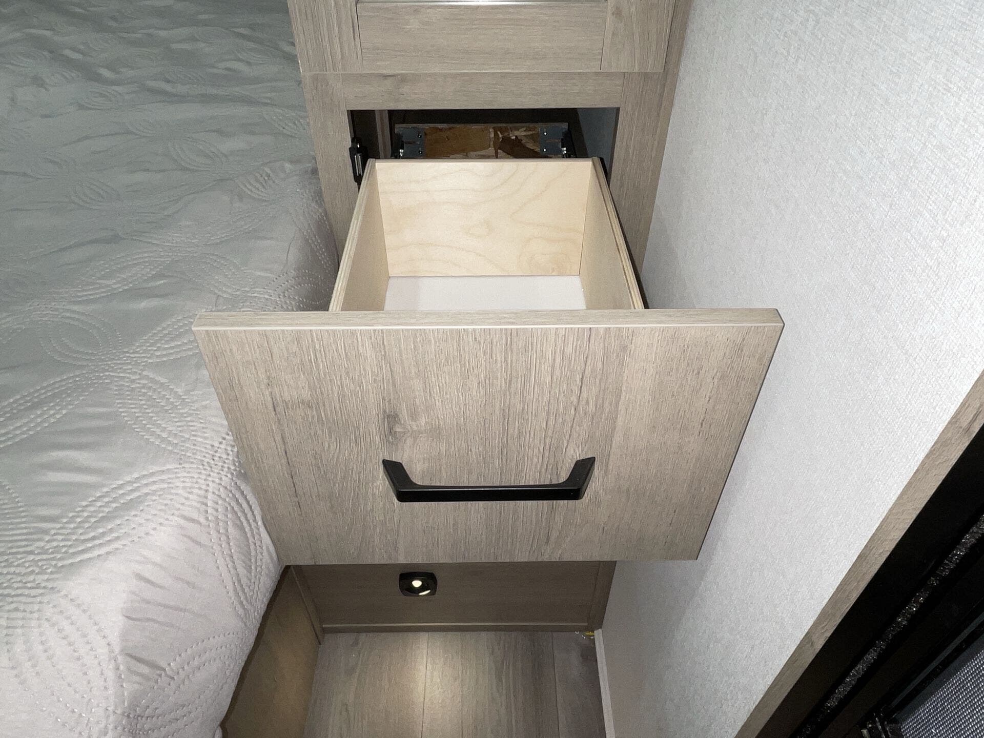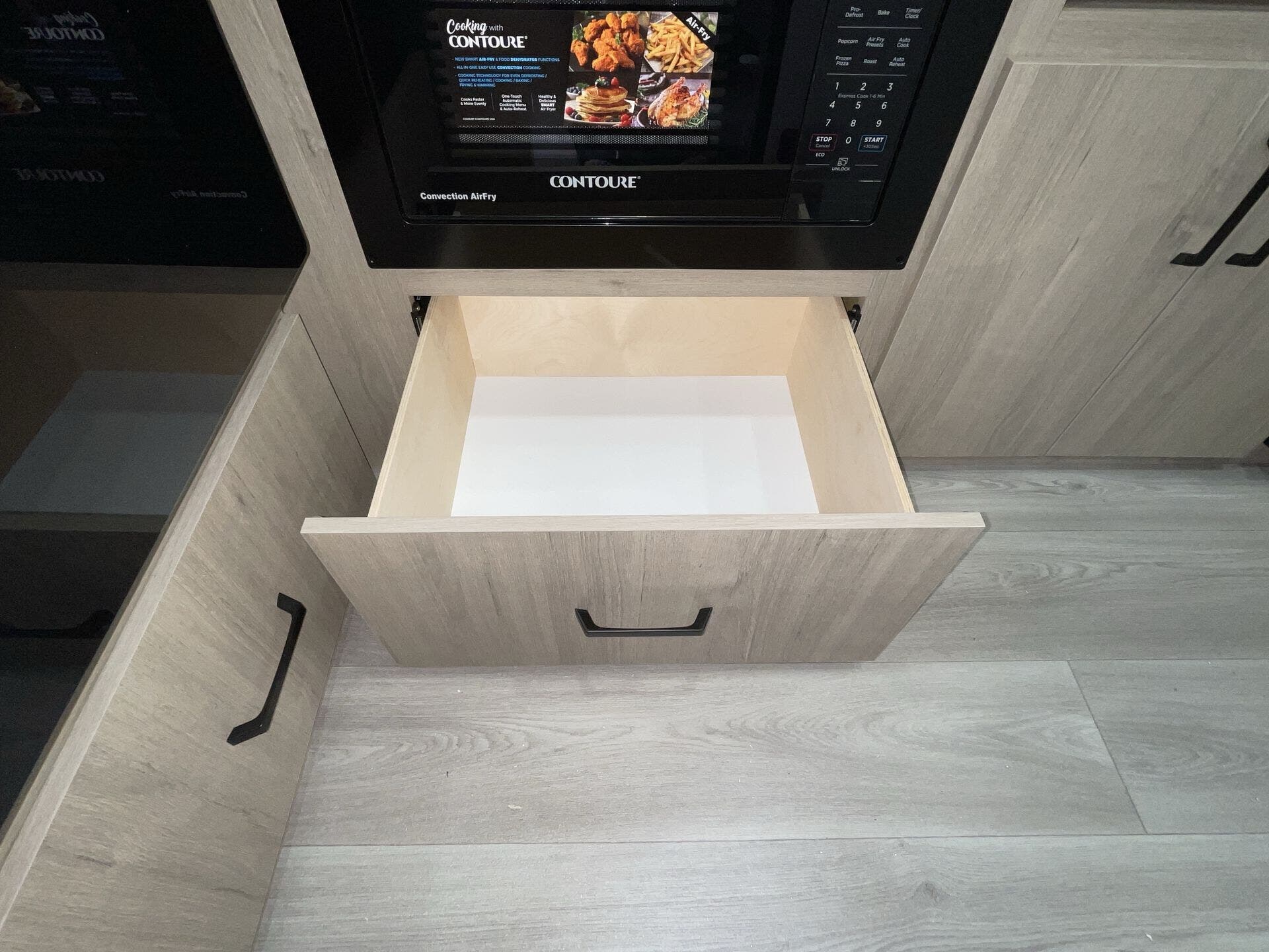 - Compact kitchen: 2-burner cooktop, convection microwave, 12V refrigerator