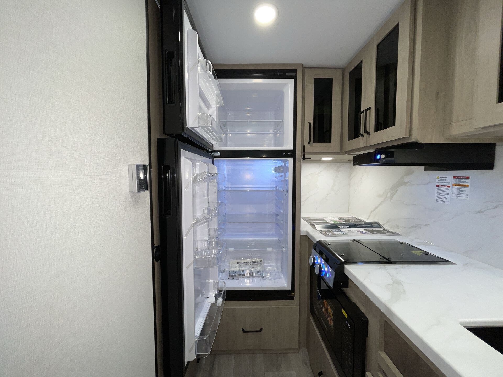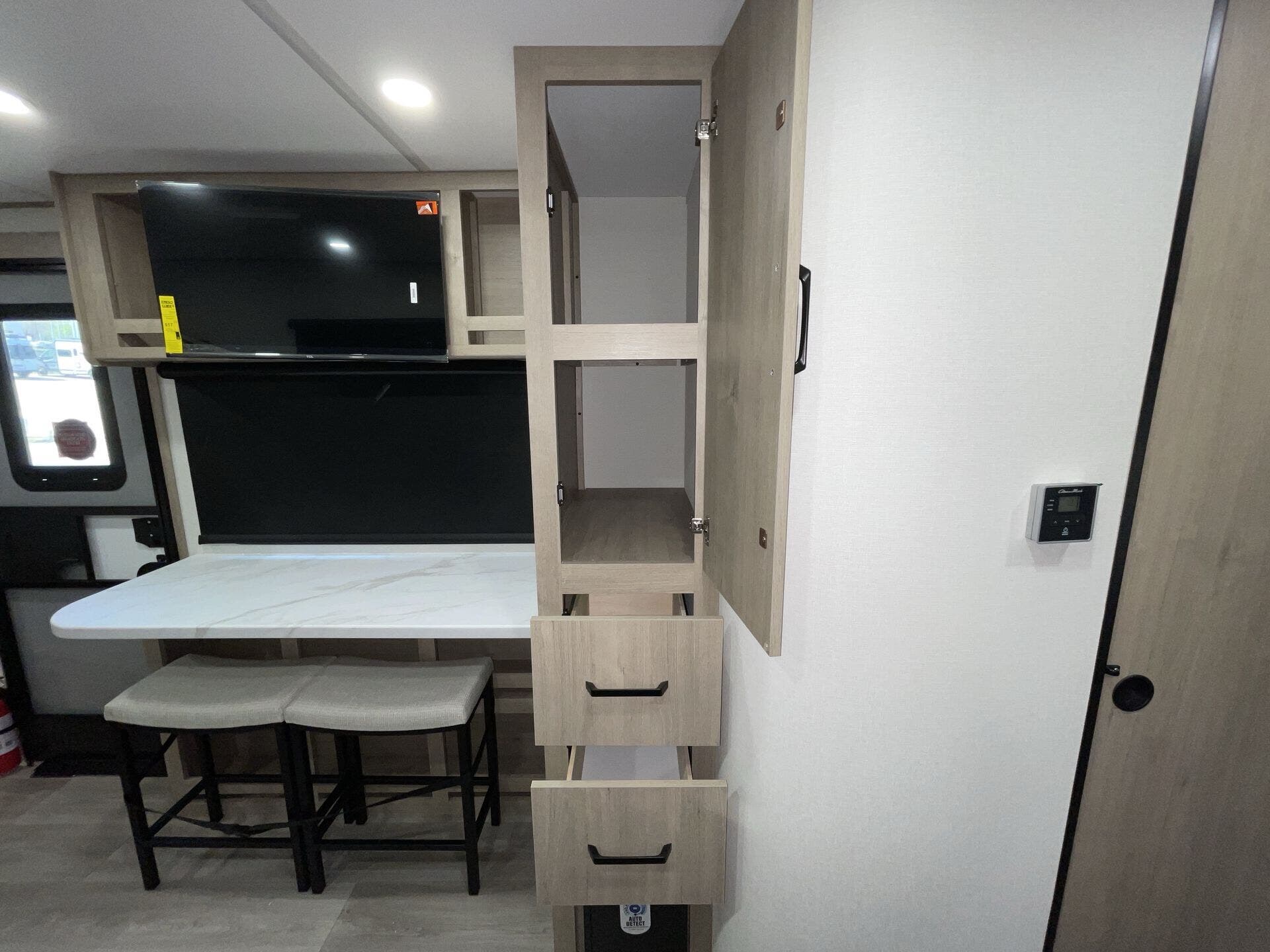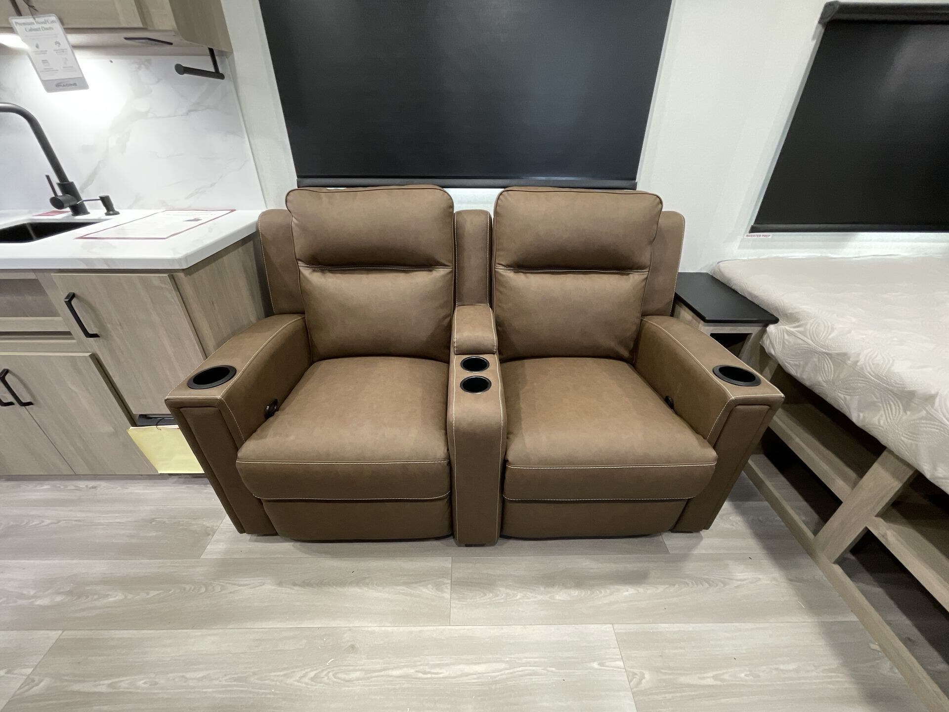 Inside, the open-concept layout is enhanced by a large panoramic window, creating a bright and inviting living space. The well-equipped kitchen features residential-style countertops, a two-burner cooktop, convection microwave, and a 12V refrigerator, making meal prep simple on the road.