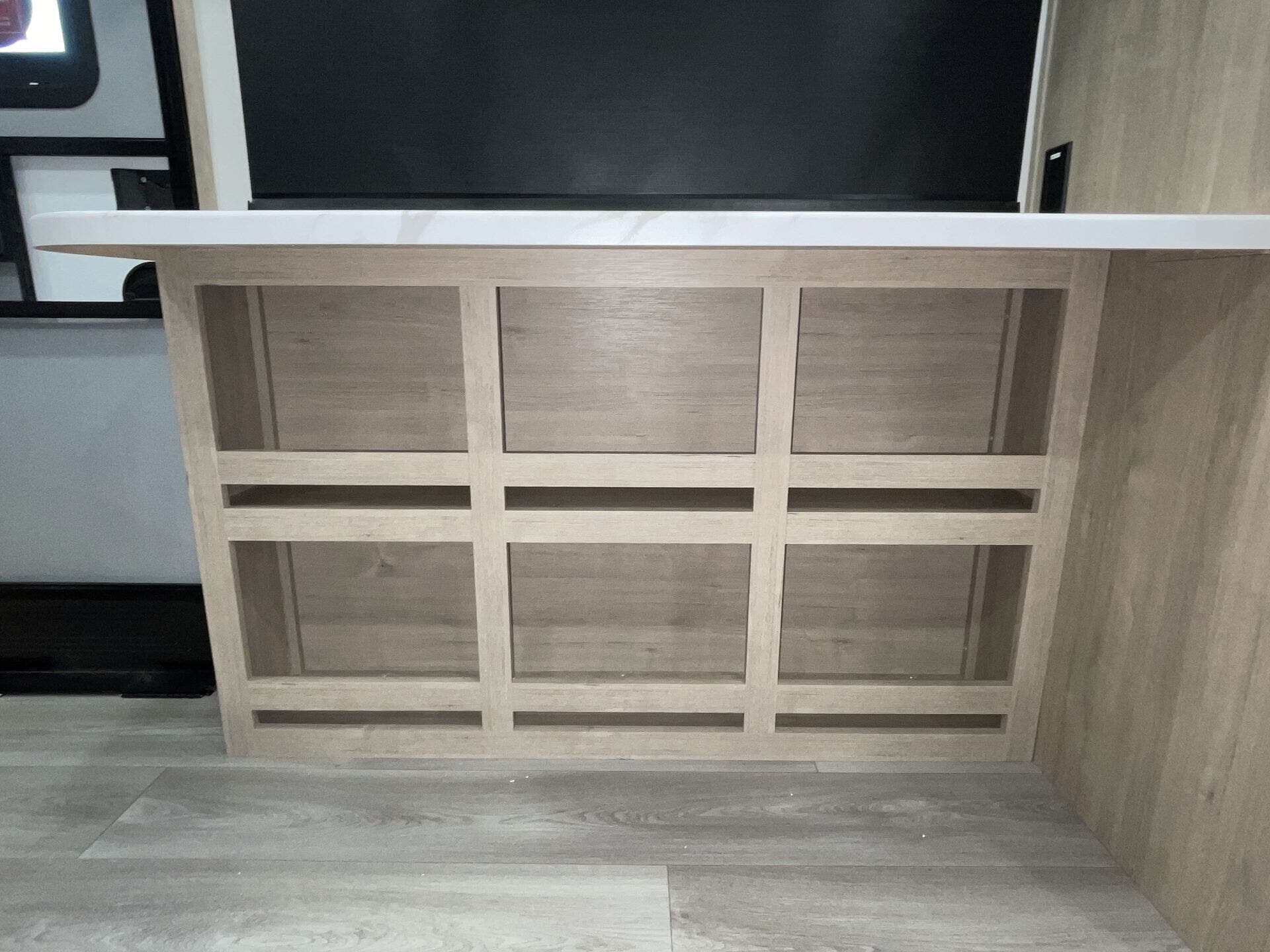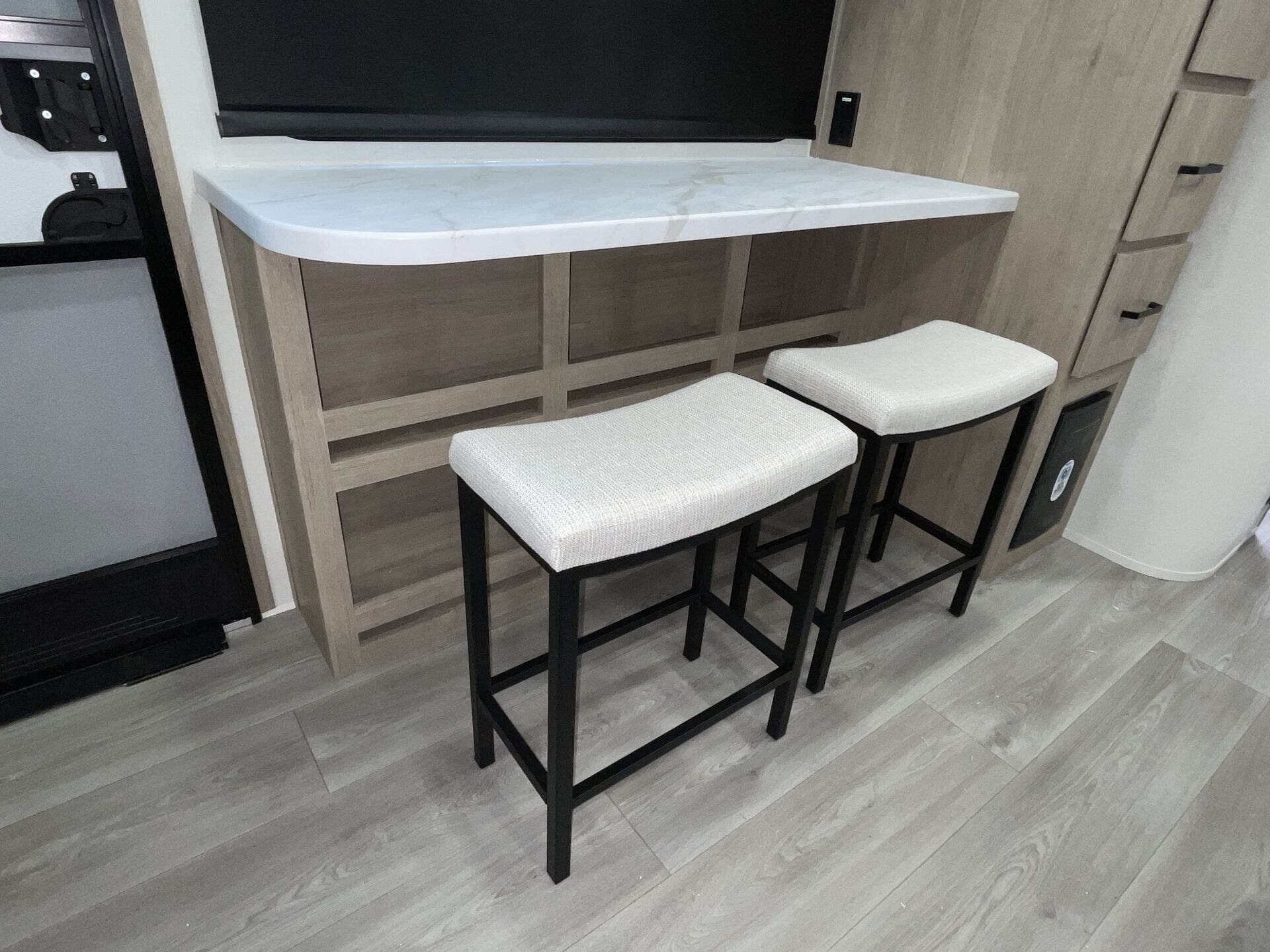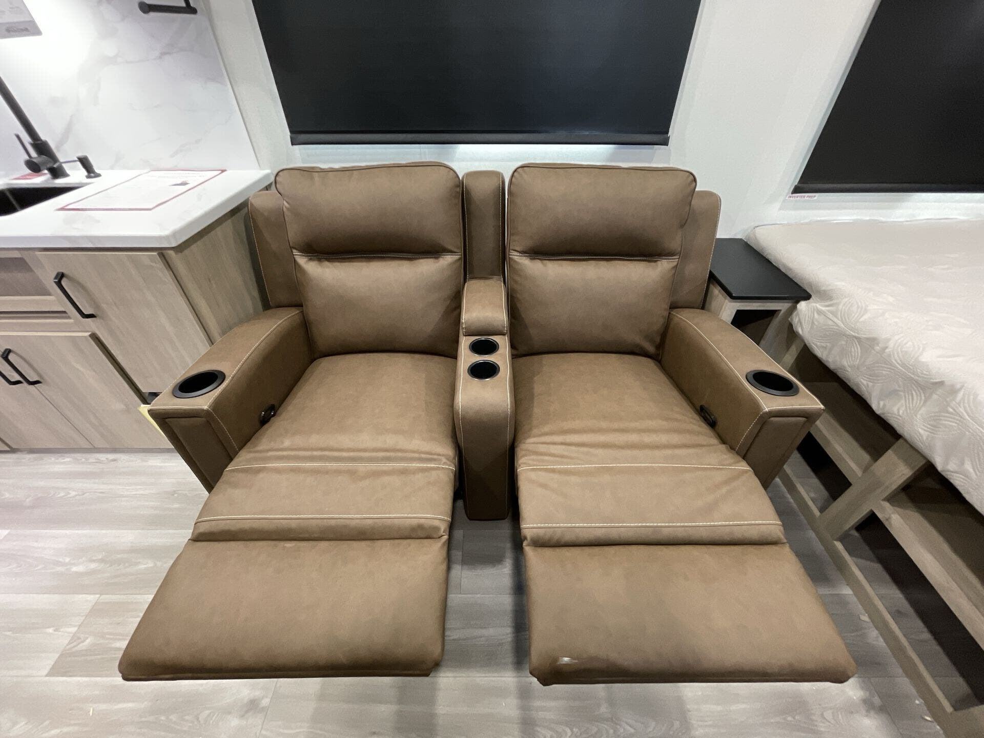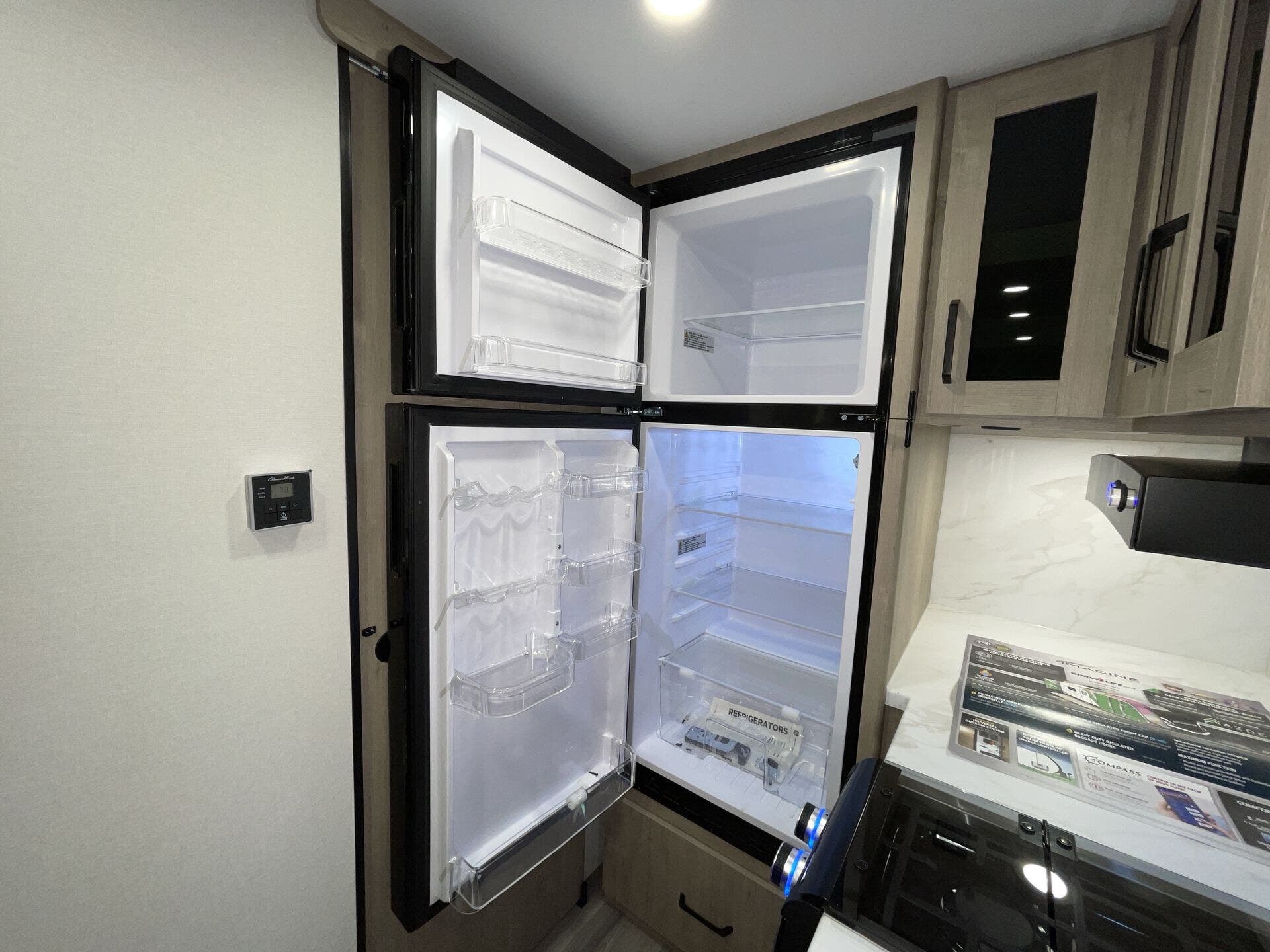 Inside, the open-concept layout is enhanced by a large panoramic window, creating a bright and inviting living space. The well-equipped kitchen features residential-style countertops, a two-burner cooktop, convection microwave, and a 12V refrigerator, making meal prep simple on the road.