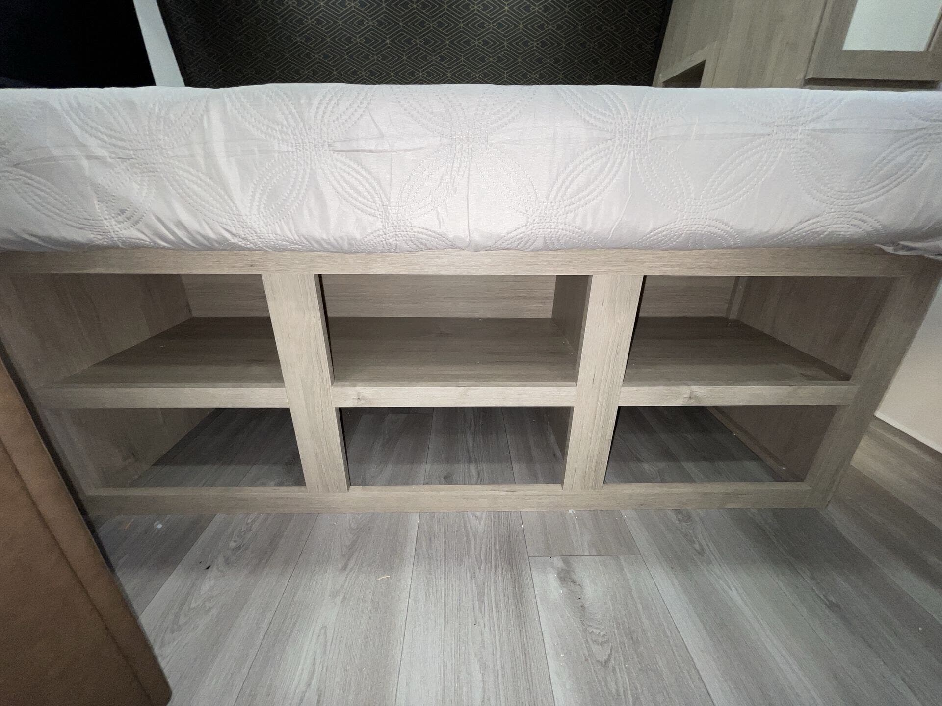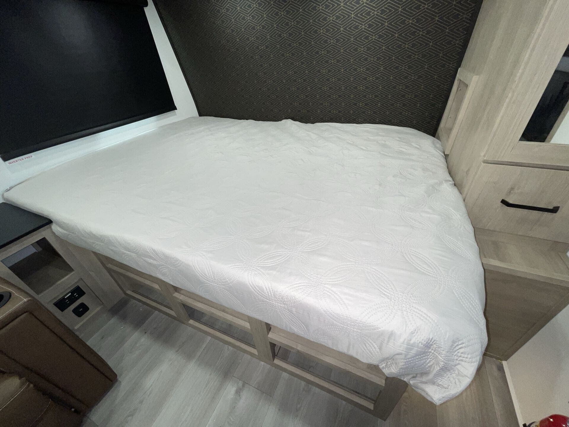 - Queen bed setup with comfortable sleeping space