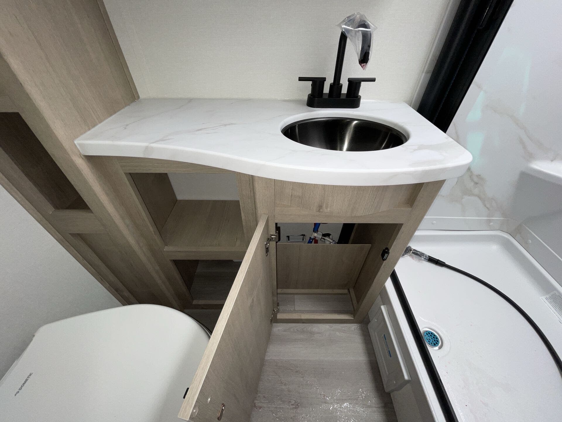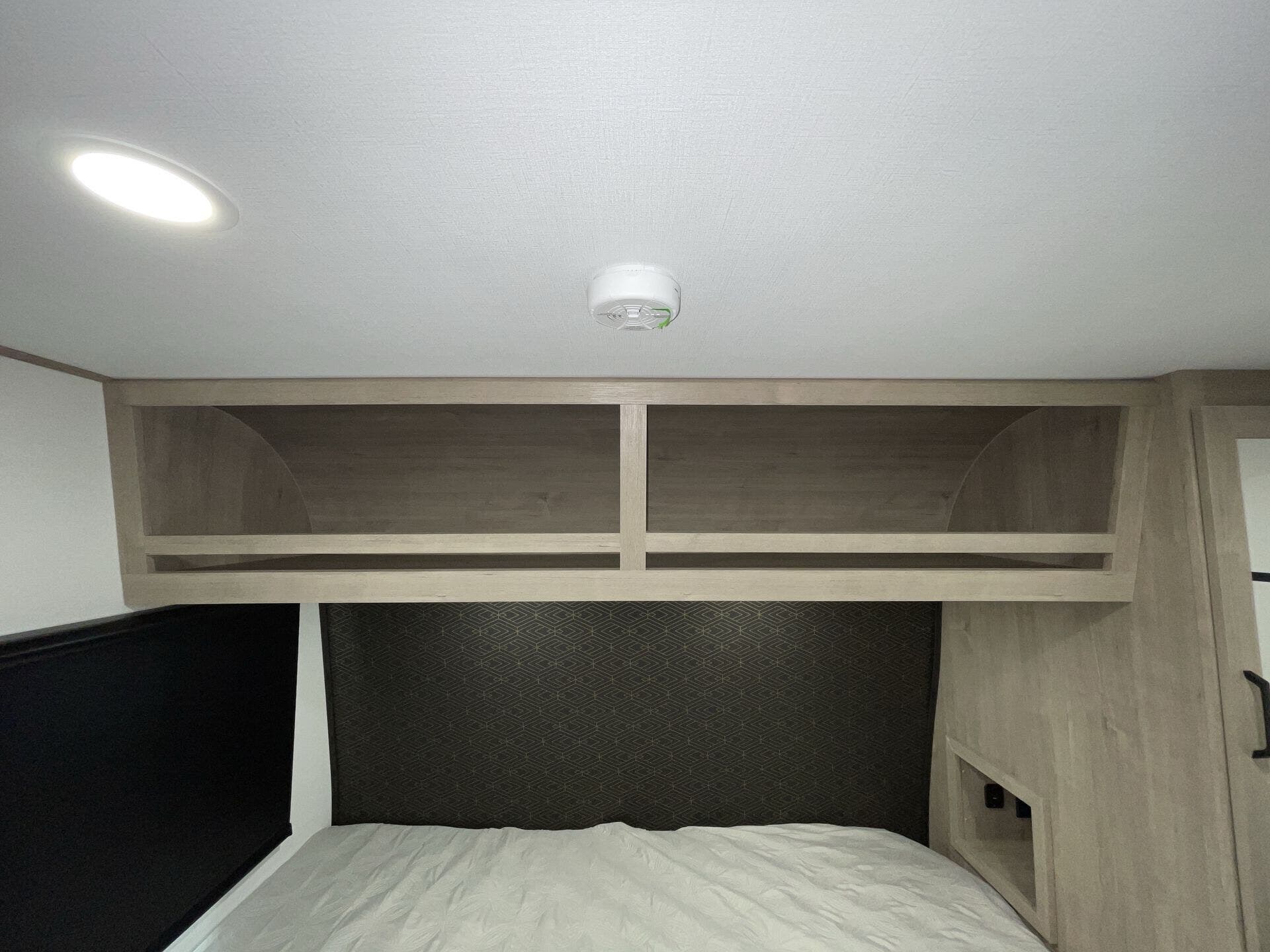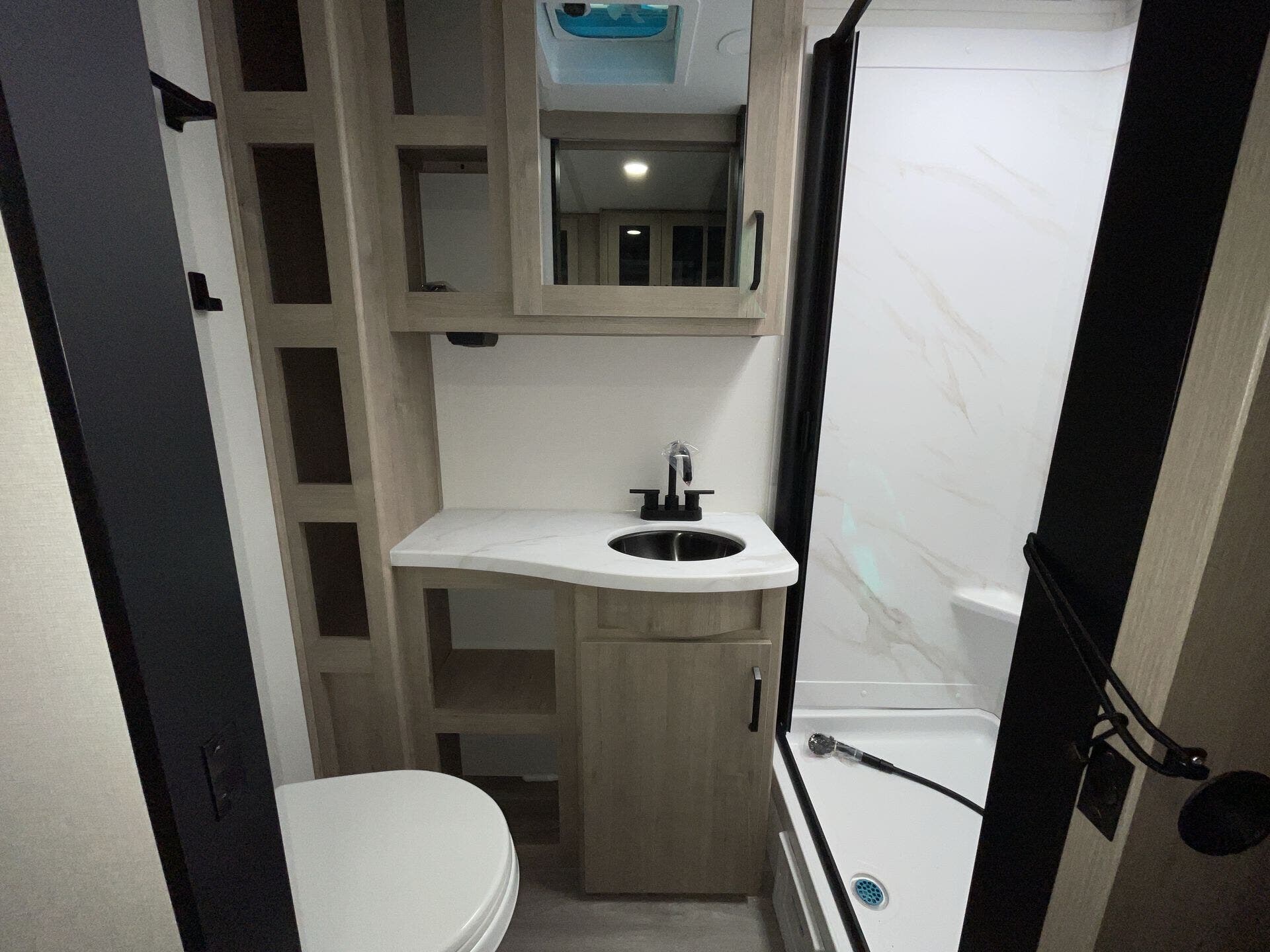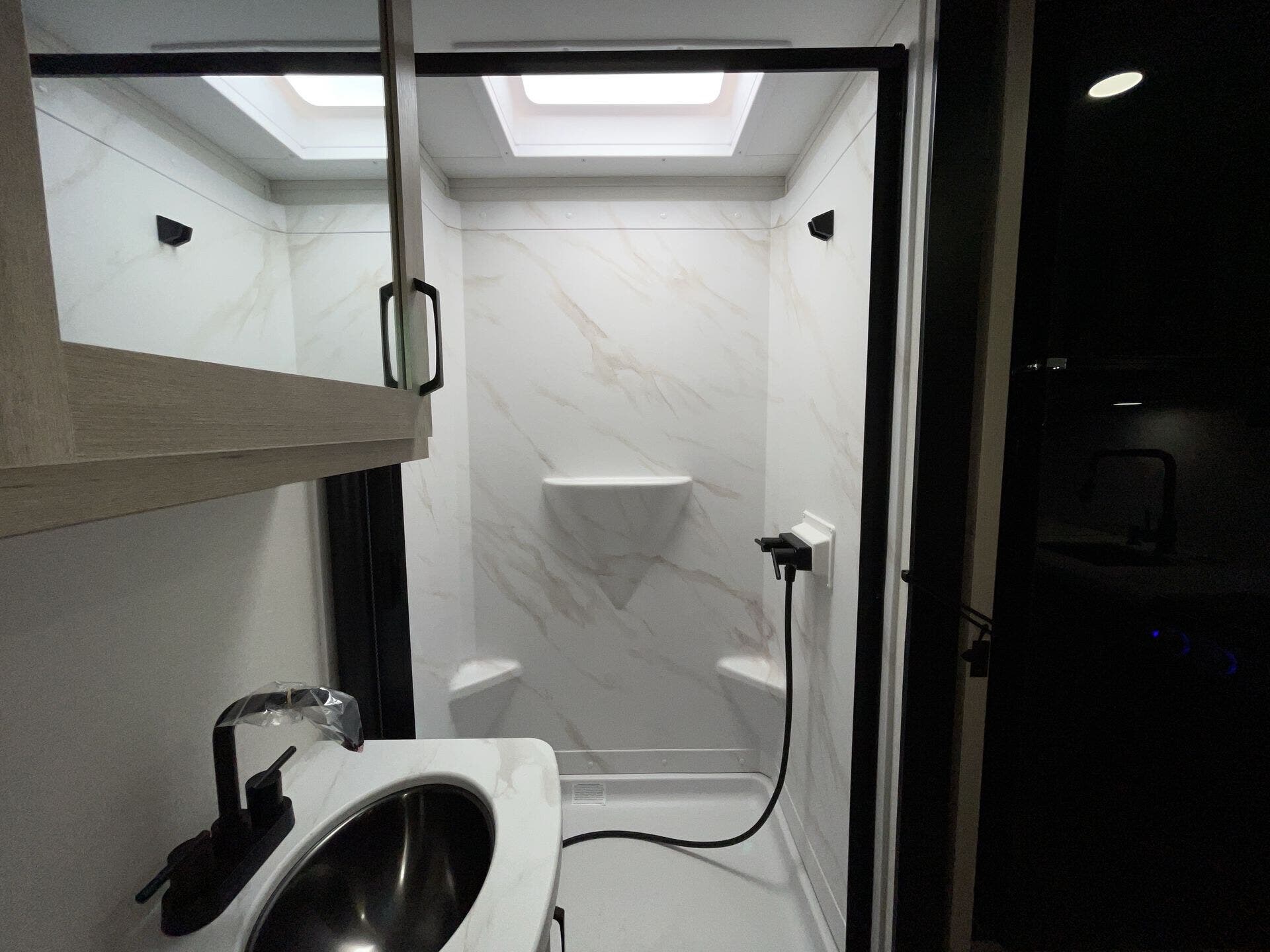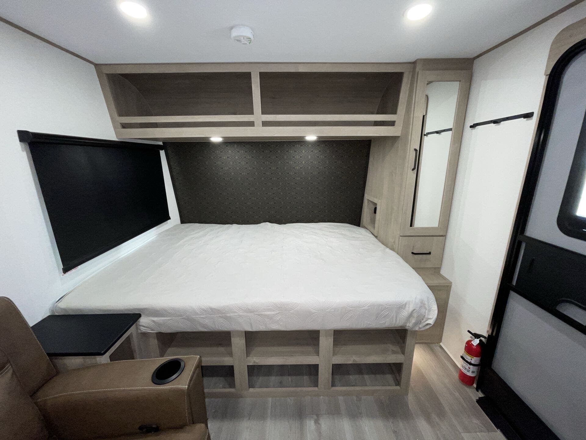 The comfortable sleeping area includes a queen bed, while the bathroom offers a walk-in shower and modern finishes. Built for versatility, this unit includes a 200W solar package, tankless water heater, and heated underbelly for extended-season use.