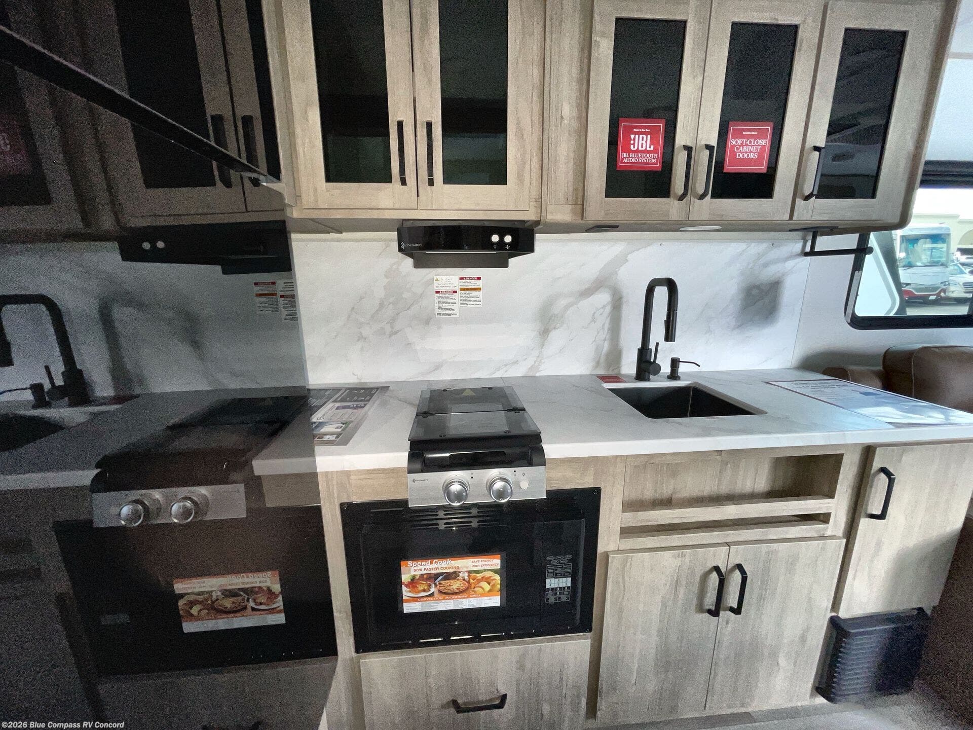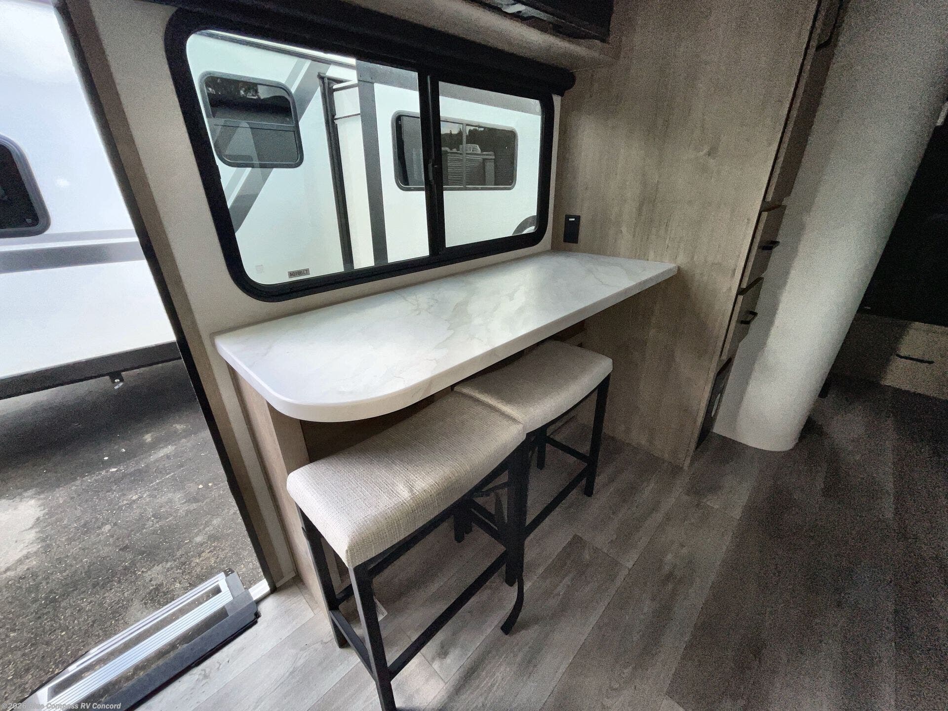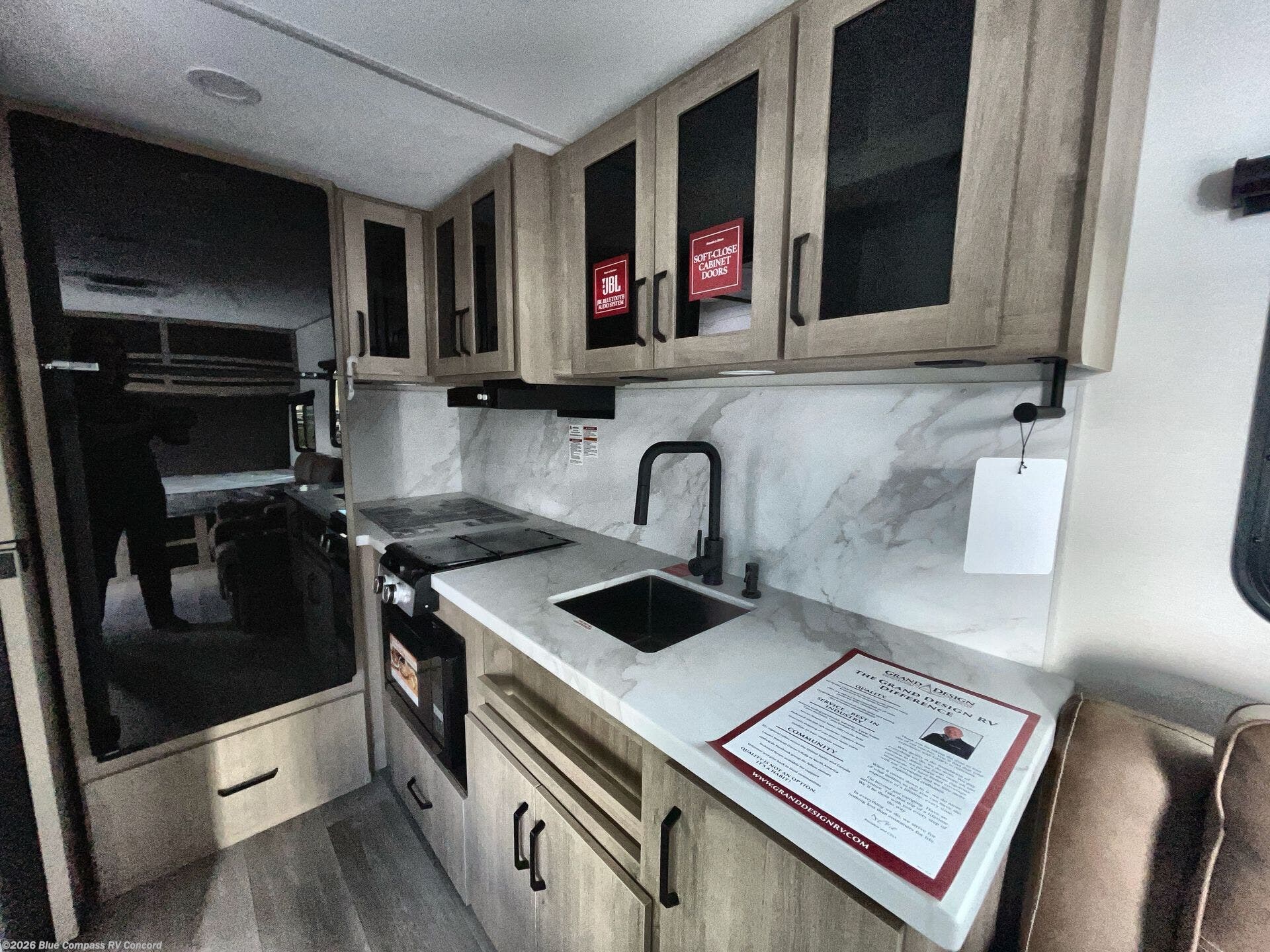 Pack your bags and head out on a fun camping trip in this travel trailer! The front queen bed offers a comfortable place to sleep at after taking off your footwear and place them in the shoe storage. You can make meals on the cooktop or in the convection microwave. The full rear corner bathroom has a walk-in shower with an oversized vanity to easily get ready each day. Outside, you'll find a spray port, an unobstructed pass-thru storage, and an interior/exterior table to use at your convenience.