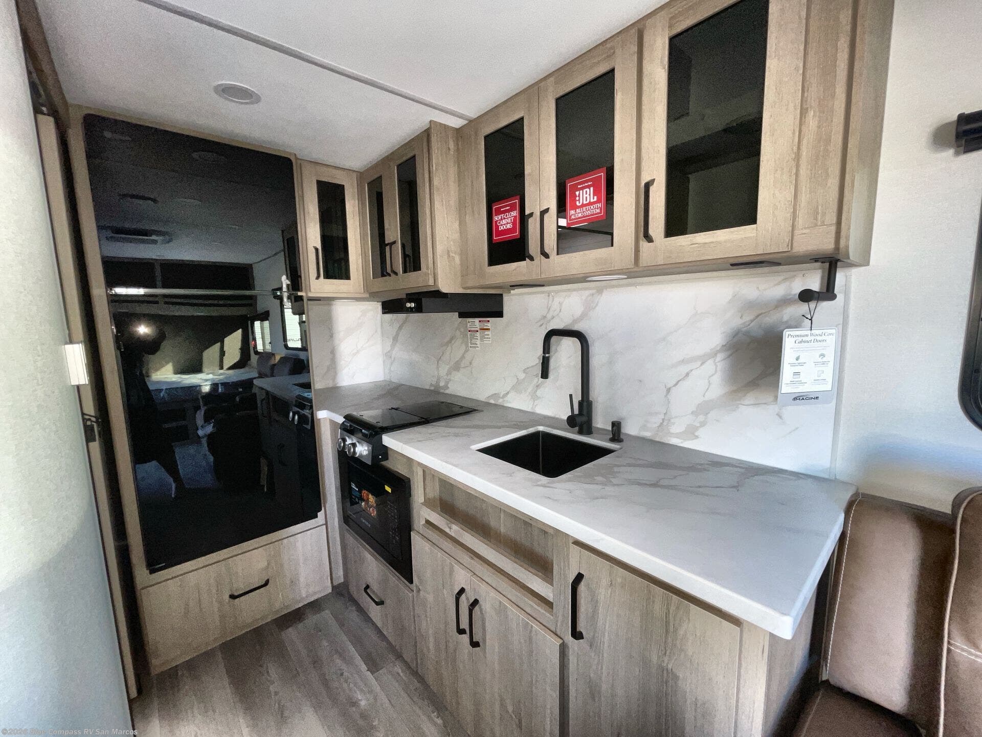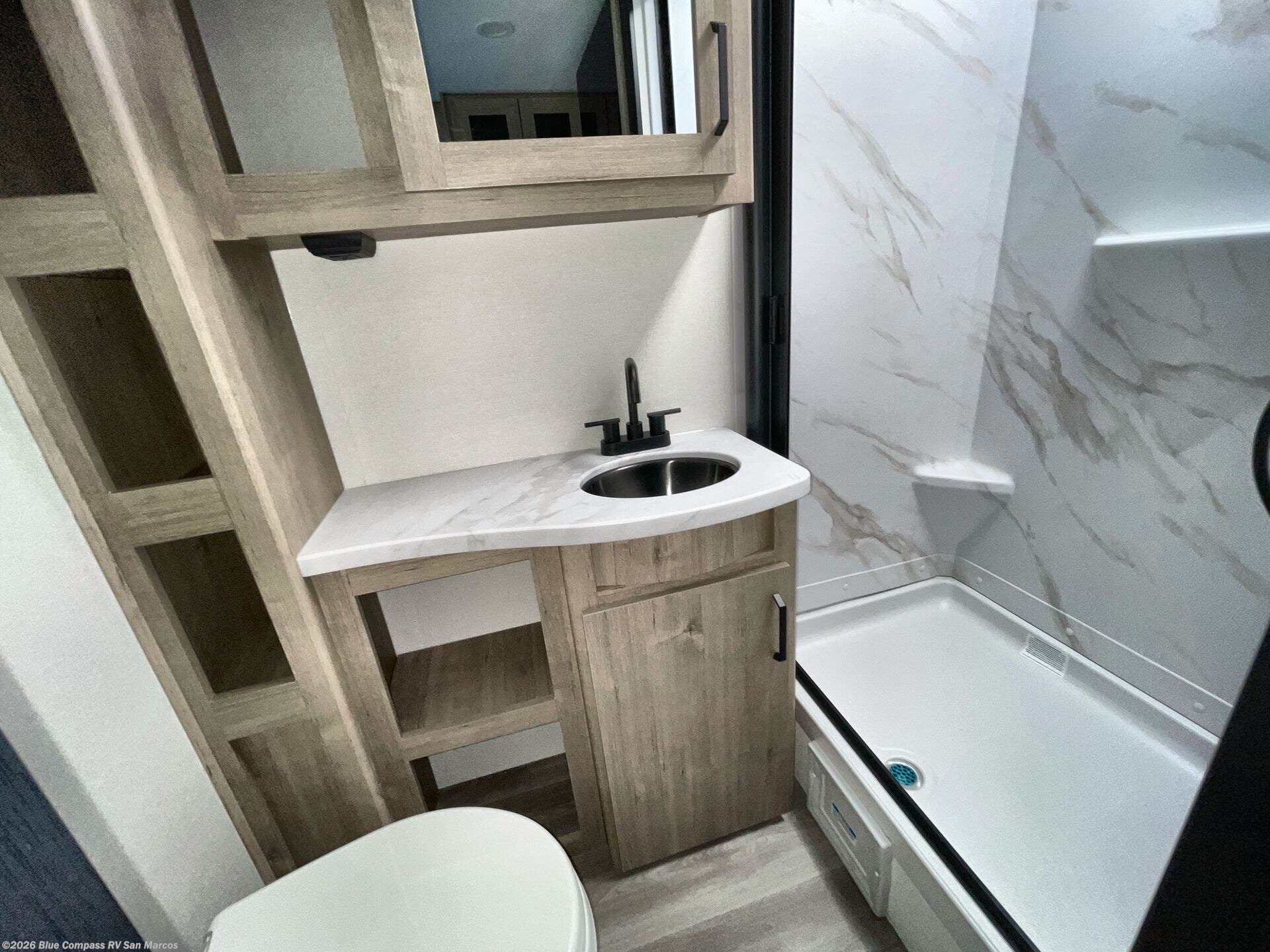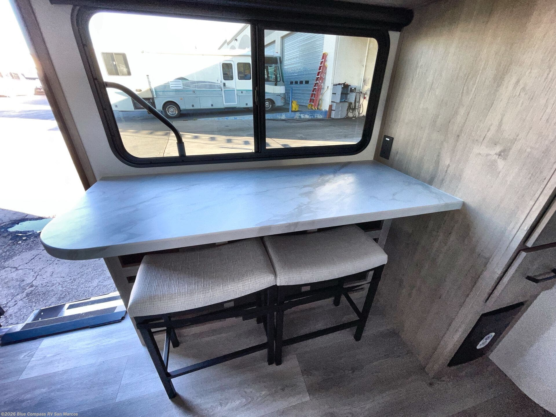 Pack your bags and head out on a fun camping trip in this travel trailer! The front queen bed offers a comfortable place to sleep at after taking off your footwear and place them in the shoe storage. You can make meals on the cooktop or in the convection microwave. The full rear corner bathroom has a walk-in shower with an oversized vanity to easily get ready each day. Outside, you'll find a spray port, an unobstructed pass-thru storage, and an interior/exterior table to use at your convenience.
