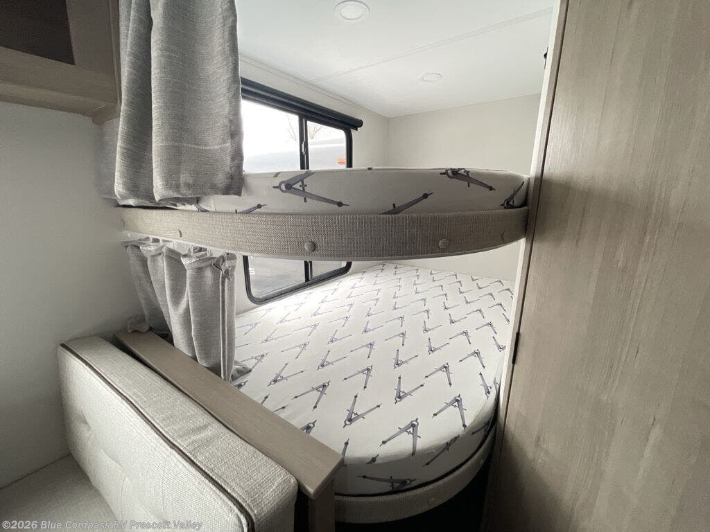 Ideal for weekend trips or longer adventures. Its layout is designed to sleep everyone comfortably while keeping the living space open and easy to move around. In the rear, the double-size bunks give kids or guests plenty of room to stretch out, the pull-out drawers keep the kitchen neatly organized. Up front, the queen bed provides a comfortable retreat for parents, offering a quiet place to unwind at the end of the day. In the main living area, you can personalize the space by choosing between theater seating or optional booth dinette, letting you decide whether your trips lean more toward shared meals or laid-back lounging. With thoughtful storage and a layout that maximizes every inch.