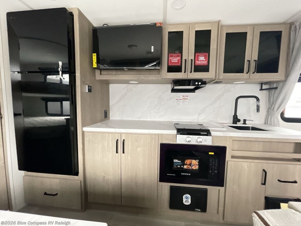 Ideal for weekend trips or longer adventures. Its layout is designed to sleep everyone comfortably while keeping the living space open and easy to move around. In the rear, the double-size bunks give kids or guests plenty of room to stretch out, the pull-out drawers keep the kitchen neatly organized. Up front, the queen bed provides a comfortable retreat for parents, offering a quiet place to unwind at the end of the day. In the main living area, you can personalize the space by choosing between theater seating or optional booth dinette, letting you decide whether your trips lean more toward shared meals or laid-back lounging. With thoughtful storage and a layout that maximizes every inch.
