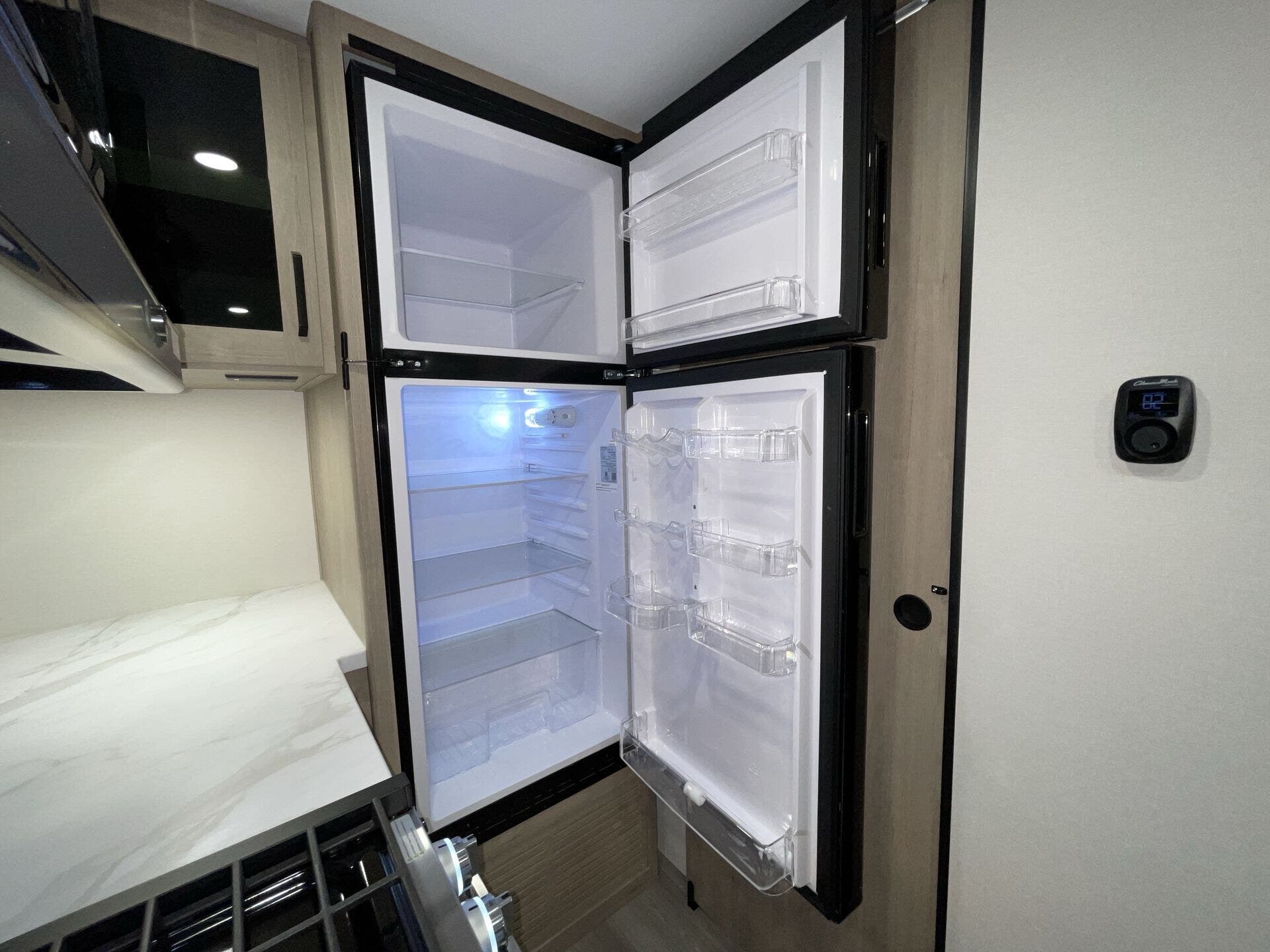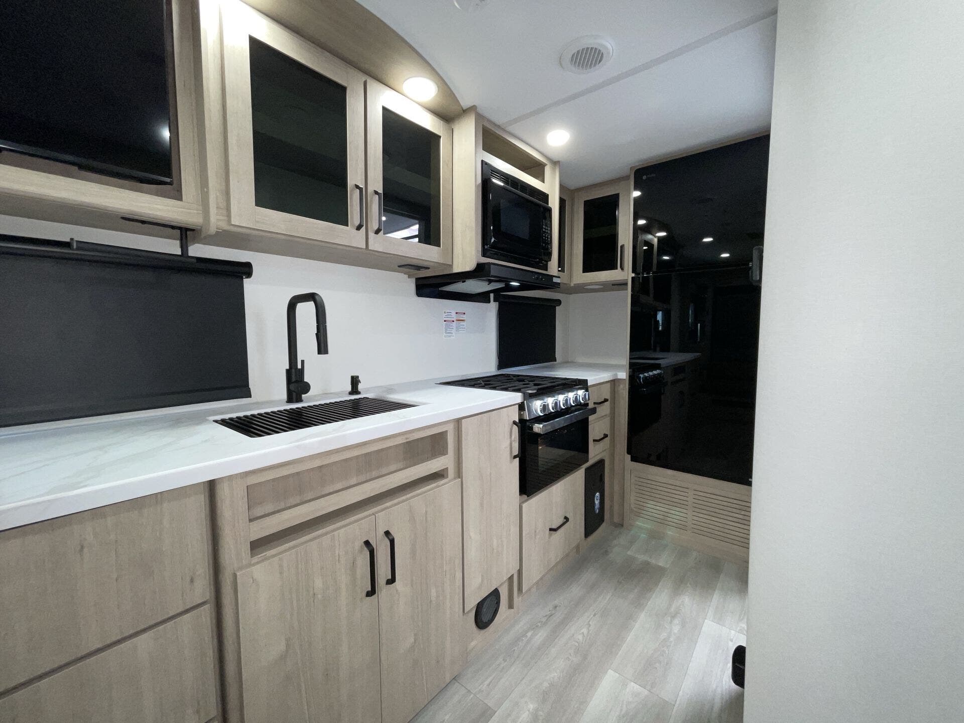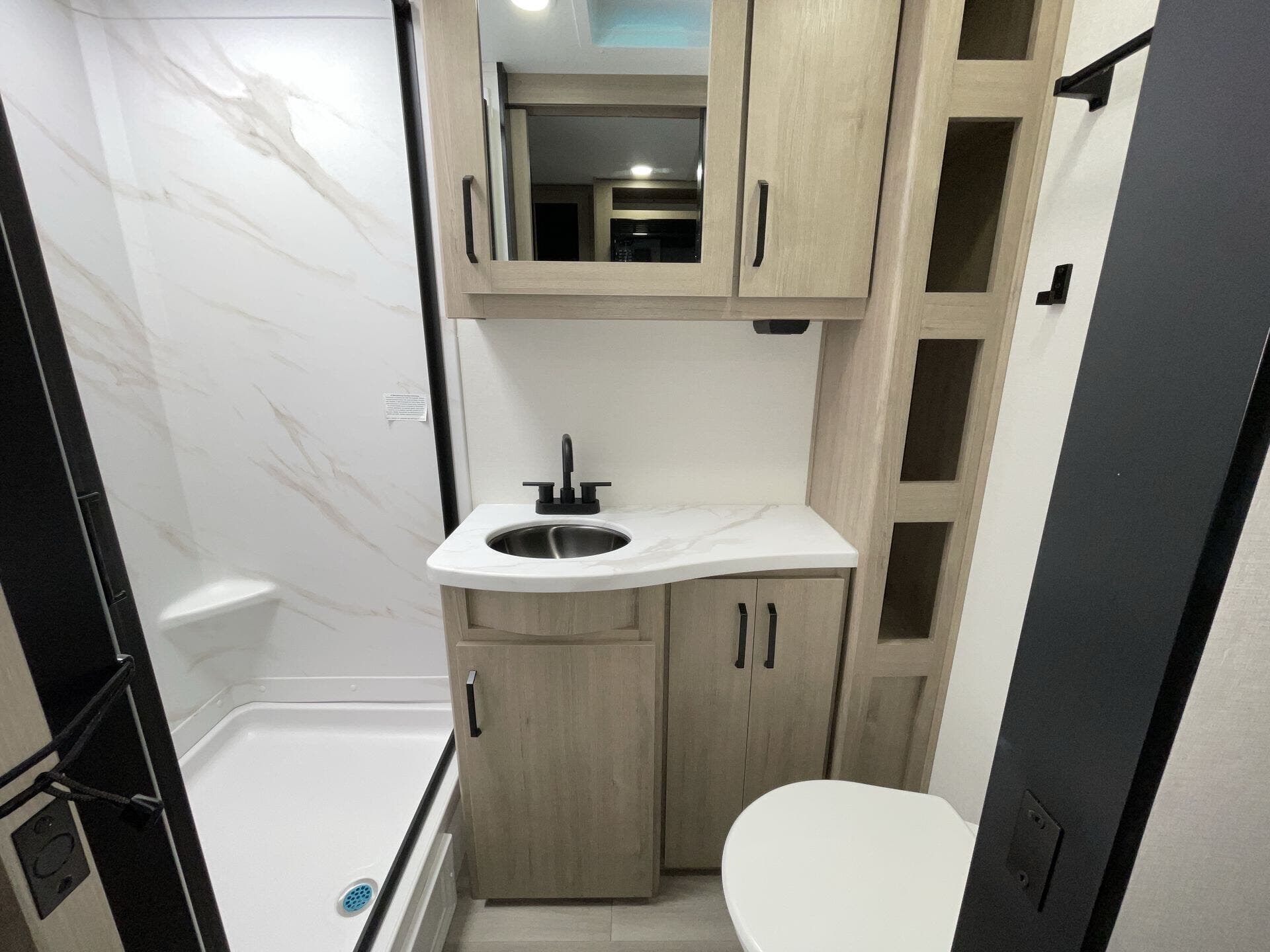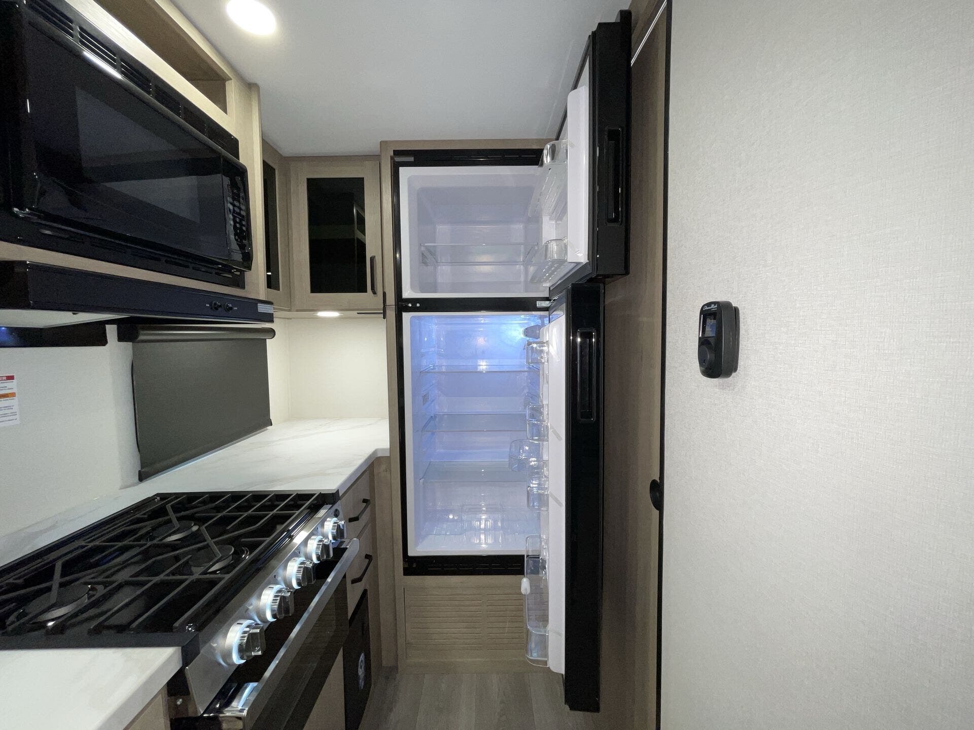 The kitchen is fully equipped for life on the road, featuring modern appliances, generous counter space, and a 10 cu. ft. refrigerator. The rear bathroom offers a roomy shower and added storage—rare for a trailer this size.