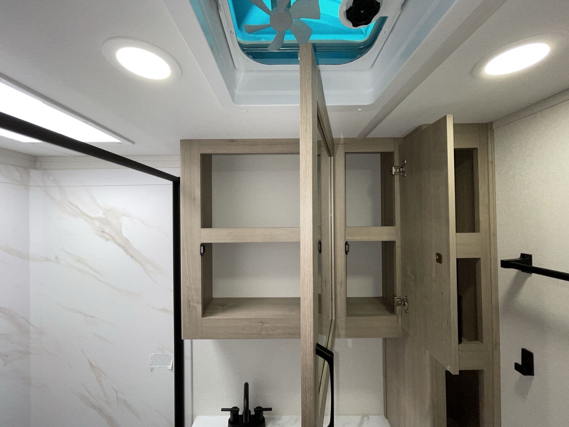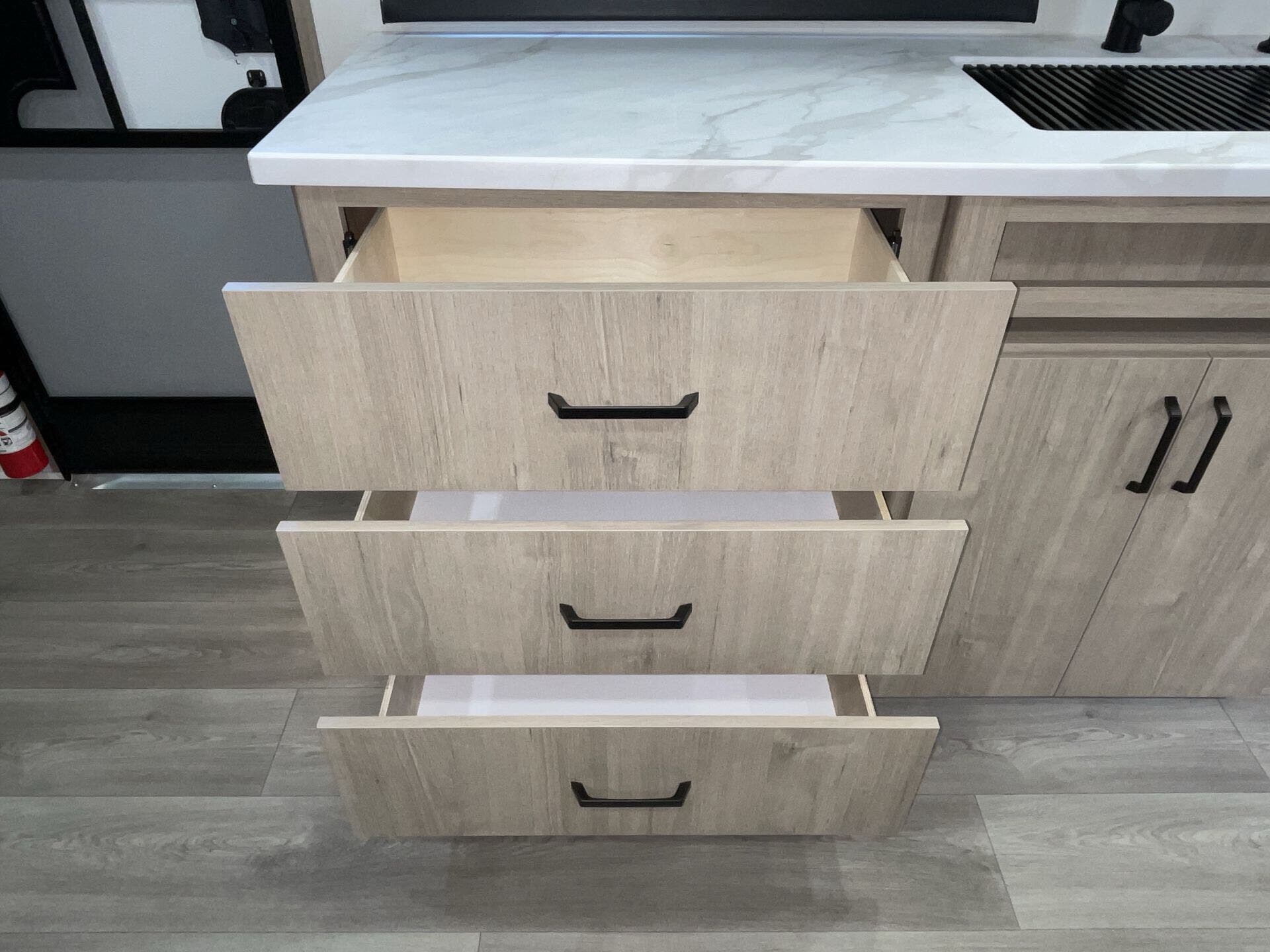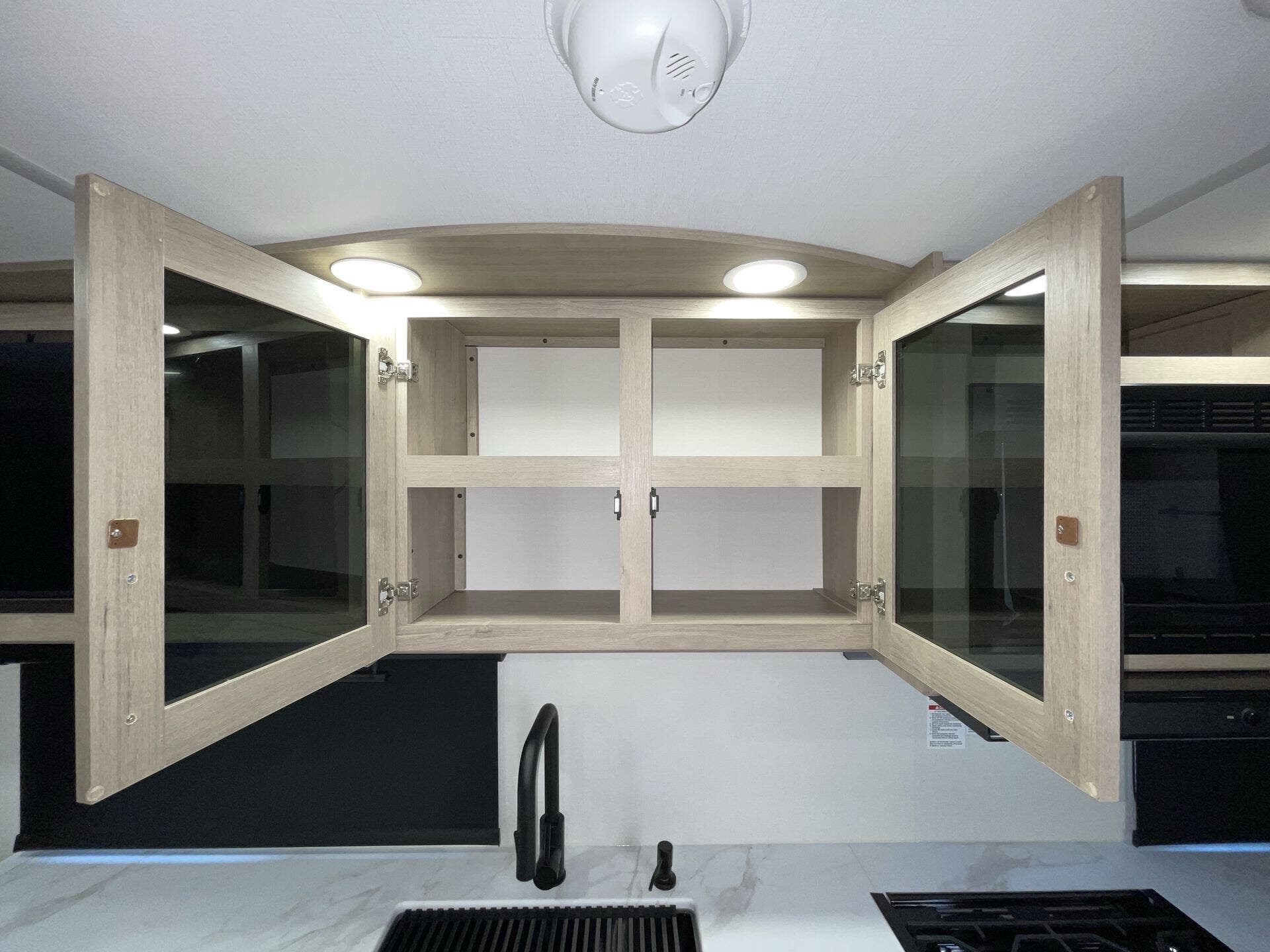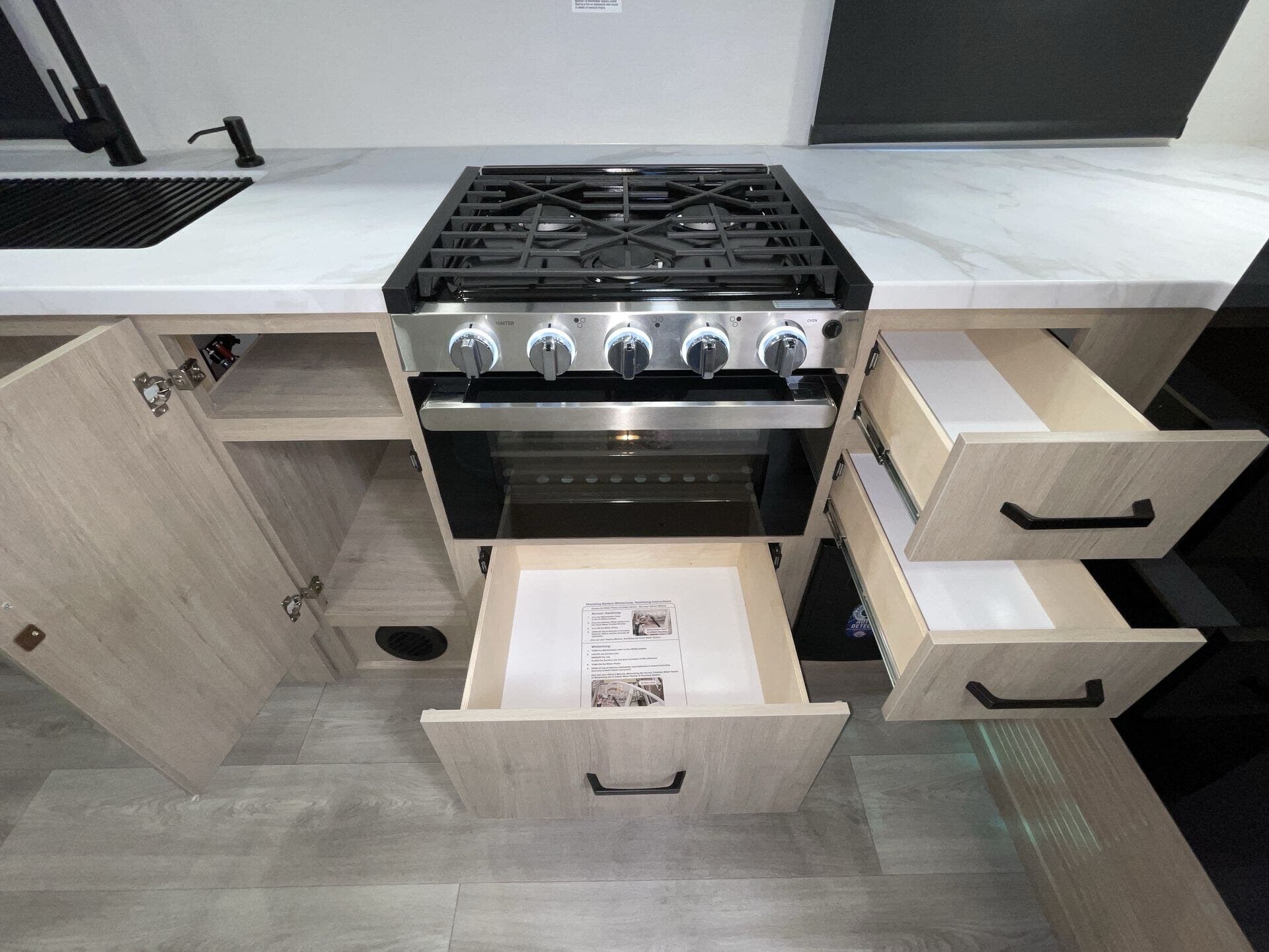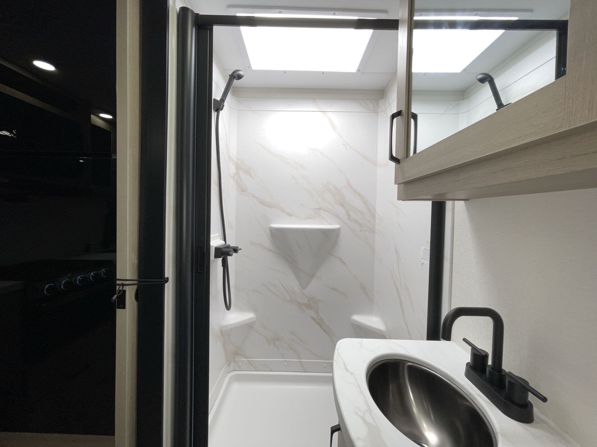 The kitchen is fully equipped for life on the road, featuring modern appliances, generous counter space, and a 10 cu. ft. refrigerator. The rear bathroom offers a roomy shower and added storage—rare for a trailer this size.
