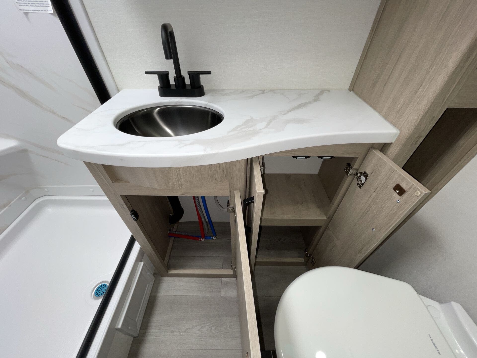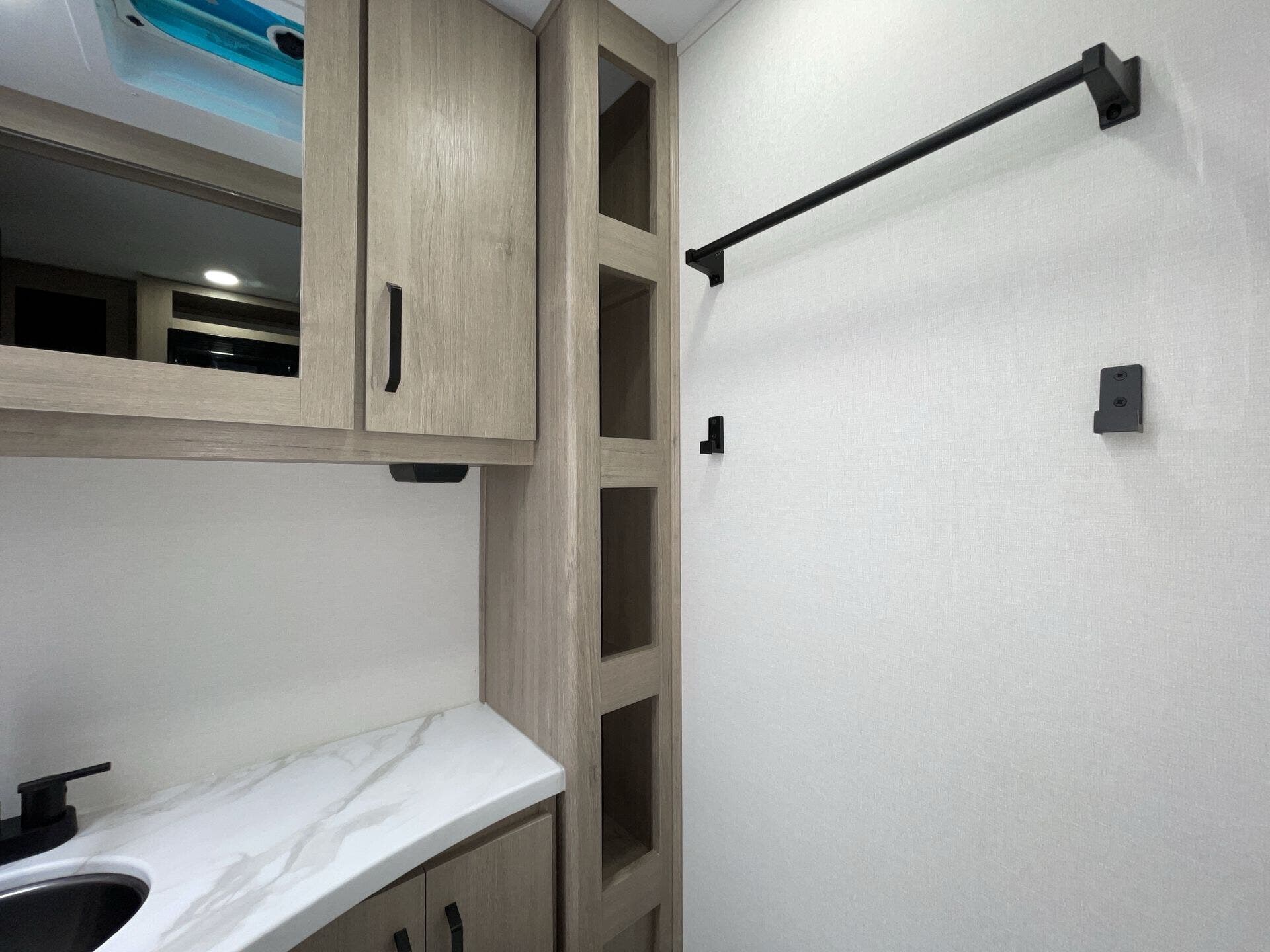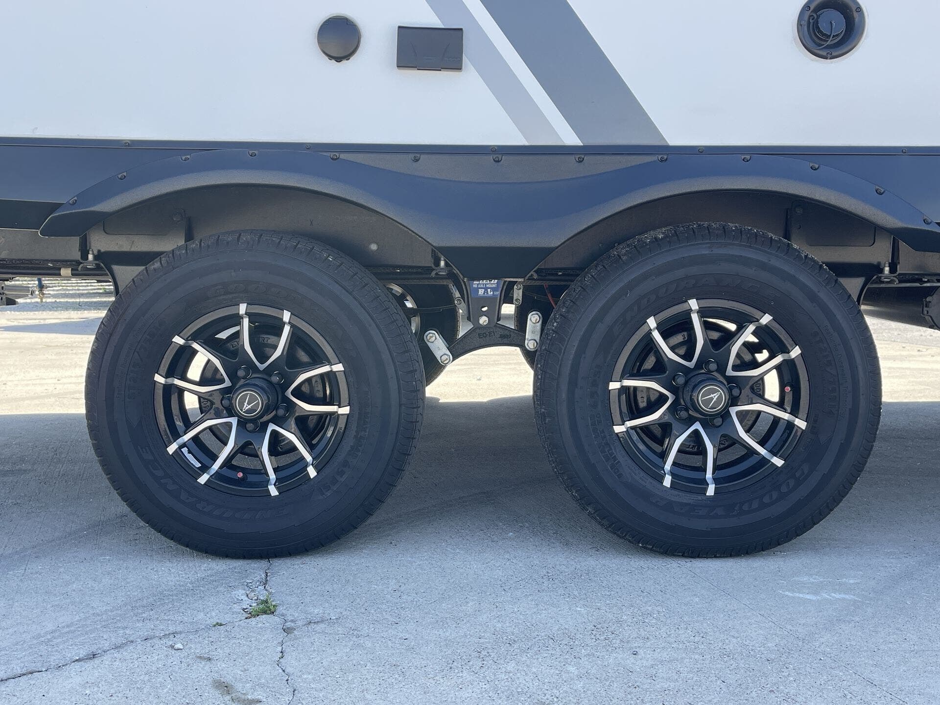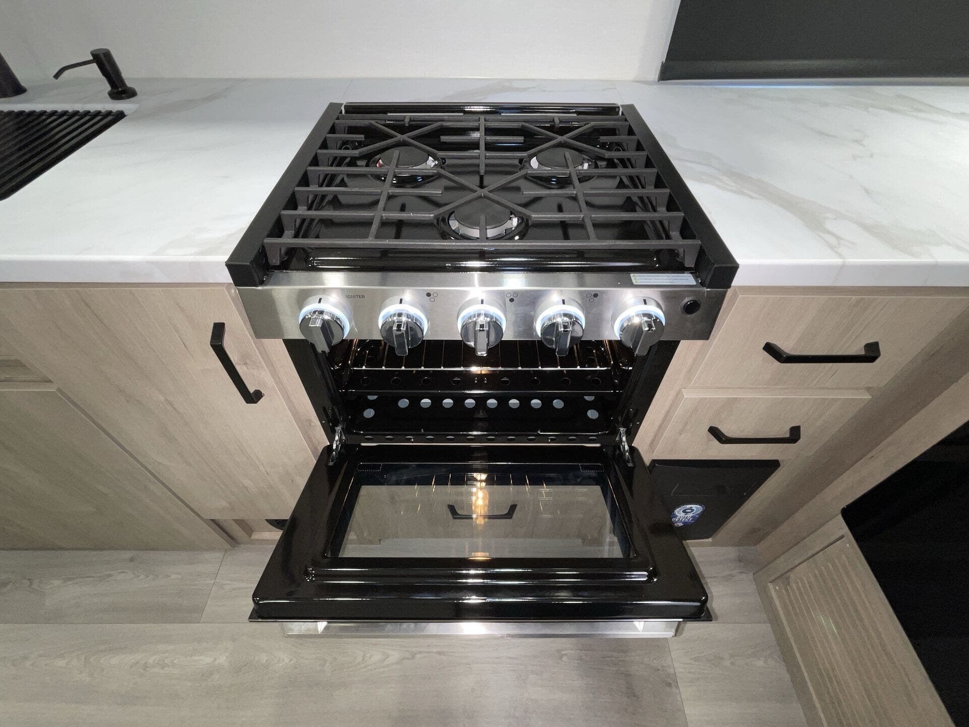 The kitchen is fully equipped for life on the road, featuring modern appliances, generous counter space, and a 10 cu. ft. refrigerator. The rear bathroom offers a roomy shower and added storage—rare for a trailer this size.