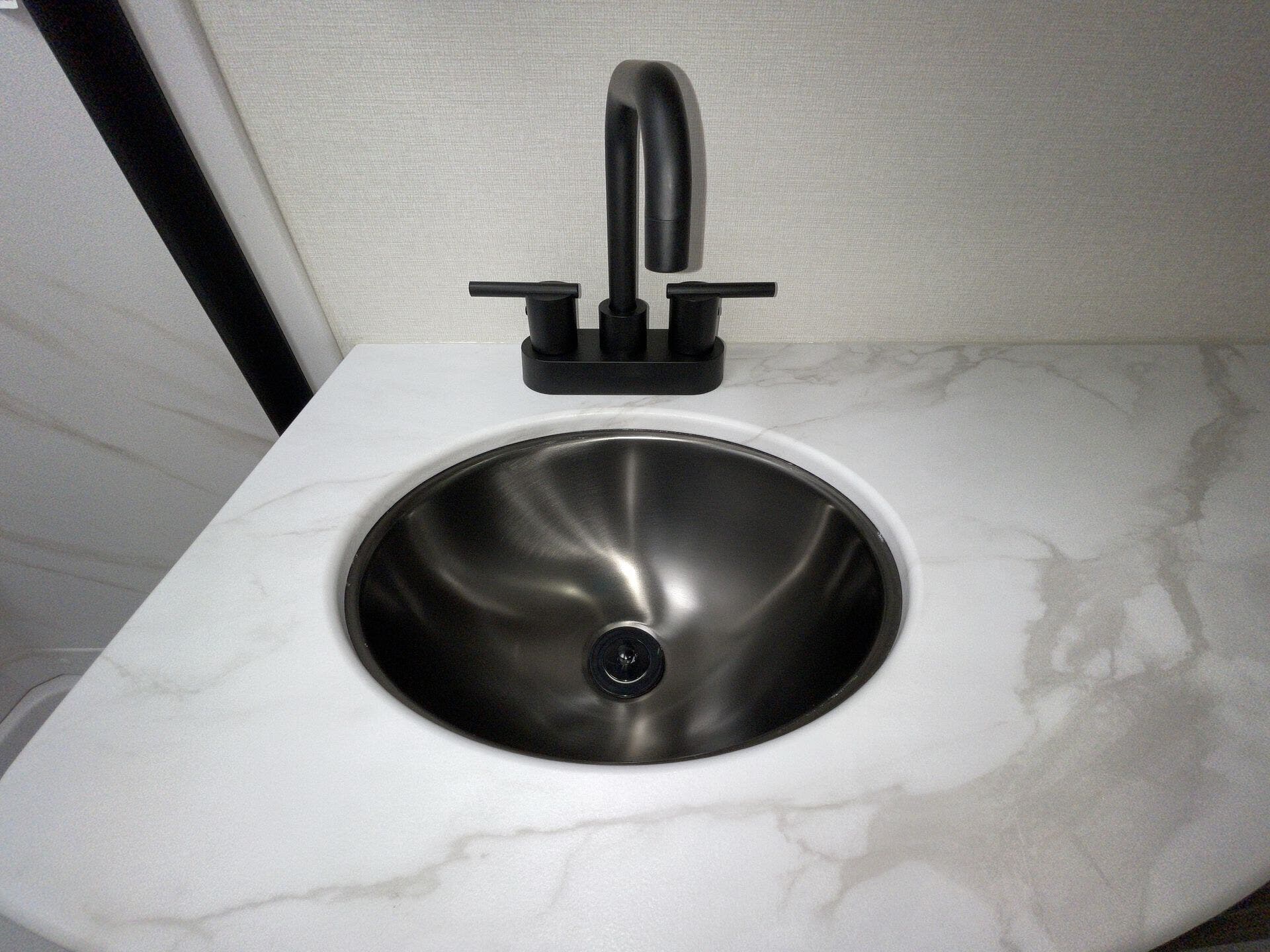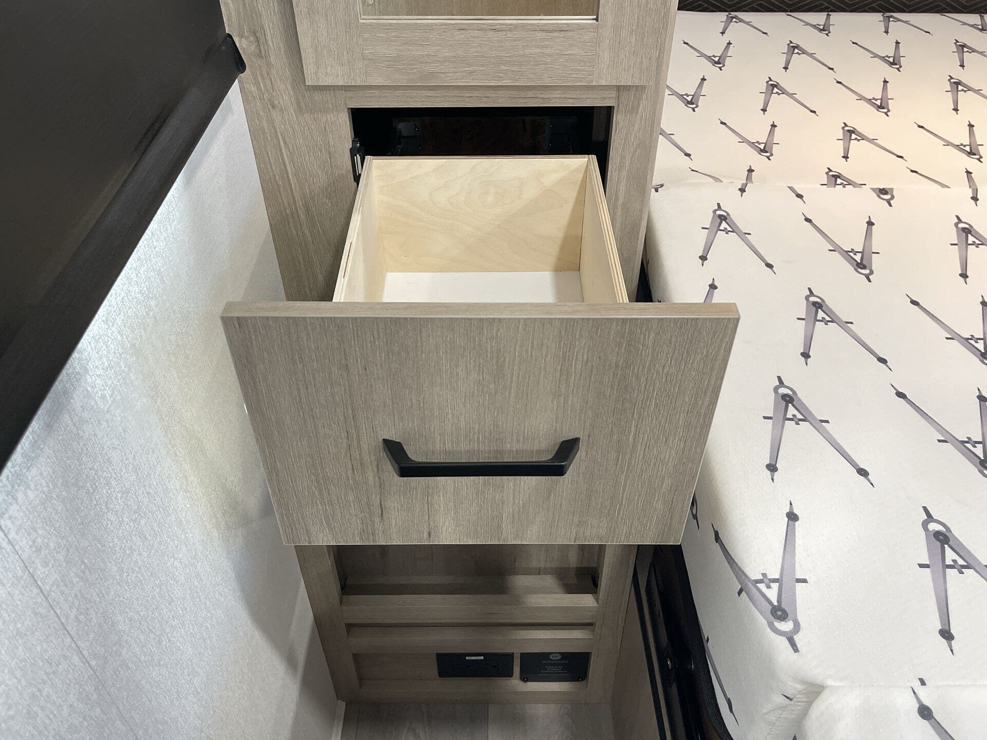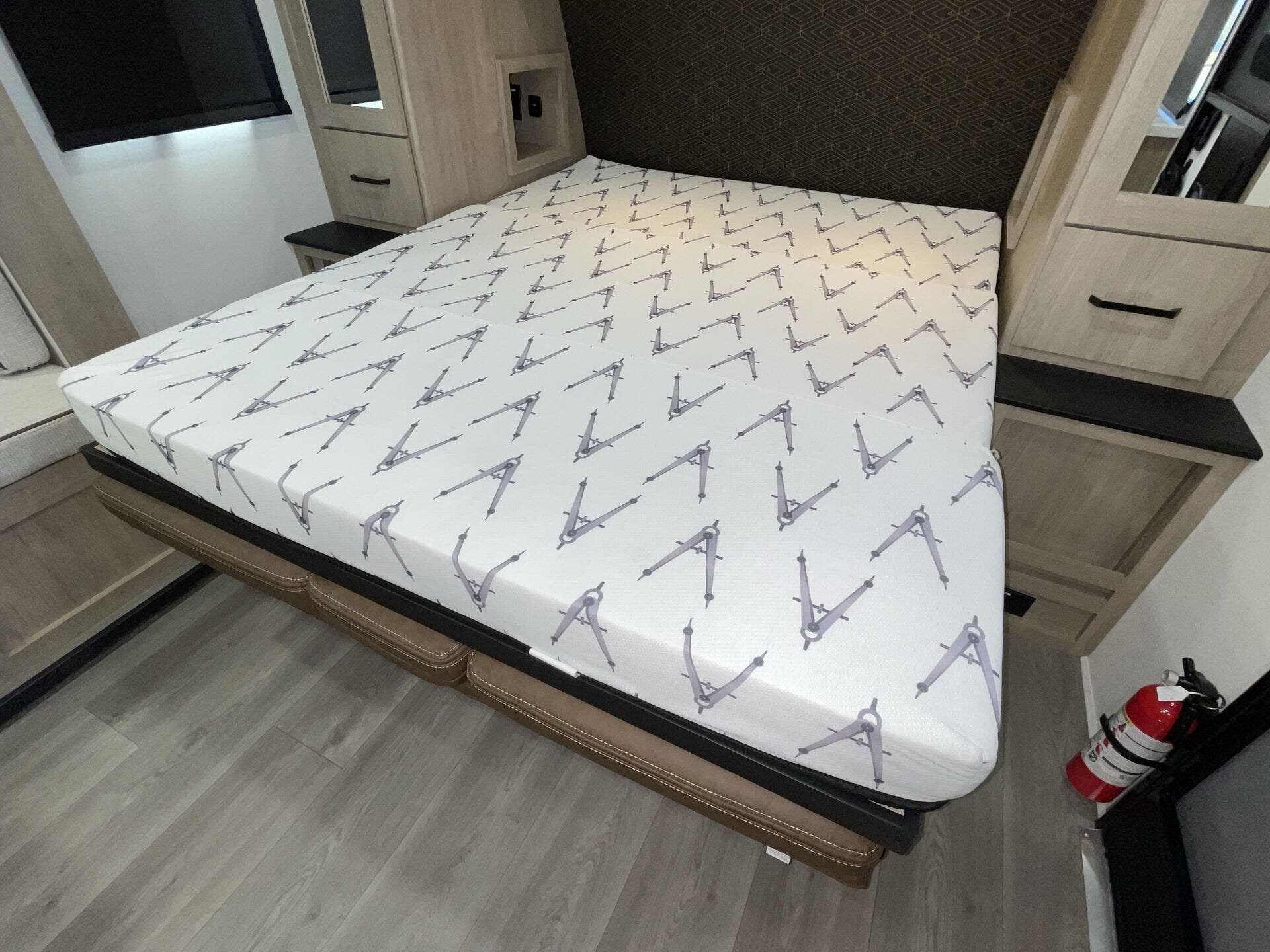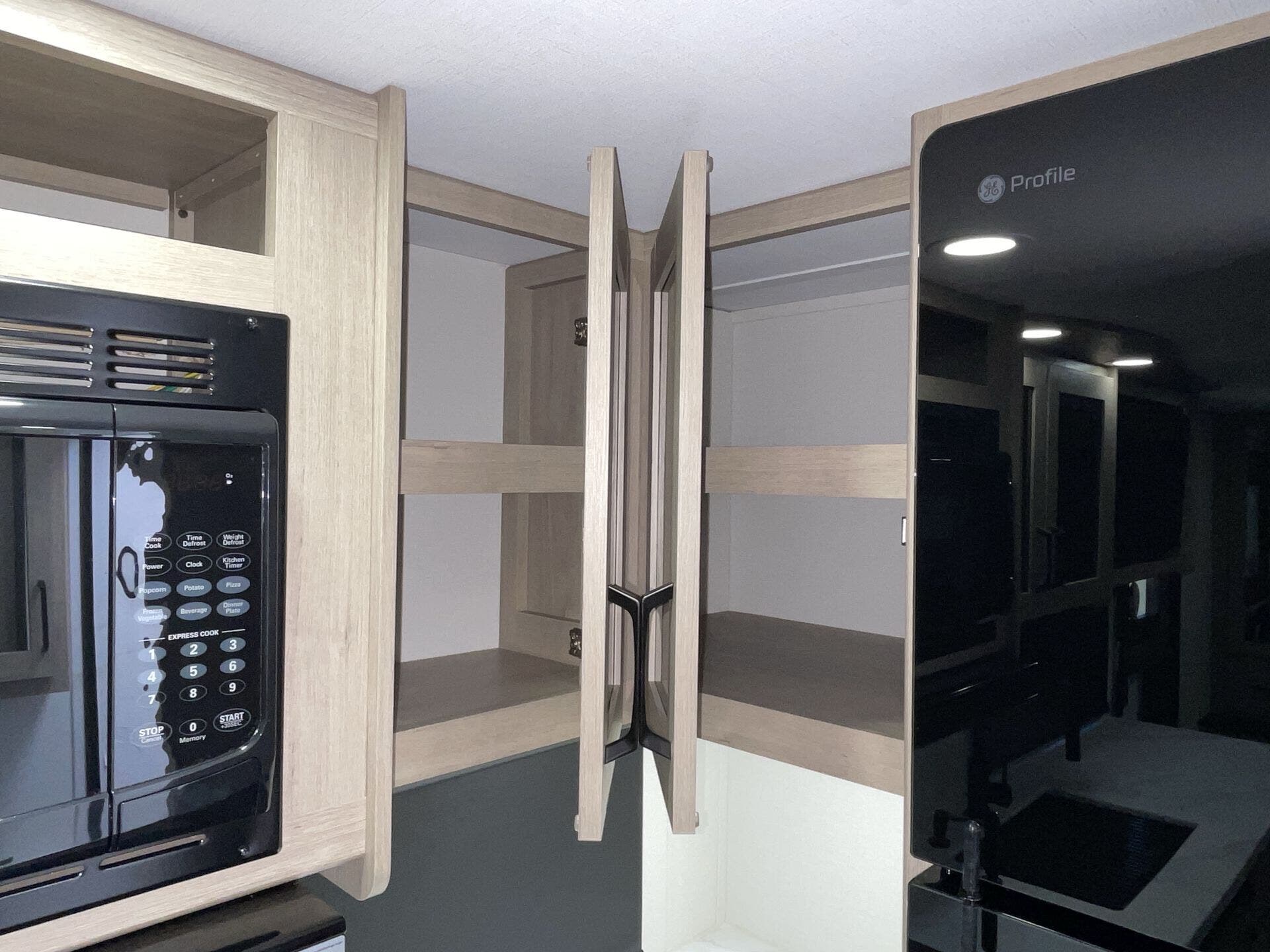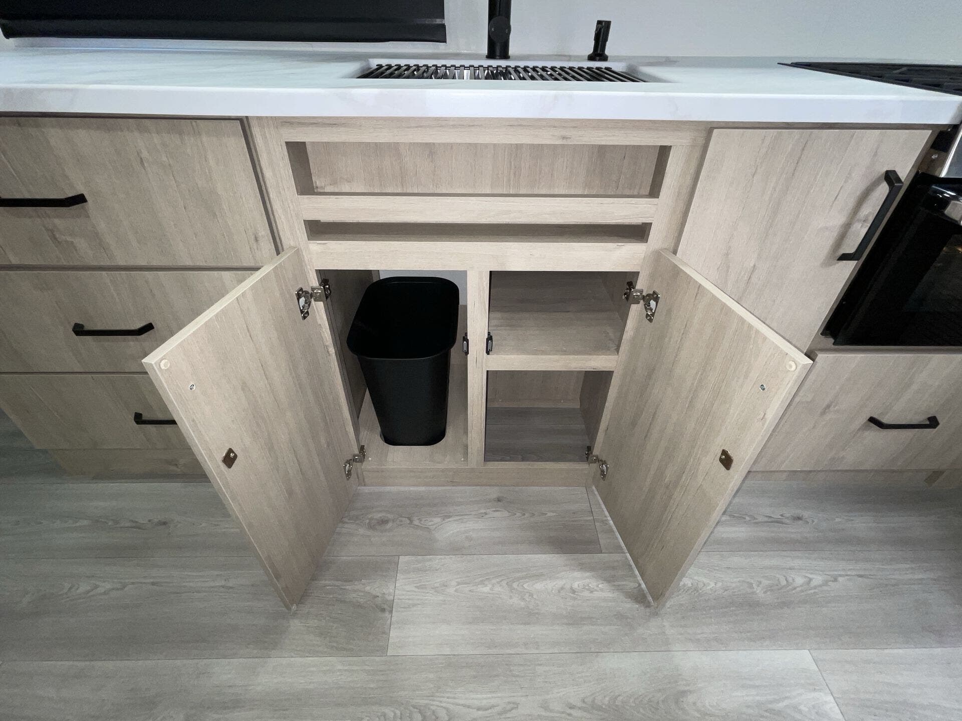 The kitchen is fully equipped for life on the road, featuring modern appliances, generous counter space, and a 10 cu. ft. refrigerator. The rear bathroom offers a roomy shower and added storage—rare for a trailer this size.