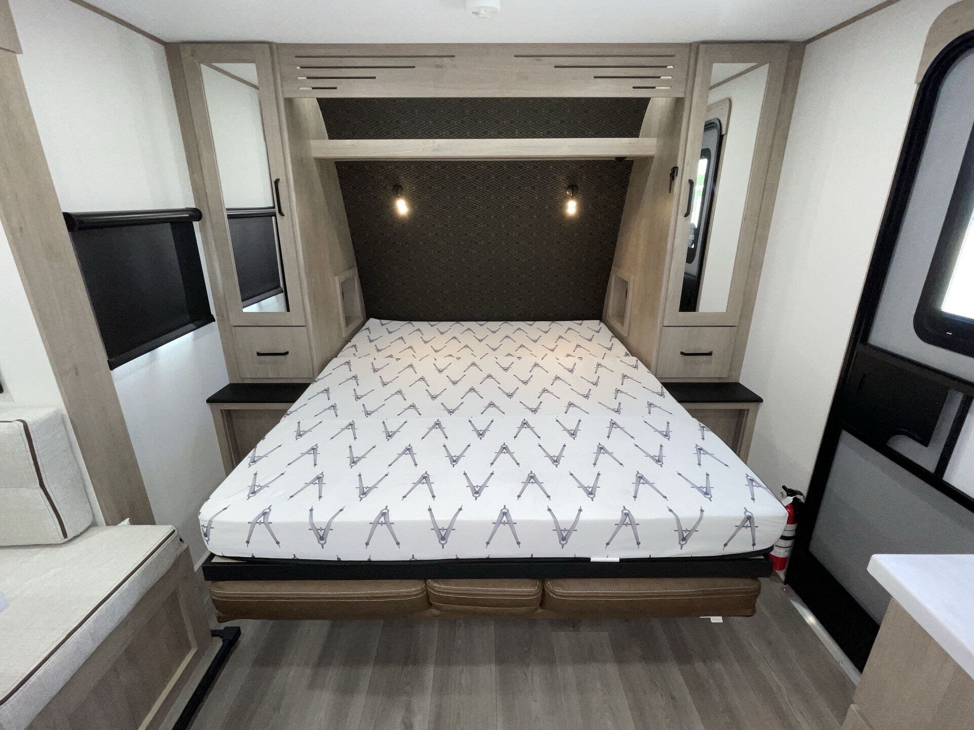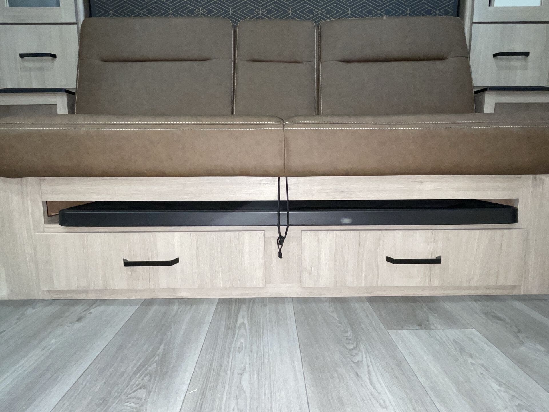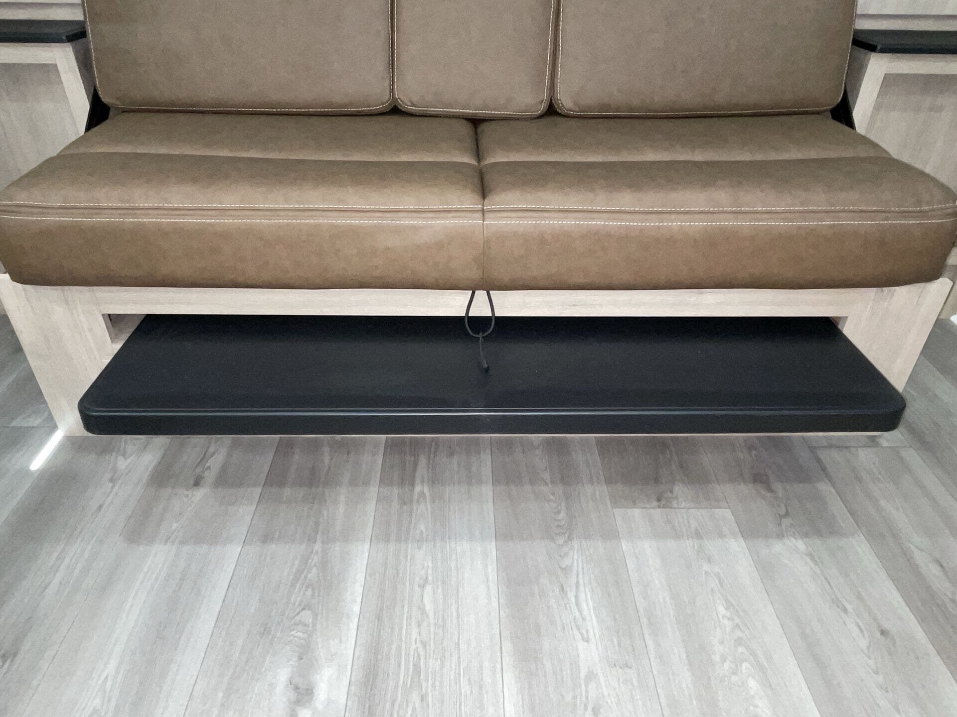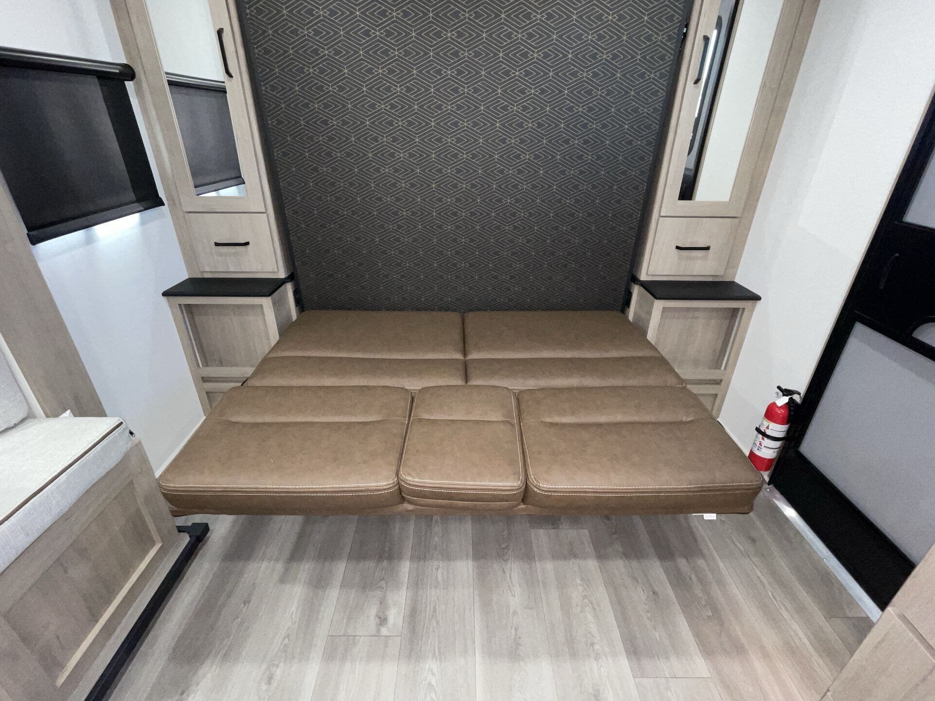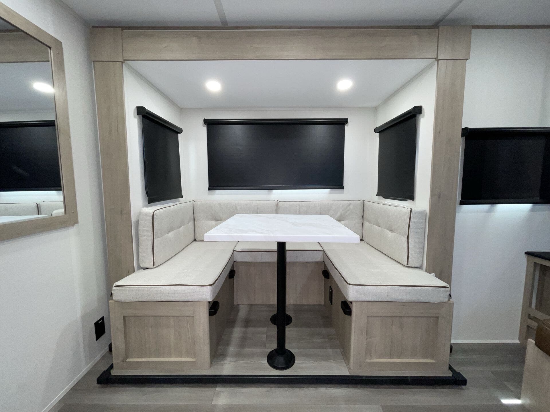 Inside, the smart Murphy bed design transforms the living space from a comfortable lounge during the day into a cozy sleeping area at night. The U-shaped dinette on a slide-out creates a more open feel, while large windows bring in natural light for a bright, inviting interior.