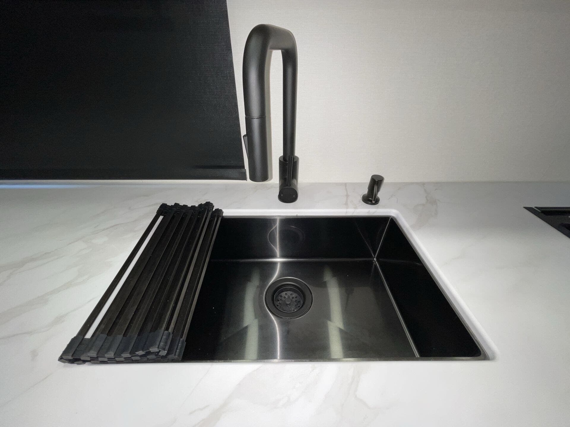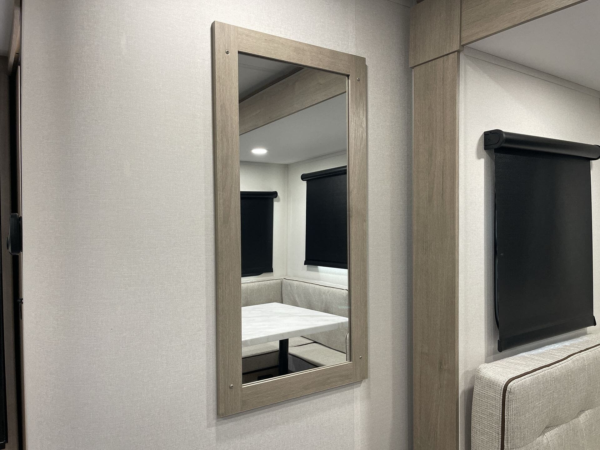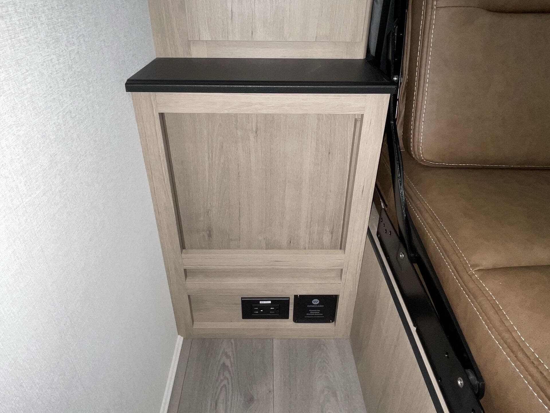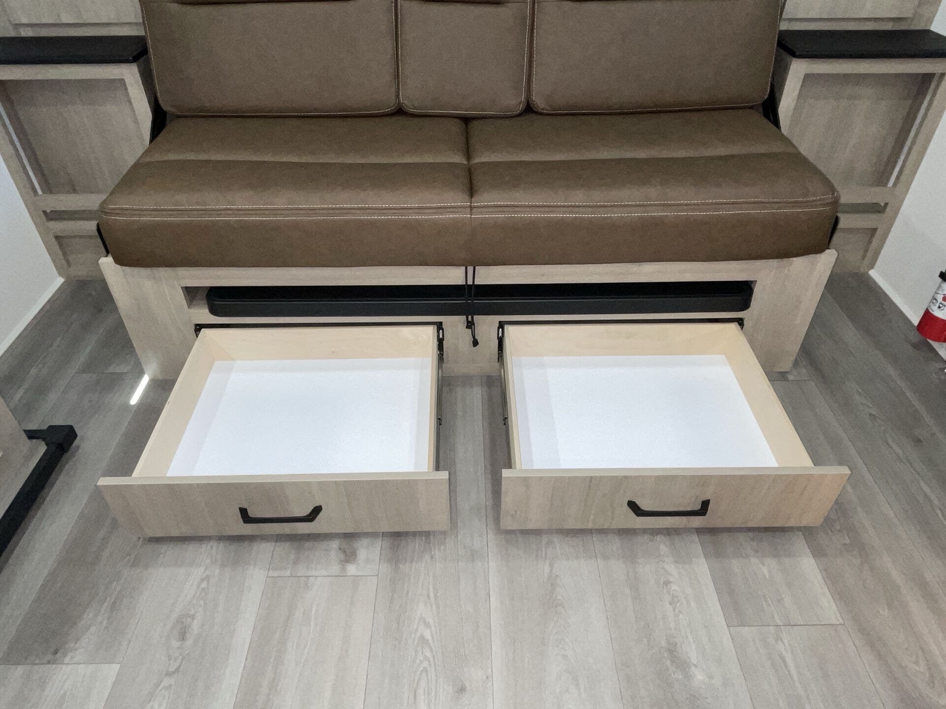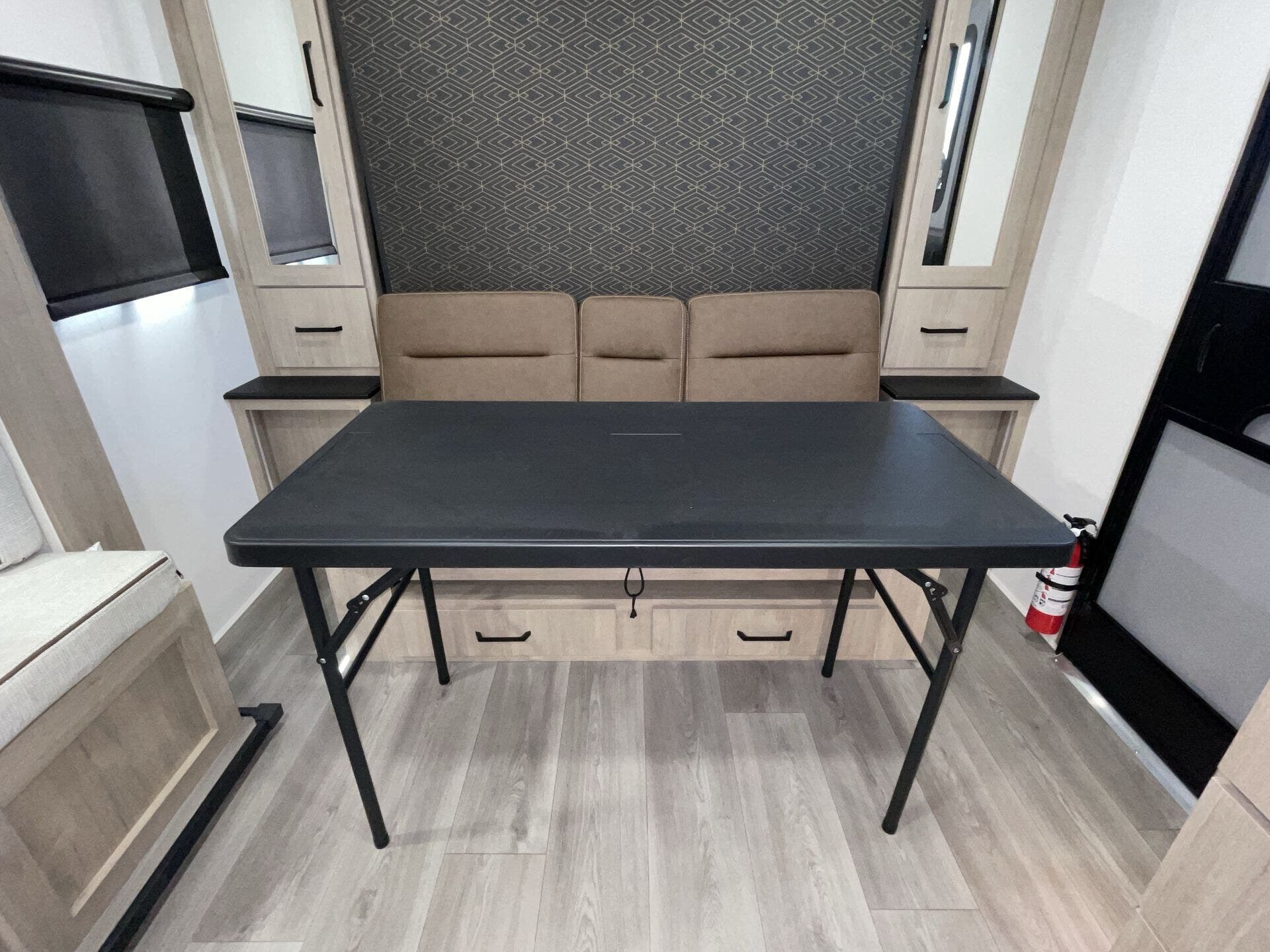 Inside, the smart Murphy bed design transforms the living space from a comfortable lounge during the day into a cozy sleeping area at night. The U-shaped dinette on a slide-out creates a more open feel, while large windows bring in natural light for a bright, inviting interior.