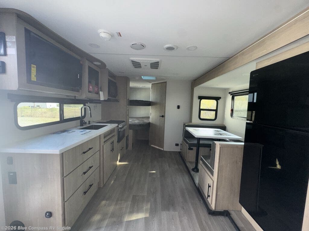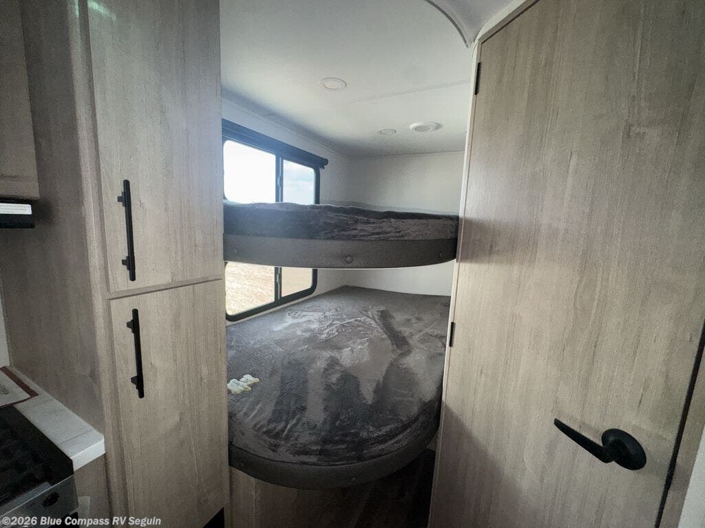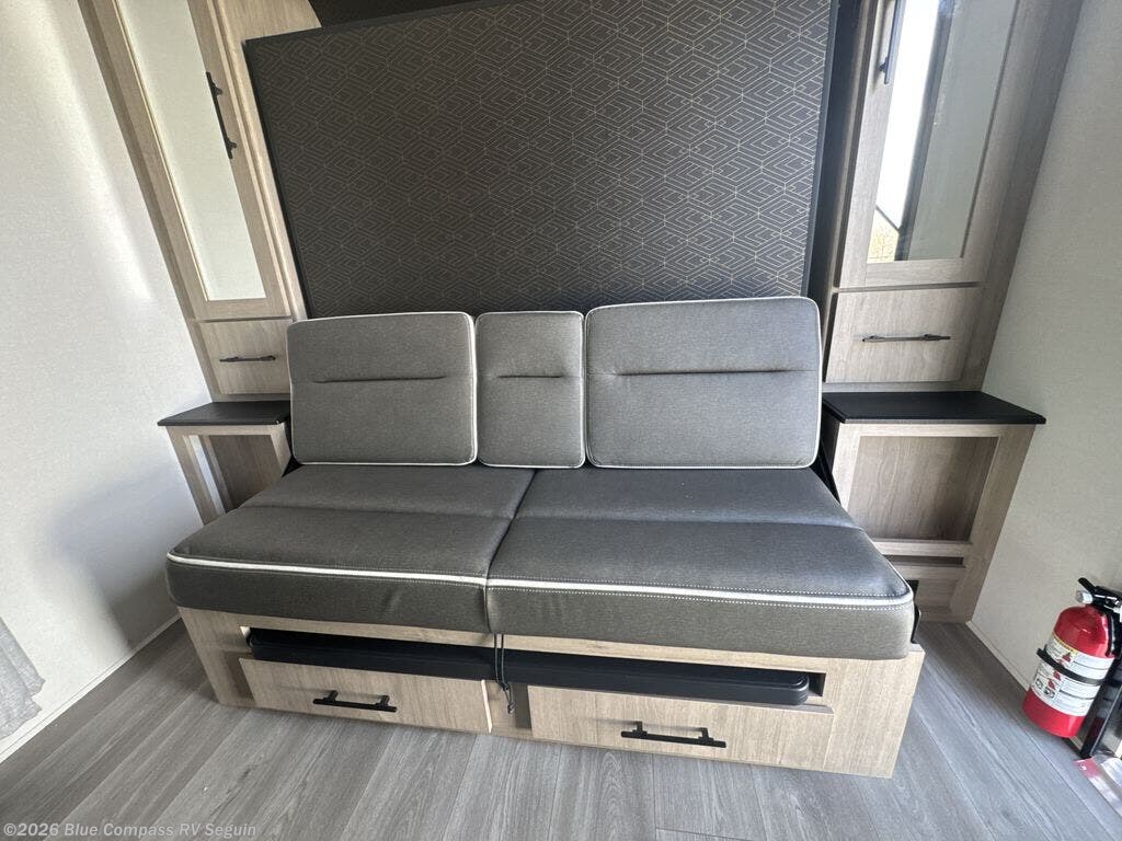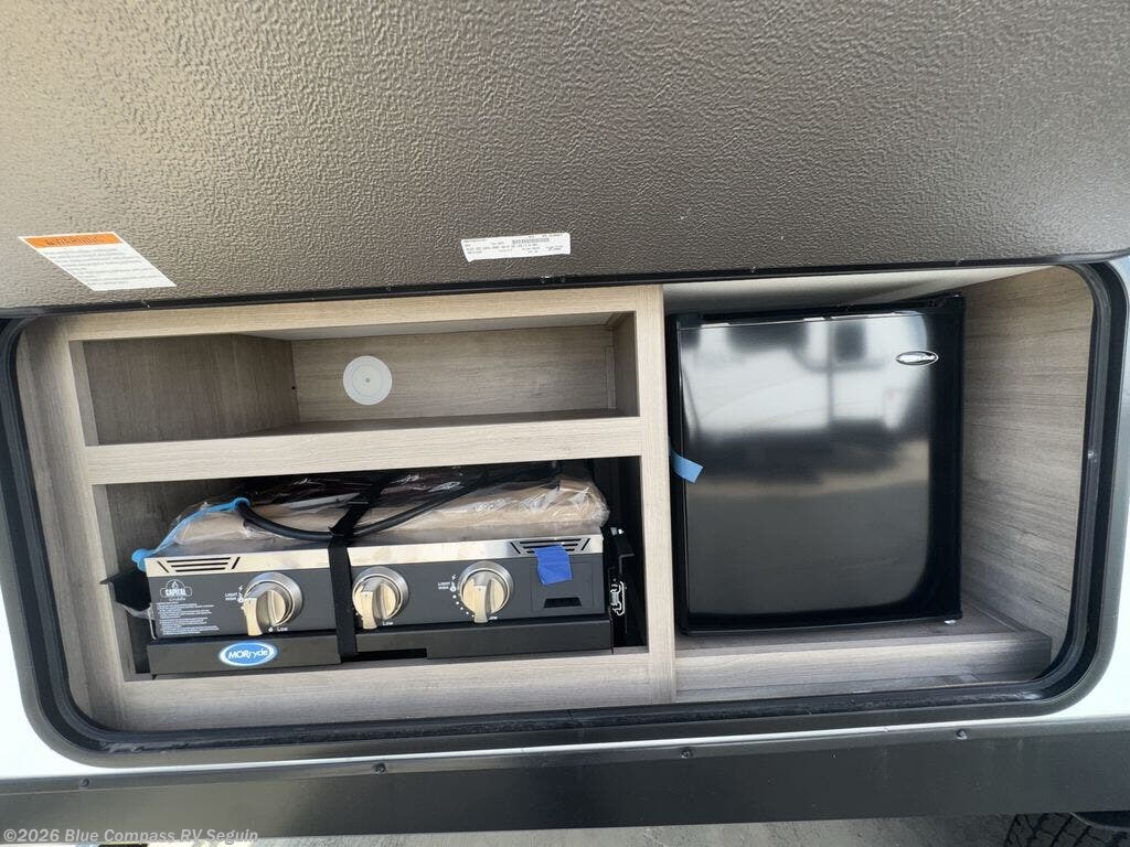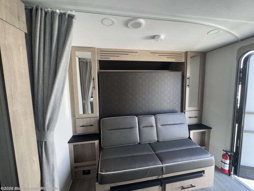 This travel trailer has everything you need for a great vacation! You will never miss home when you see all of the amenities included on this trailer. There is a full bathroom for easy morning routines, a set of 47" x 76" double over double-size bunks with privacy curtains for compact sleeping, a U-shaped dinette for meal times, and a full kitchen with all of the appliances needed for filling meals. You could even switch out the dinette for an optional theater dinette. The front Murphy bed not only provides versatility with a bed to sleep on at night, and a seating area during the day, but also a removable interior/exterior table. In addition to all of that, you'll also find an outdoor griddle and 1.6 cu. ft. refrigerator that you can use when the weather is nice. The unobstructed pass-through storage will be able to store your fishing poles and sports equipment while you travel.