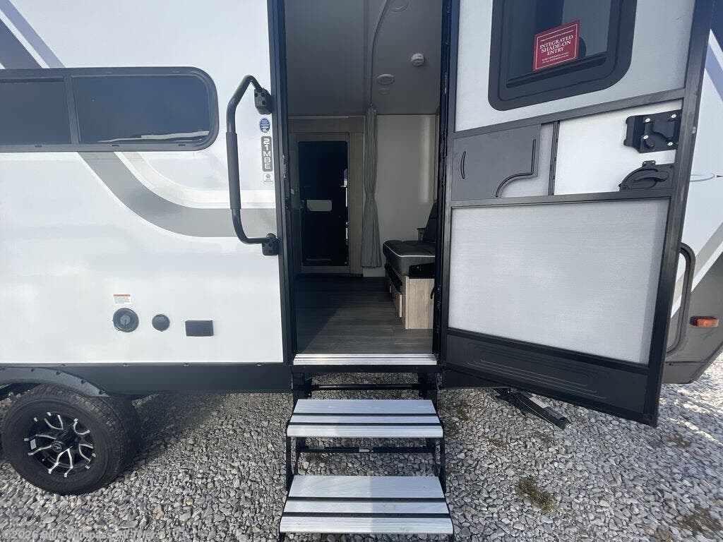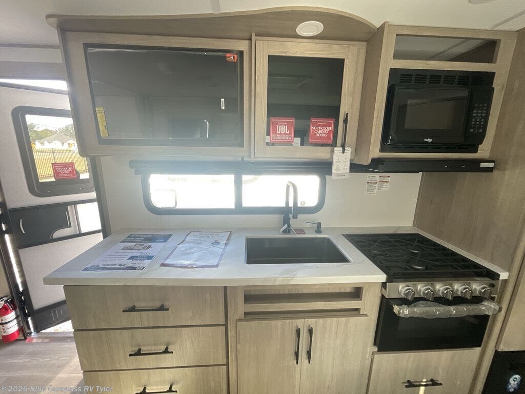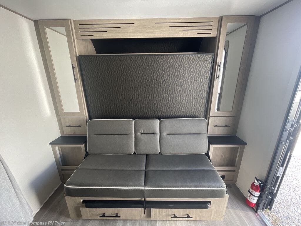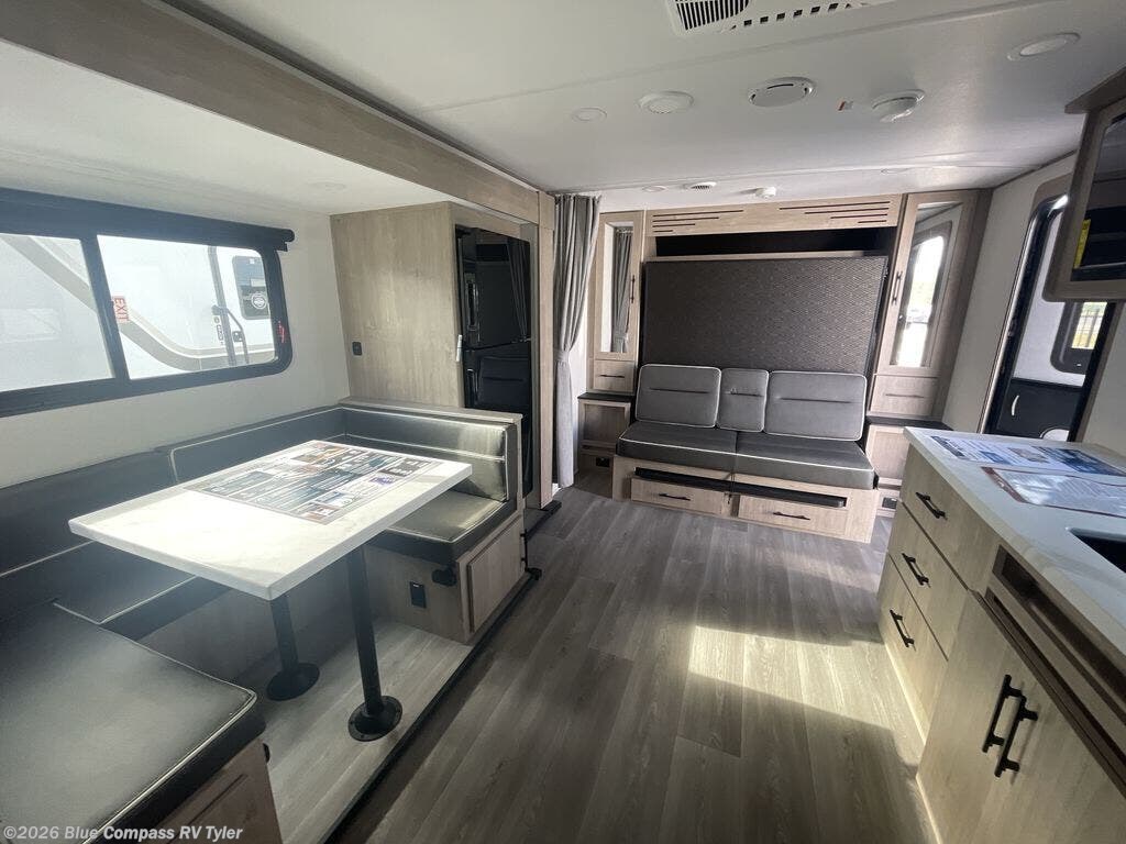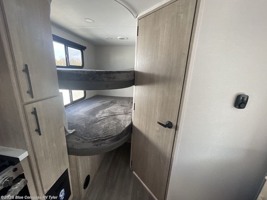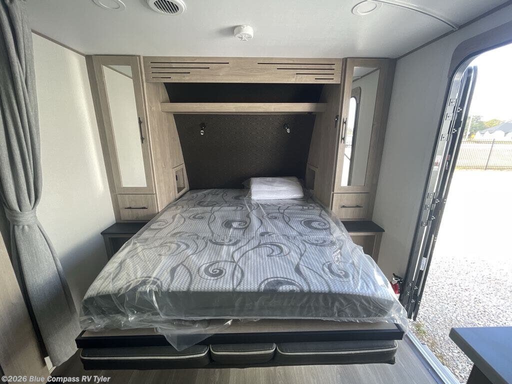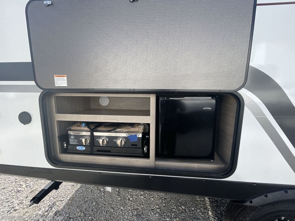This travel trailer has everything you need for a great vacation! You will never miss home when you see all of the amenities included on this trailer. There is a full bathroom for easy morning routines, a set of 47" x 76" double over double-size bunks with privacy curtains for compact sleeping, a U-shaped dinette for meal times, and a full kitchen with all of the appliances needed for filling meals. You could even switch out the dinette for an optional theater dinette. The front Murphy bed not only provides versatility with a bed to sleep on at night, and a seating area during the day, but also a removable interior/exterior table. In addition to all of that, you'll also find an outdoor griddle and 1.6 cu. ft. refrigerator that you can use when the weather is nice. The unobstructed pass-through storage will be able to store your fishing poles and sports equipment while you travel.