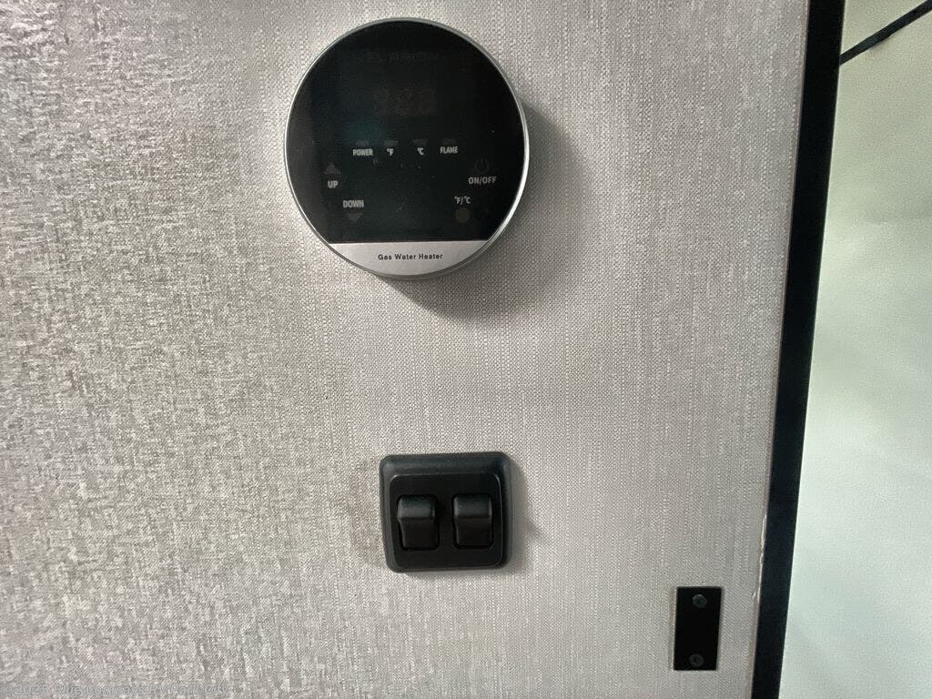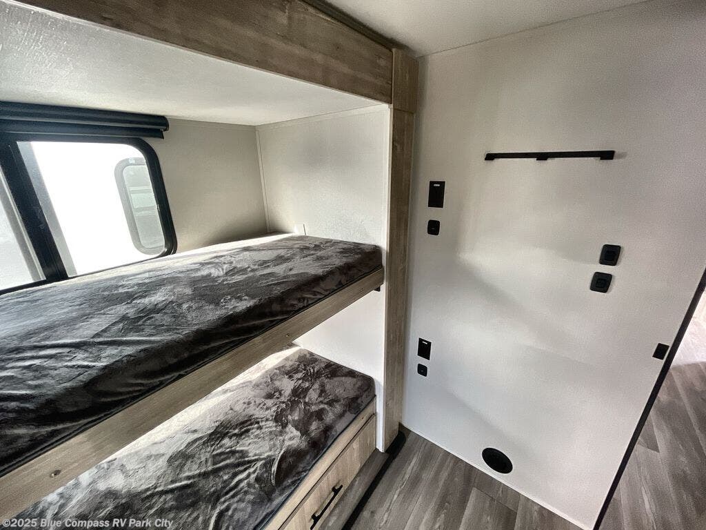 Your family will love camping in this spacious and versatile trailer thanks to the double slides and Murphy bed provided. During the day the Murphy bed is tucked away to provide more space and seating, and at night when folded down, there is a curtain for some privacy as you sleep. The booth dinette slides out to provide even more space and features windows on three sides so you can look out at your surroundings while you enjoy breakfast. The 30" flip top and bottom bunks each have some privacy with the sliding door, and the bunks are right next to the full bathroom for easy access in the middle of the night. The kitchen features everything you need to create meals and snacks as you travel, and you can have some more prep space by using the flip-up countertop extension.