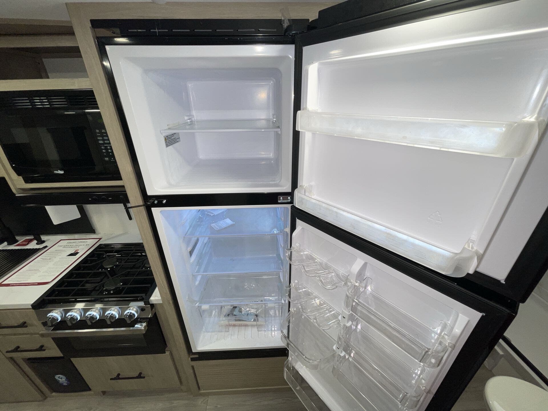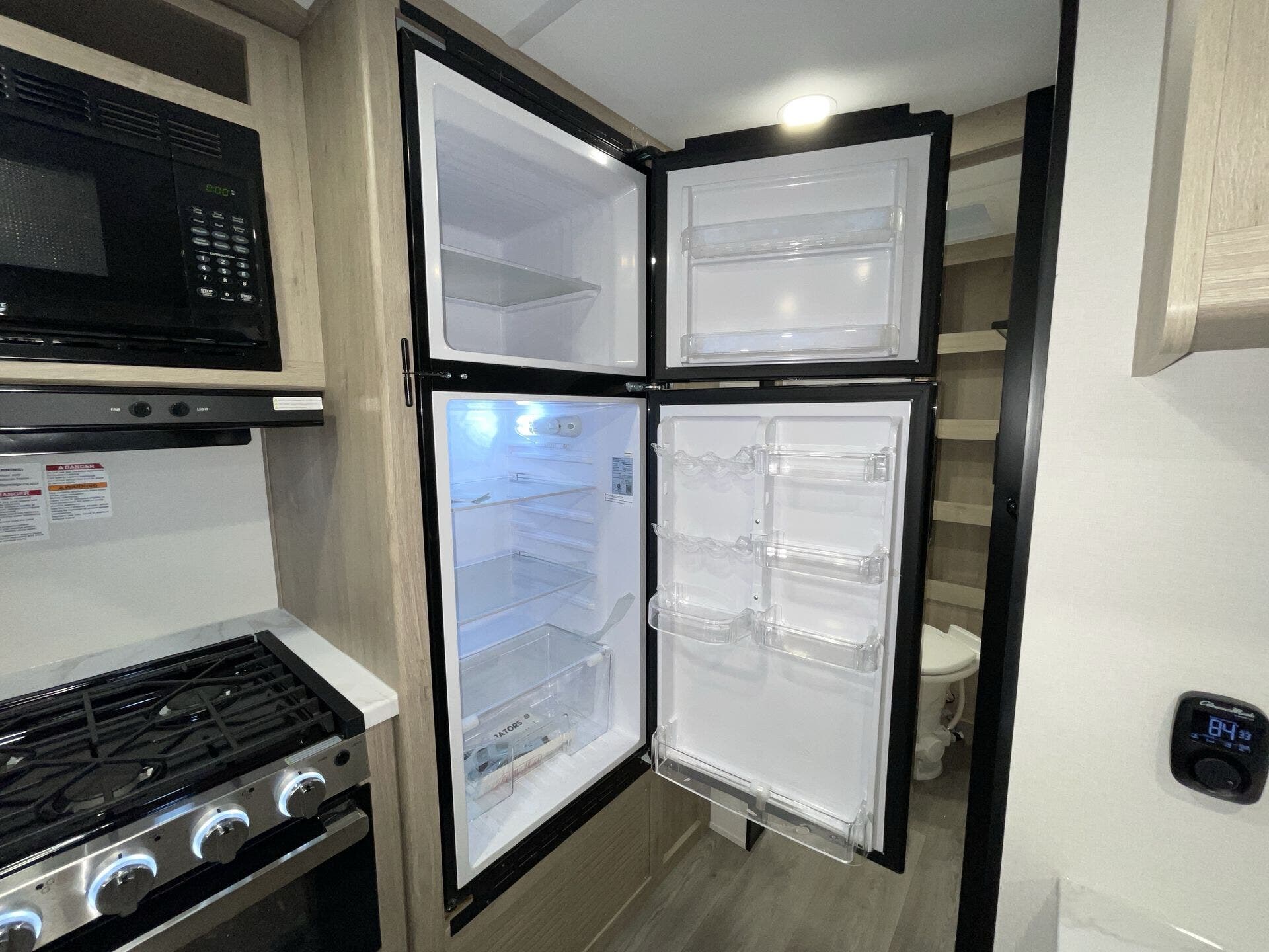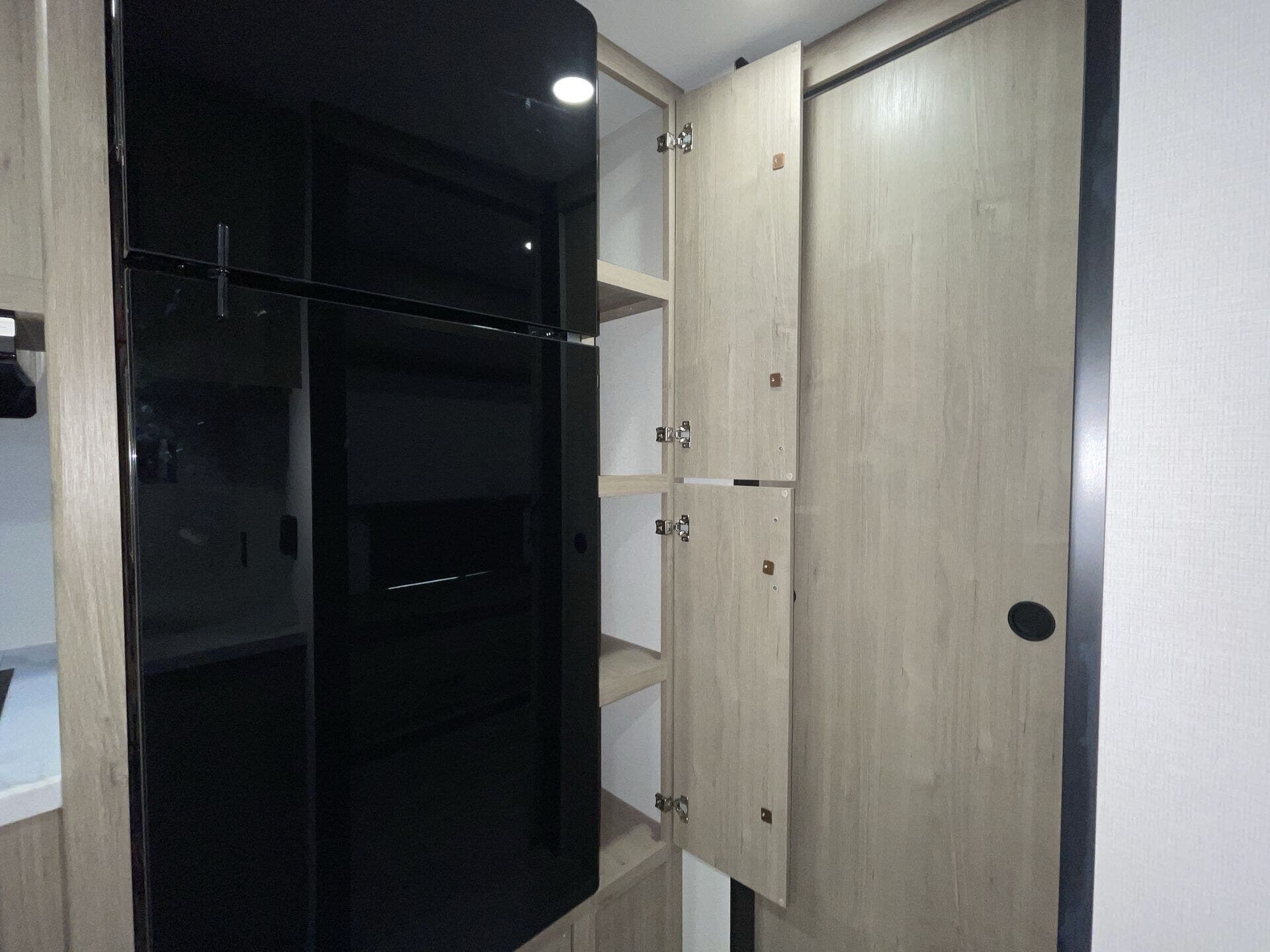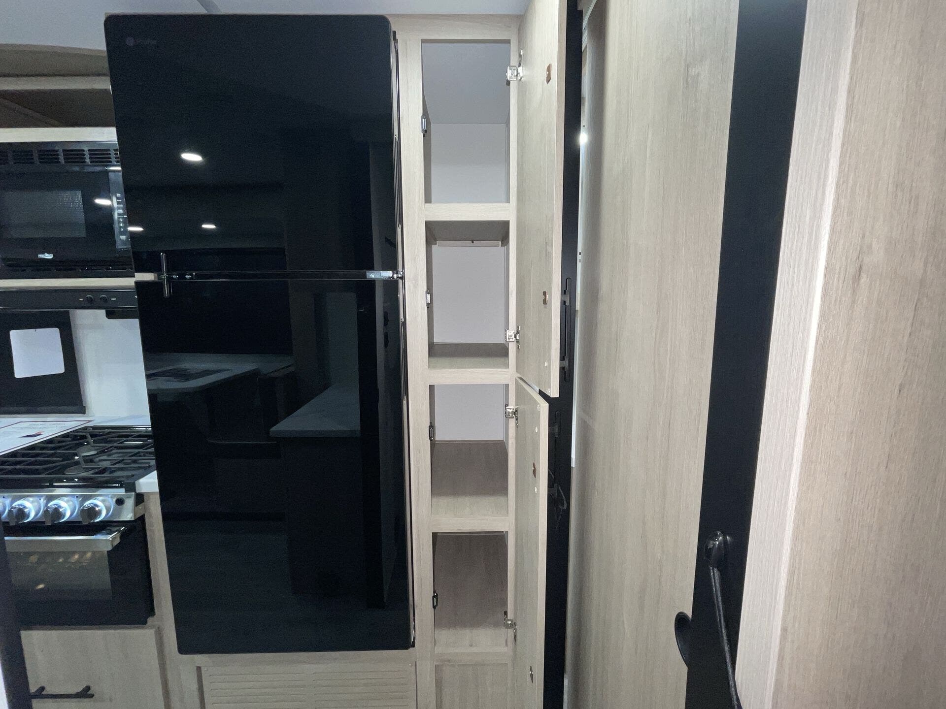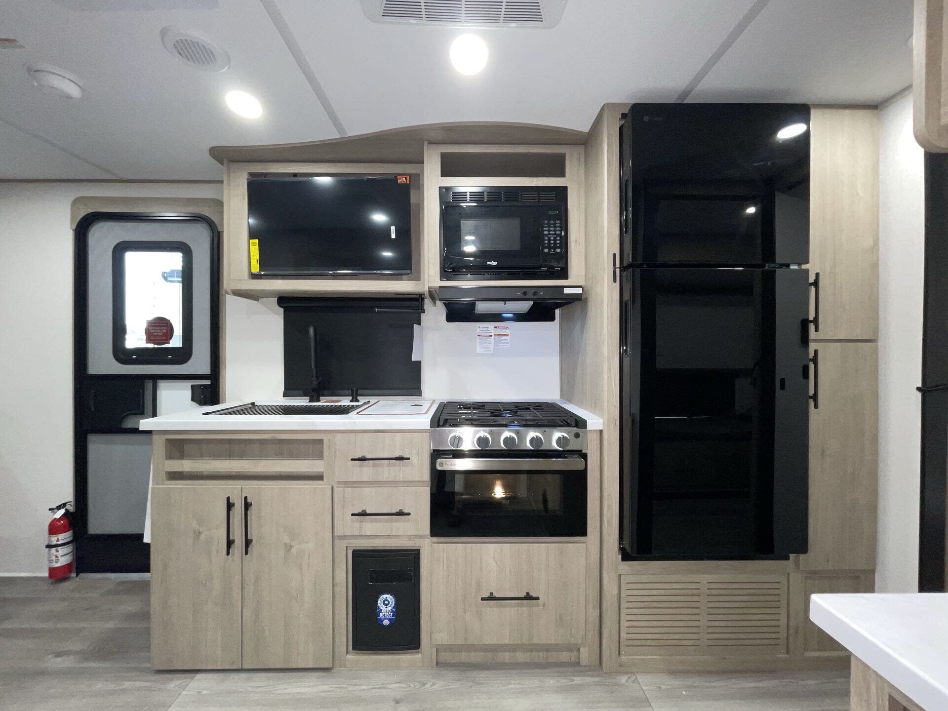 The bunkhouse layout is ideal for families or guests, featuring dedicated sleeping zones and clever storage. A front bedroom ensures a private retreat, while the rear bunk area keeps kids and guests comfortable. The interior showcases abundant overhead cabinetry, a pantry for dry goods, and a kitchen that includes a microwave, oven, stove top burner, and a full-size refrigerator. When you’re ready to unwind, the theater seating and convertible dinette bed offer cozy seating that doubles as additional sleeping space.