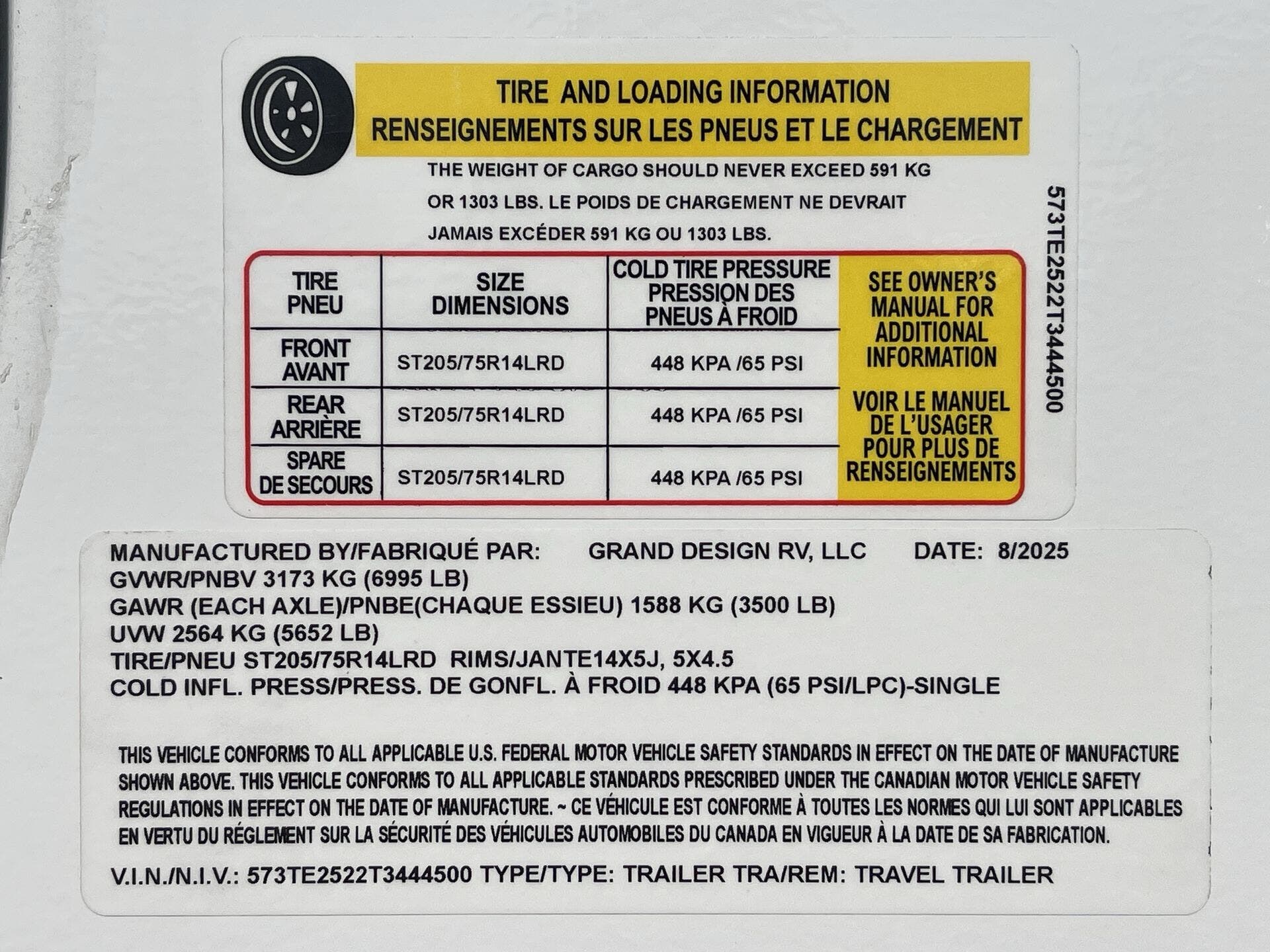 Awning, Detachable Power Cord, Hitch, Leveling Jacks, Pass Thru Storage, Power Awning, Roof Vent, Screen Door, Slideout, Spare Tire Kit -