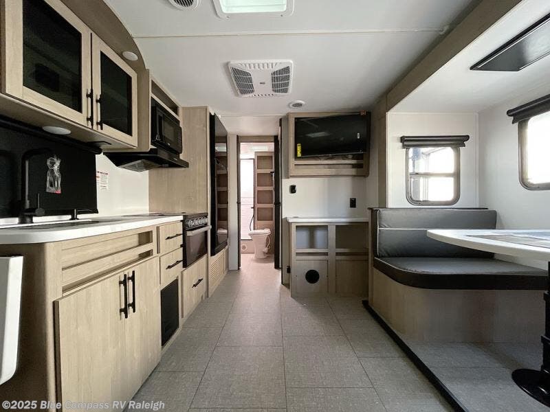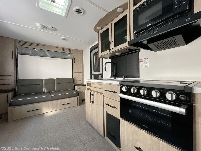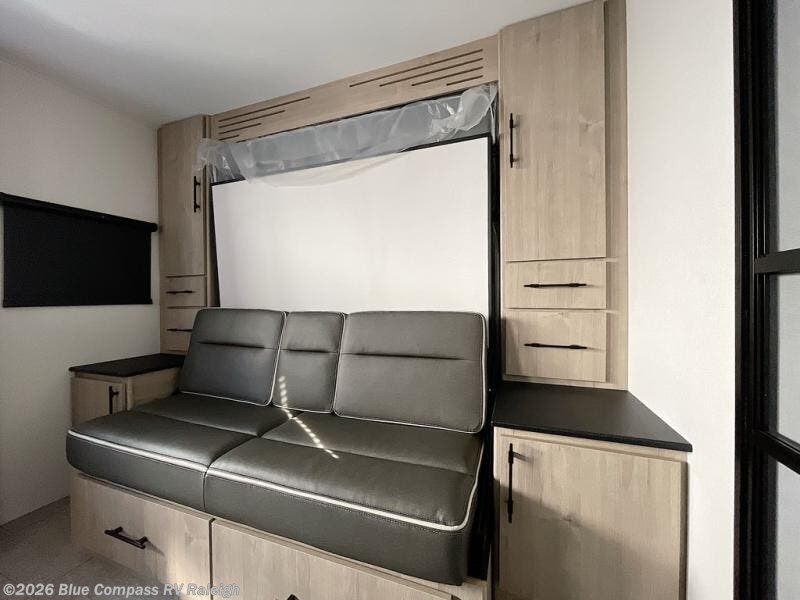 Your family will love camping in this spacious and versatile trailer thanks to the double slides and Murphy bed provided. During the day the Murphy bed is tucked away to provide more space and seating, and at night when folded down, there is a curtain for some privacy as you sleep. The booth dinette slides out to provide even more space and features windows on three sides so you can look out at your surroundings while you enjoy breakfast. The 30" flip top and bottom bunks each have some privacy with the sliding door, and the bunks are right next to the full bathroom for easy access in the middle of the night. The kitchen features everything you need to create meals and snacks as you travel, and you can have some more prep space by using the flip-up countertop extension.
