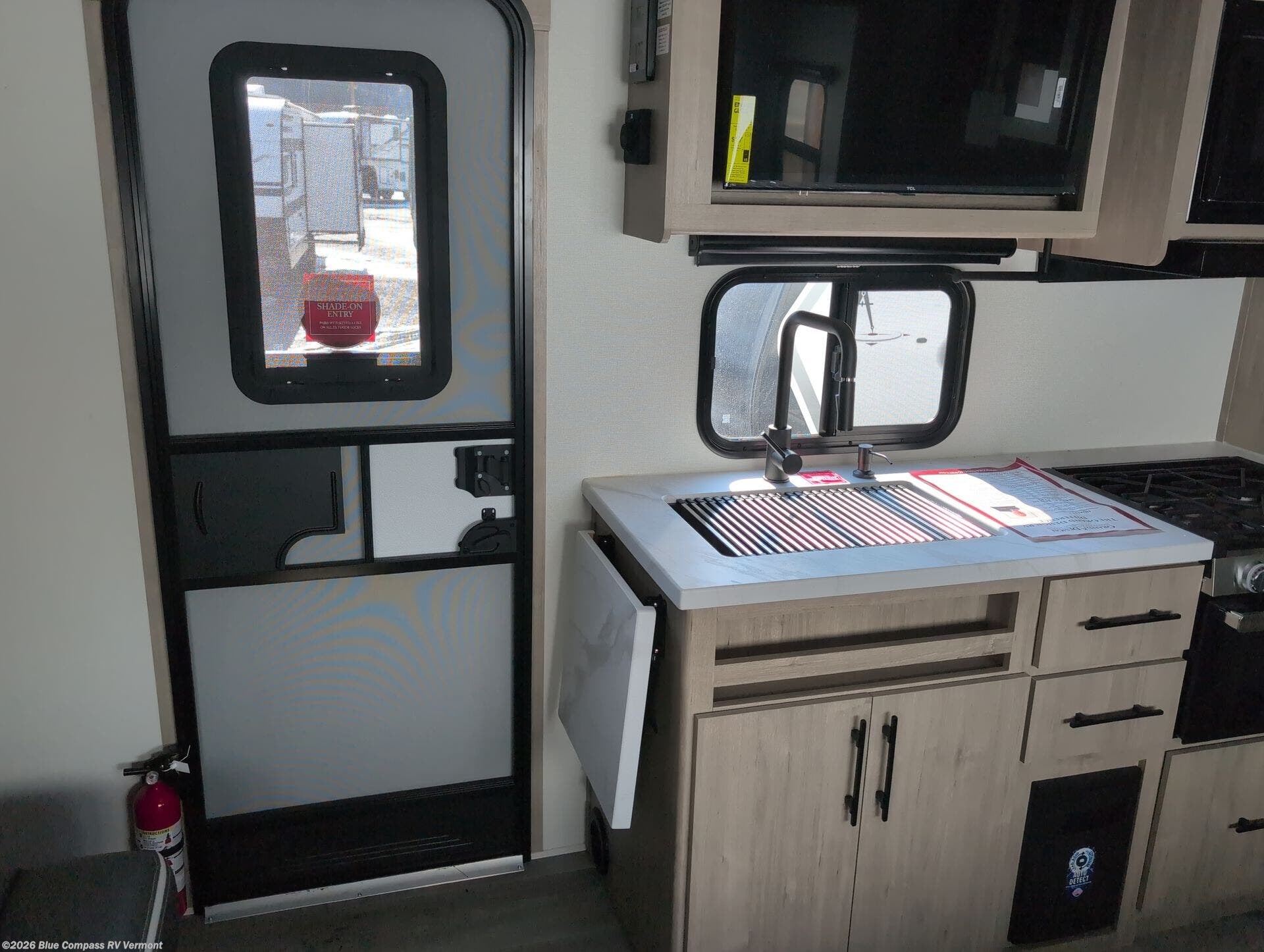 Your family will love camping in this spacious and versatile trailer thanks to the double slides and Murphy bed provided. During the day the Murphy bed is tucked away to provide more space and seating, and at night when folded down, there is a curtain for some privacy as you sleep. The booth dinette slides out to provide even more space and features windows on three sides so you can look out at your surroundings while you enjoy breakfast. The 30" flip top and bottom bunks each have some privacy with the sliding door, and the bunks are right next to the full bathroom for easy access in the middle of the night. The kitchen features everything you need to create meals and snacks as you travel, and you can have some more prep space by using the flip-up countertop extension.