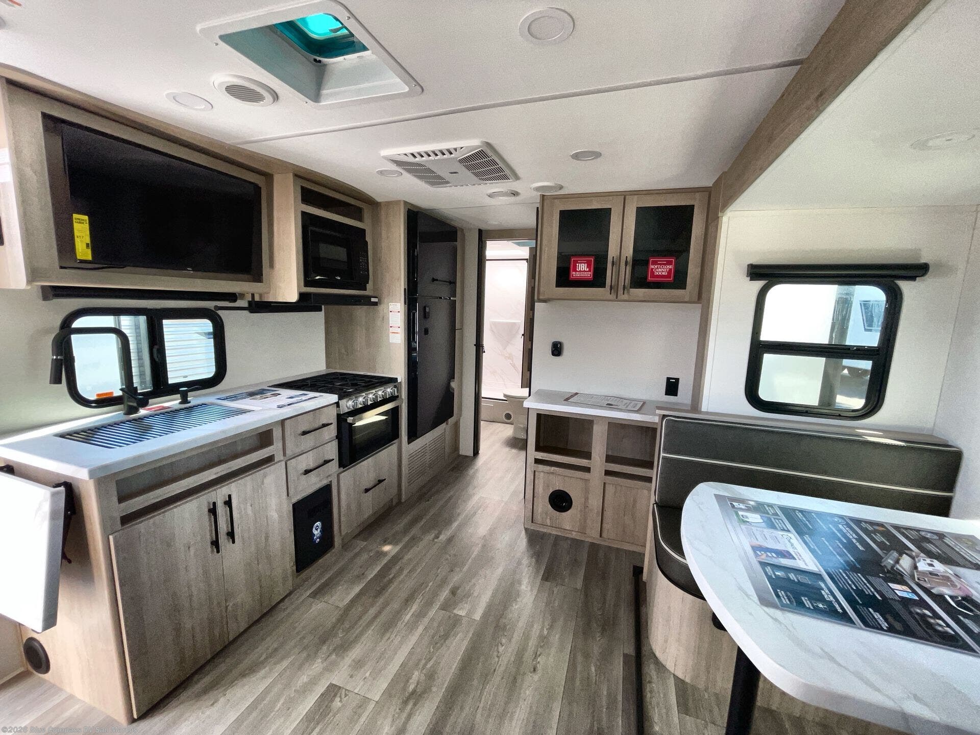 Your family will love camping in this spacious and versatile trailer thanks to the double slides and Murphy bed provided. During the day the Murphy bed is tucked away to provide more space and seating, and at night when folded down, there is a curtain for some privacy as you sleep. The booth dinette slides out to provide even more space and features windows on three sides so you can look out at your surroundings while you enjoy breakfast. The 30" flip top and bottom bunks each have some privacy with the sliding door, and the bunks are right next to the full bathroom for easy access in the middle of the night. The kitchen features everything you need to create meals and snacks as you travel, and you can have some more prep space by using the flip-up countertop extension.