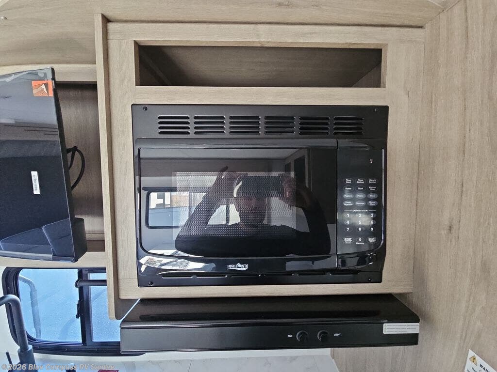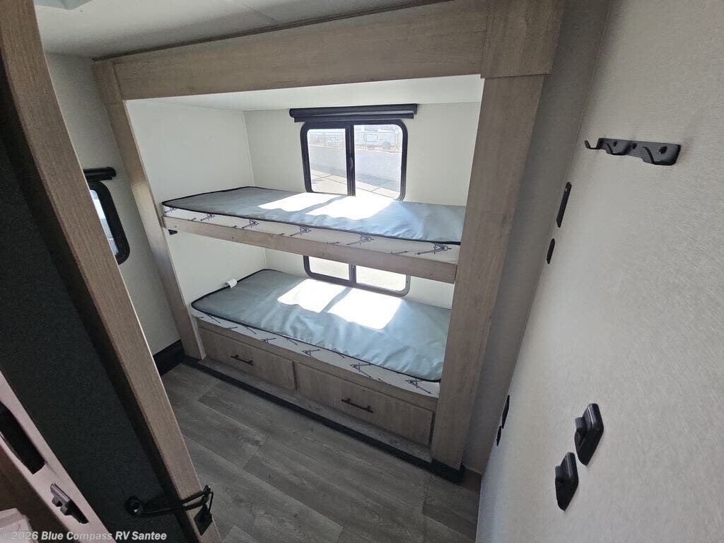 Your family will love camping in this spacious and versatile trailer thanks to the double slides and Murphy bed provided. During the day the Murphy bed is tucked away to provide more space and seating, and at night when folded down, there is a curtain for some privacy as you sleep. The booth dinette slides out to provide even more space and features windows on three sides so you can look out at your surroundings while you enjoy breakfast. The 30" flip top and bottom bunks each have some privacy with the sliding door, and the bunks are right next to the full bathroom for easy access in the middle of the night. The kitchen features everything you need to create meals and snacks as you travel, and you can have some more prep space by using the flip-up countertop extension.
