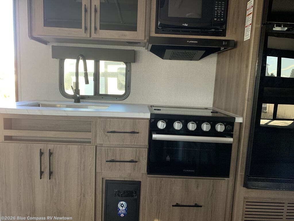Your family will love camping in this spacious and versatile trailer thanks to the double slides and Murphy bed provided. During the day the Murphy bed is tucked away to provide more space and seating, and at night when folded down, there is a curtain for some privacy as you sleep. The booth dinette slides out to provide even more space and features windows on three sides so you can look out at your surroundings while you enjoy breakfast. The 30" flip top and bottom bunks each have some privacy with the sliding door, and the bunks are right next to the full bathroom for easy access in the middle of the night. The kitchen features everything you need to create meals and snacks as you travel, and you can have some more prep space by using the flip-up countertop extension.