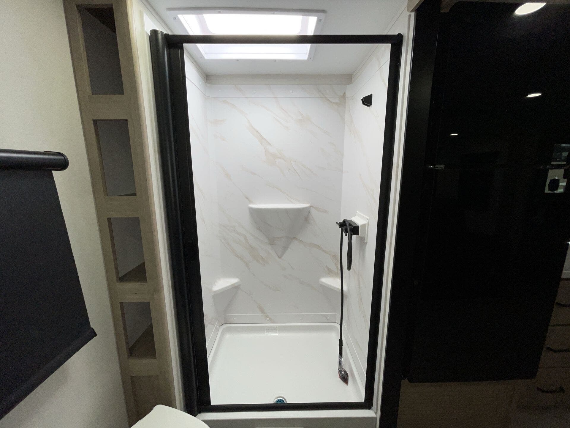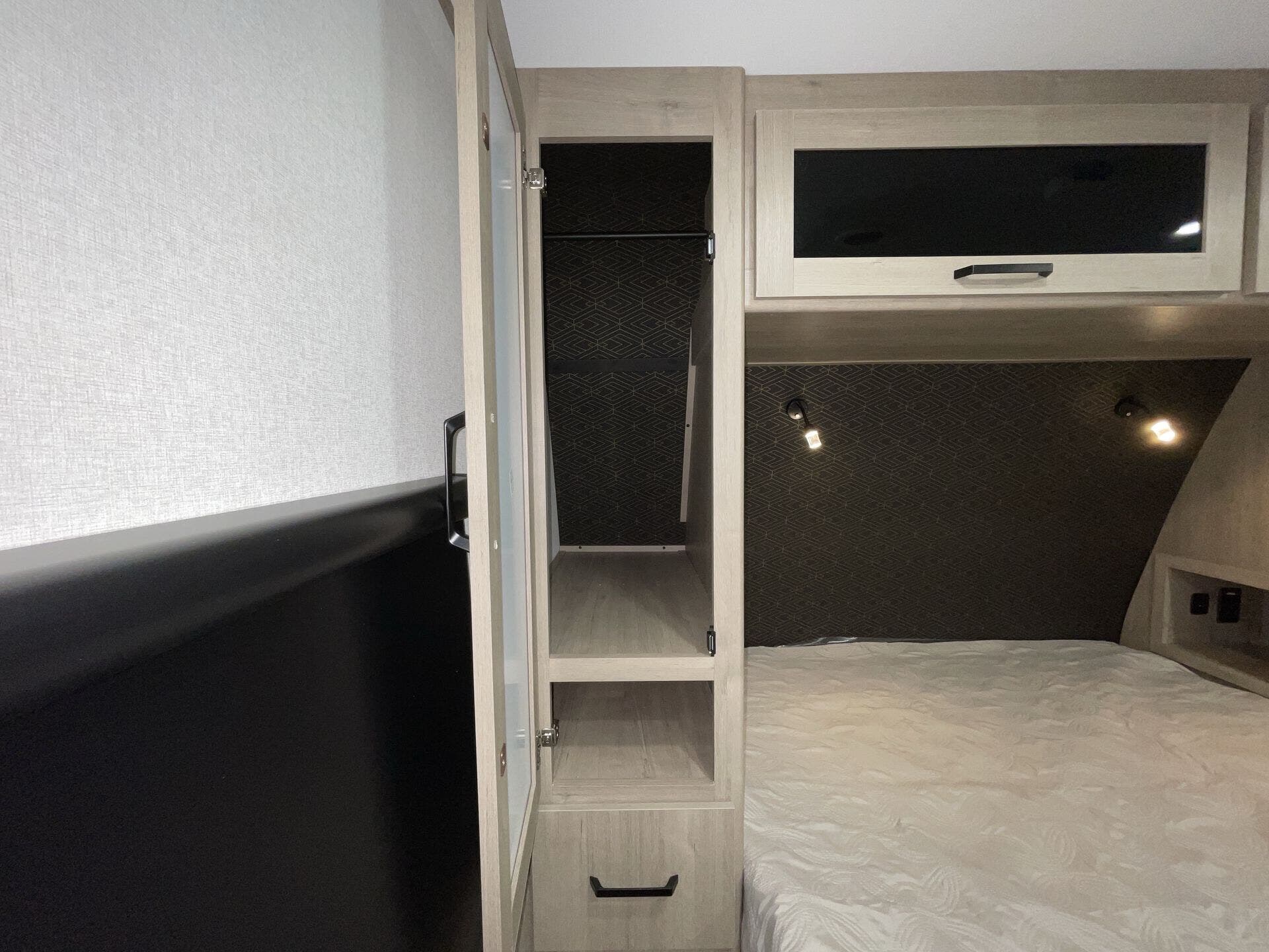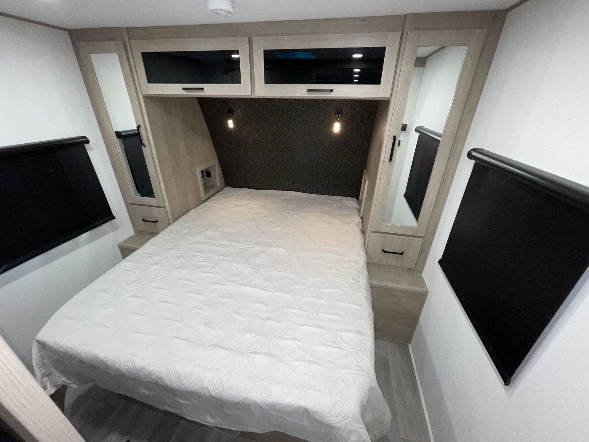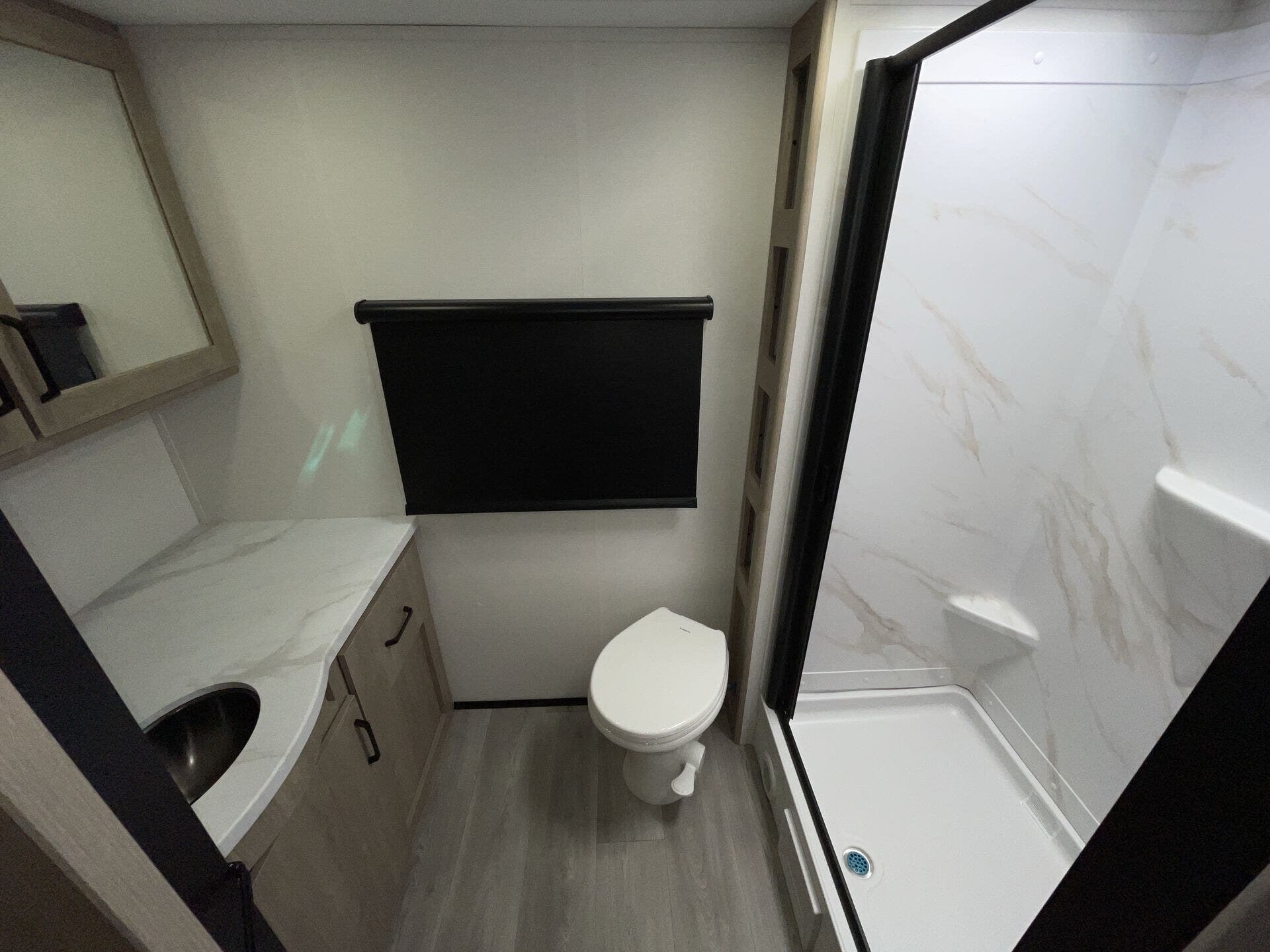 The private bedroom features a walk-around queen bed, while the oversized rear bath offers a residential-style shower for added comfort. With solar capability, climate control, and Grand Design’s durable construction, the 22RBE delivers reliable performance and comfort for every adventure.