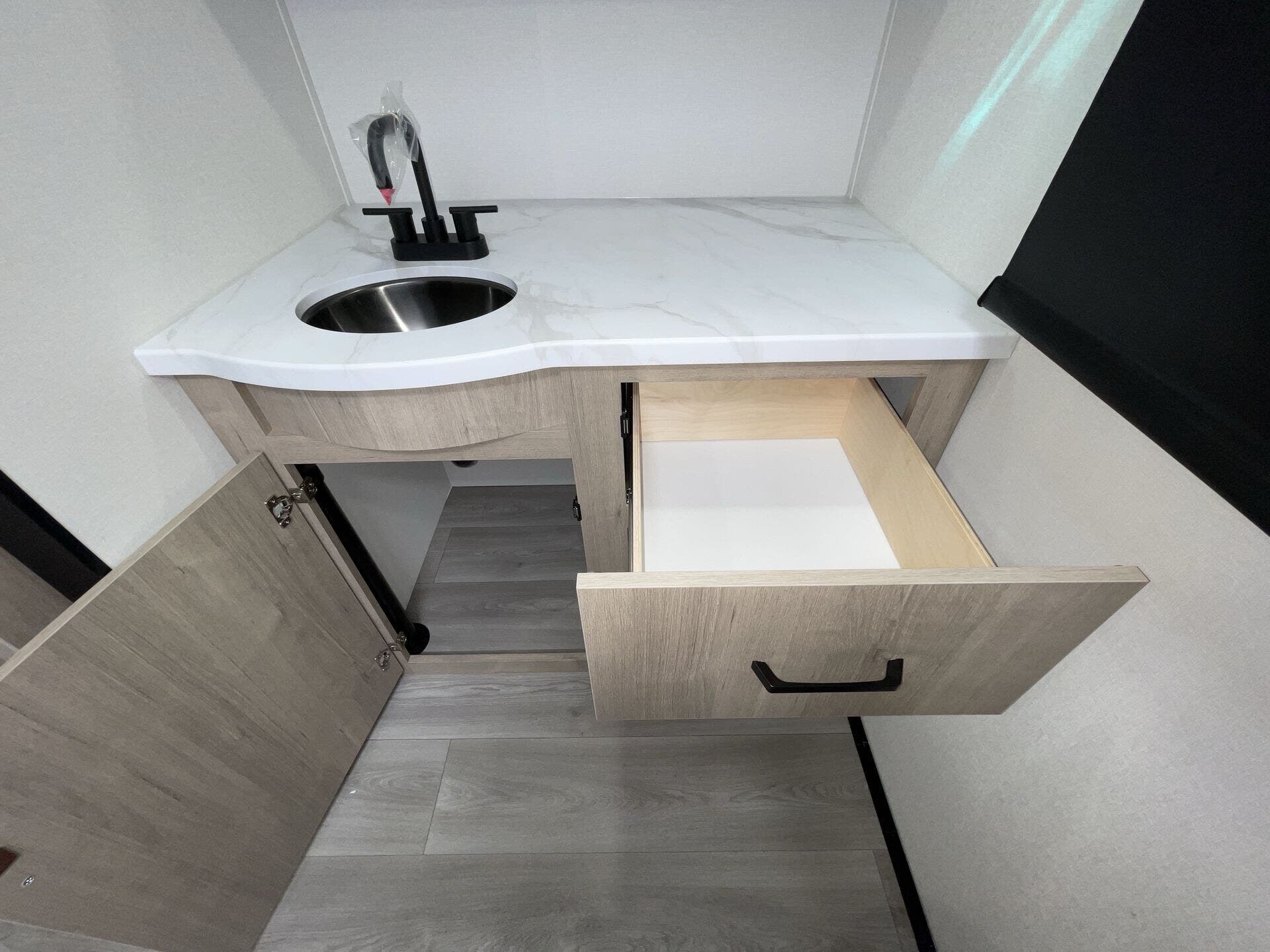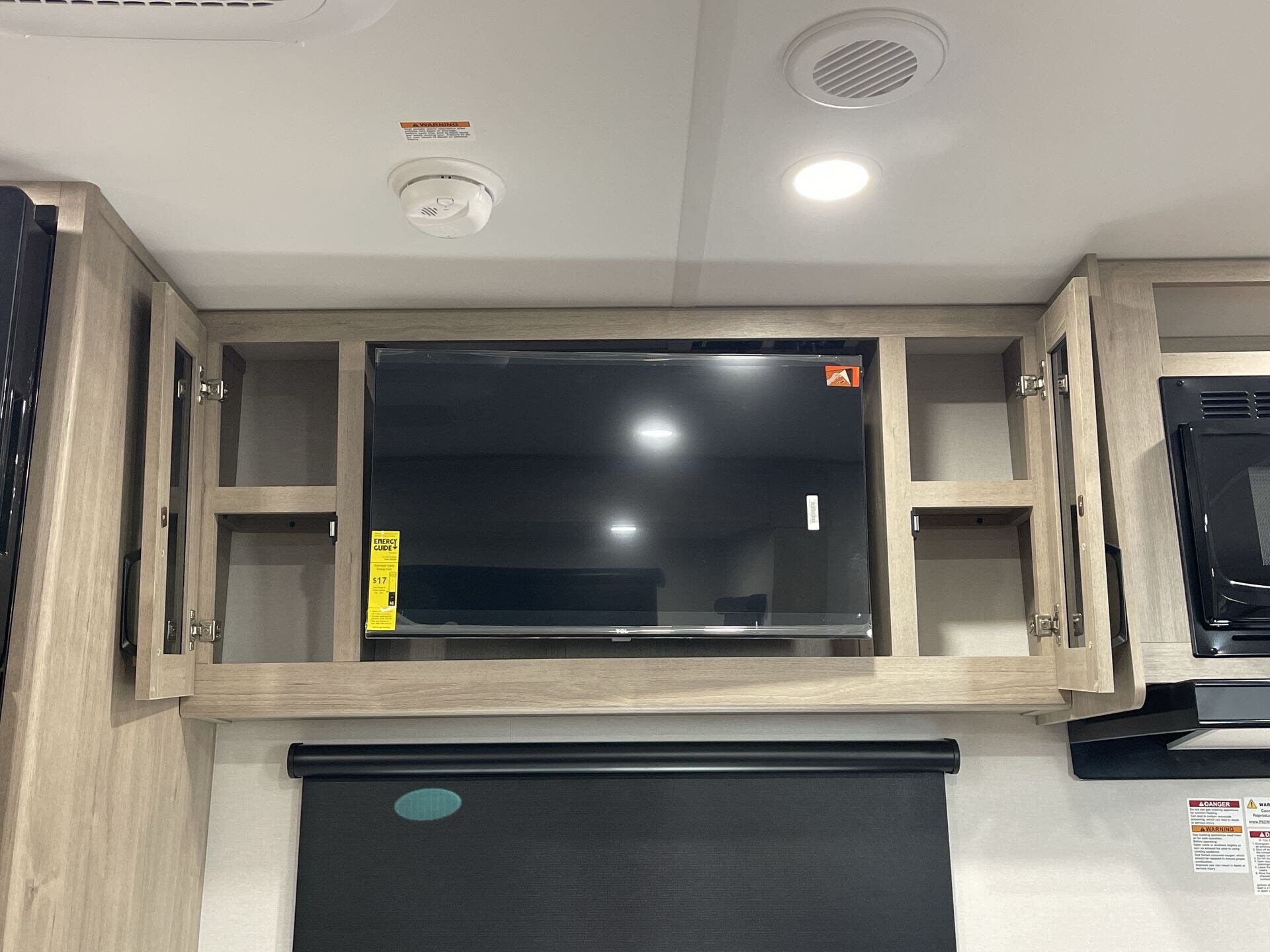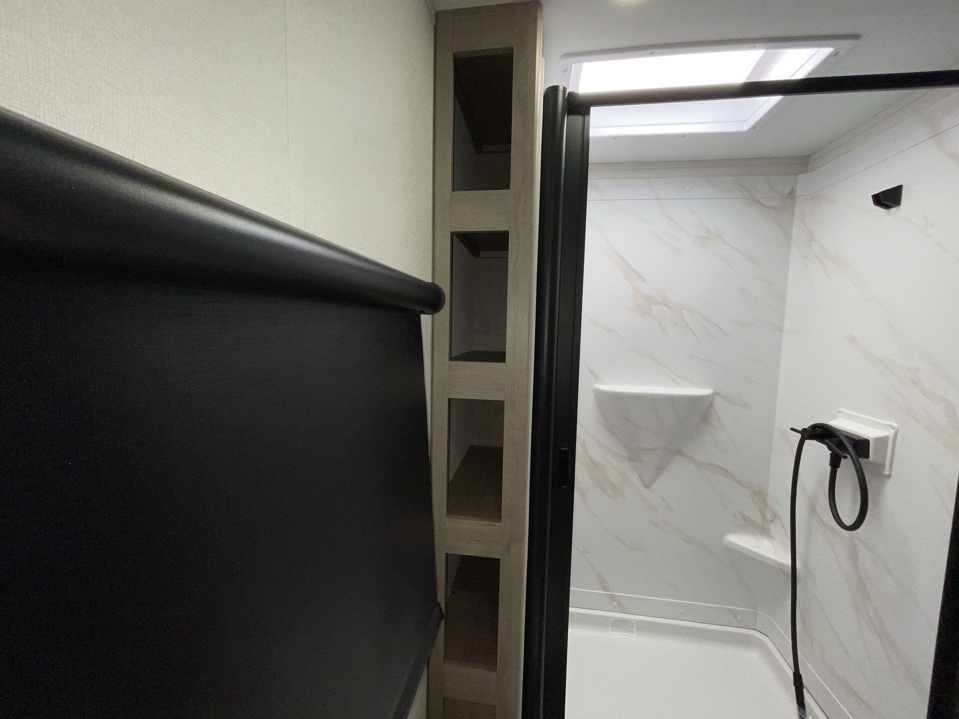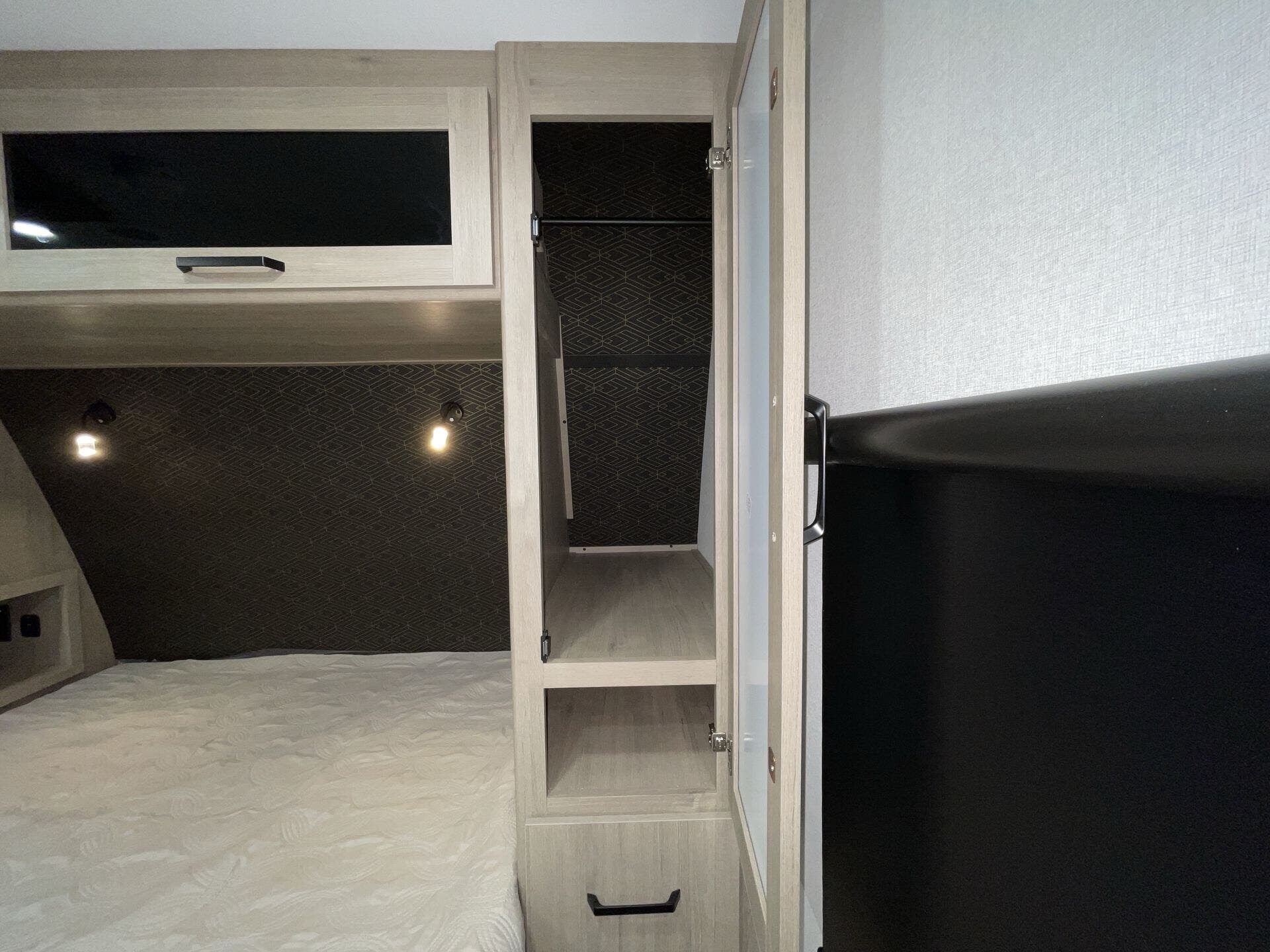 The private bedroom features a walk-around queen bed, while the oversized rear bath offers a residential-style shower for added comfort. With solar capability, climate control, and Grand Design’s durable construction, the 22RBE delivers reliable performance and comfort for every adventure.