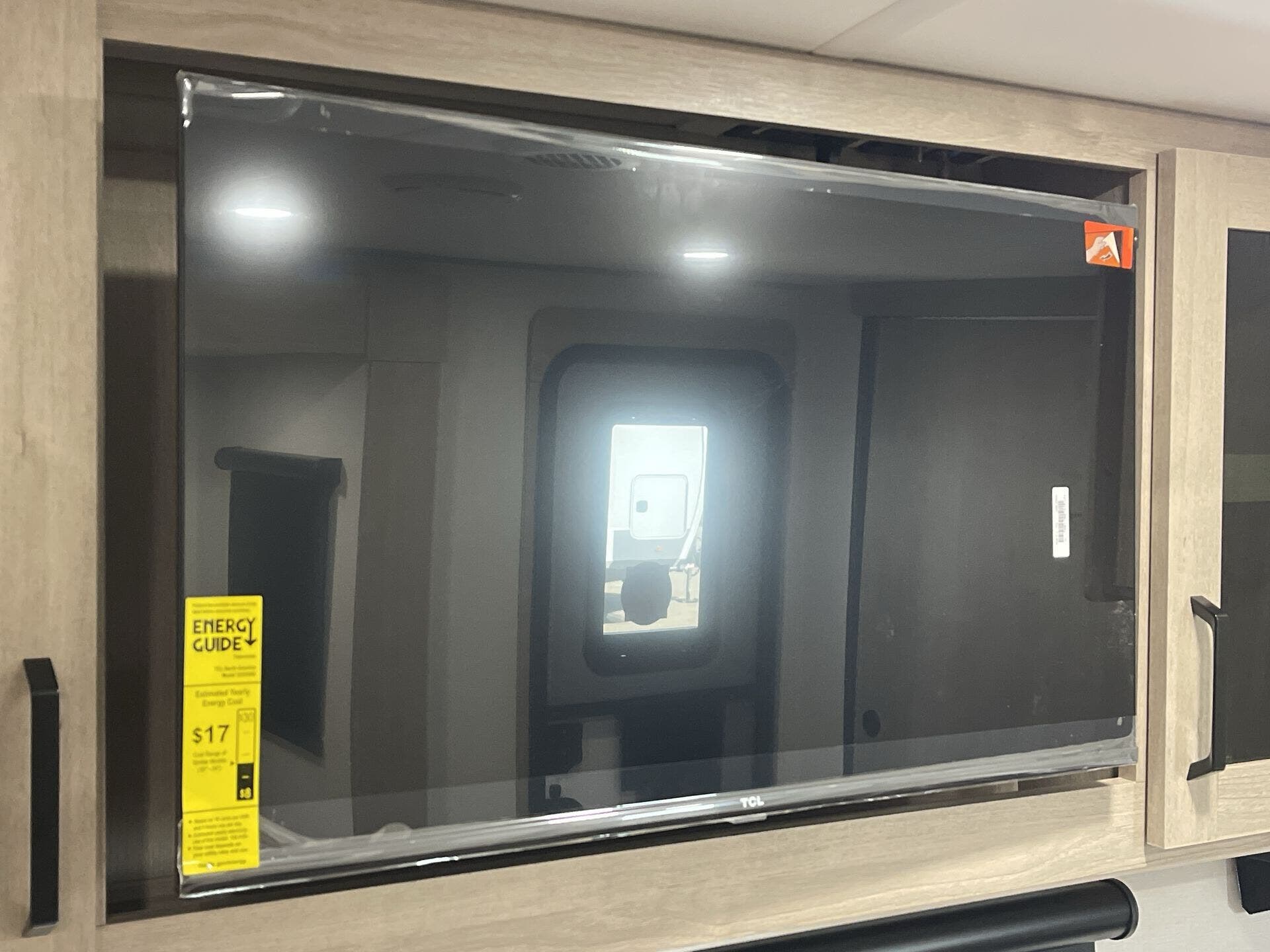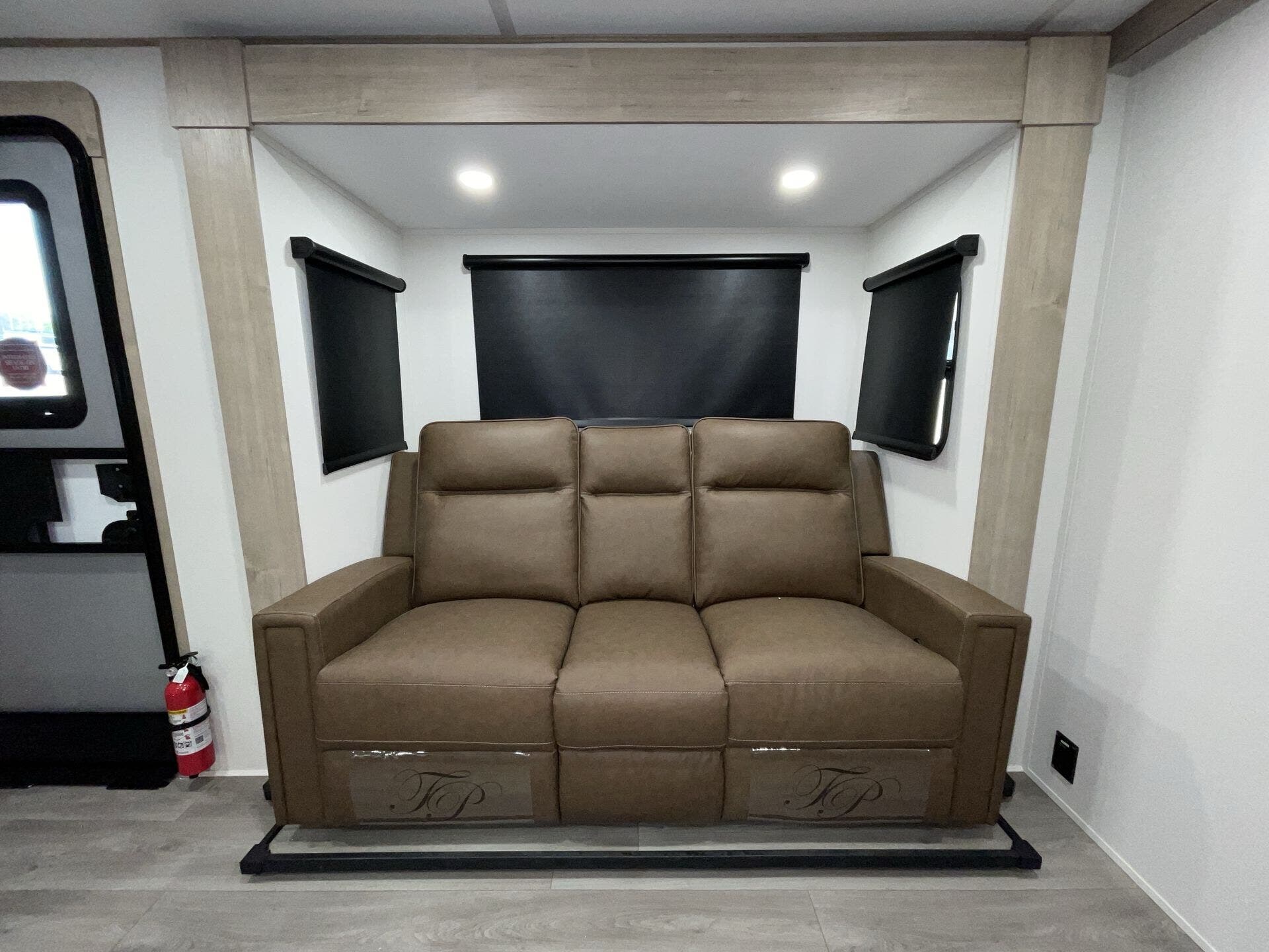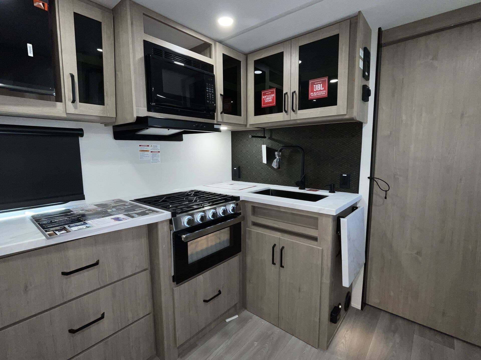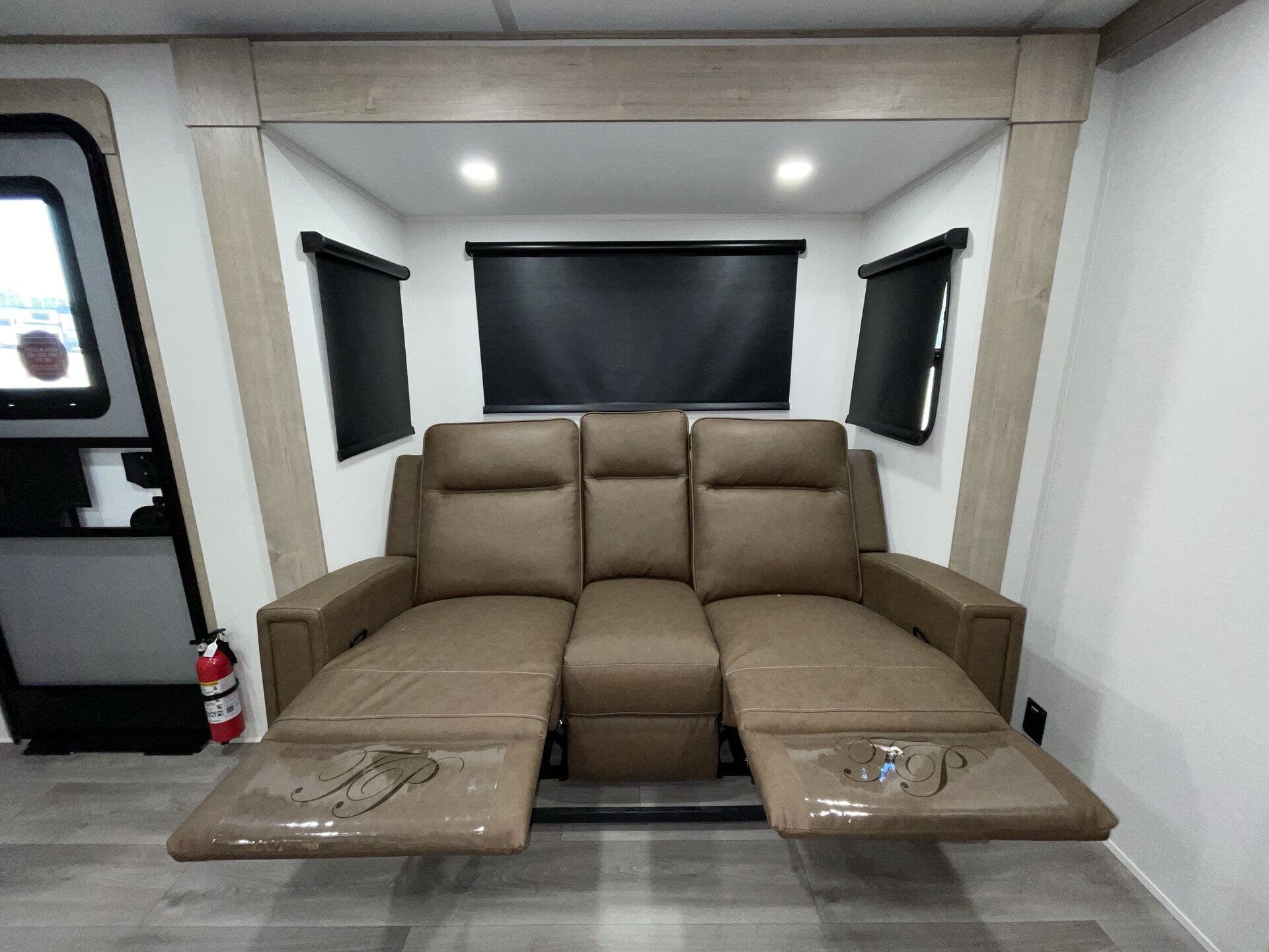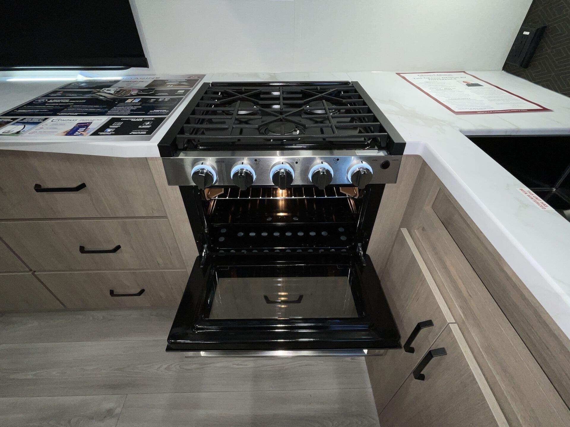 Inside, the open-concept living area is enhanced by a large panoramic window, filling the space with natural light. Relax at the theater dinette or unwind after a long day while enjoying the entertainment setup. The kitchen is fully equipped with modern appliances, including a three-burner cooktop, oven, microwave, and generous refrigerator, making meal prep simple wherever you travel.