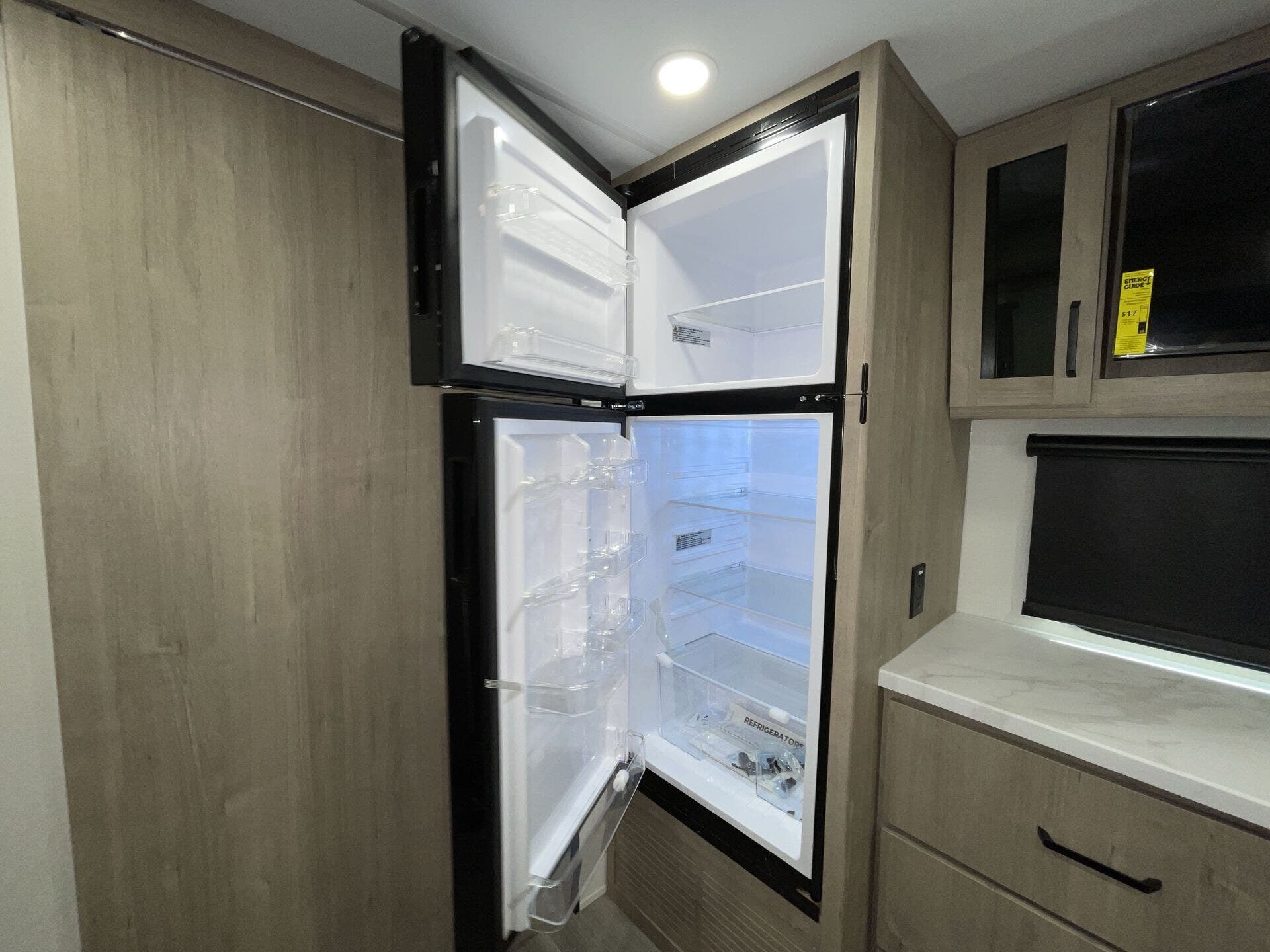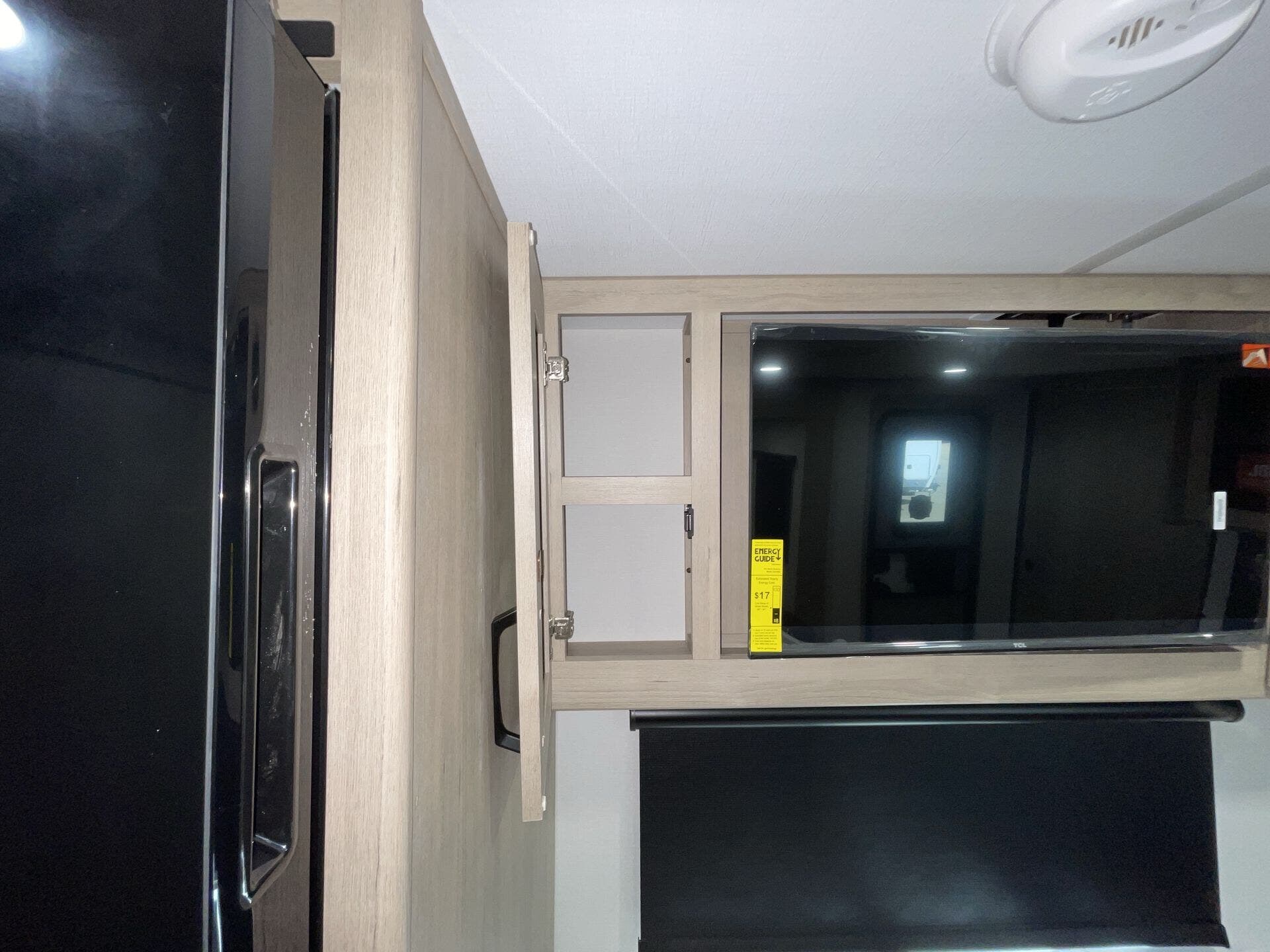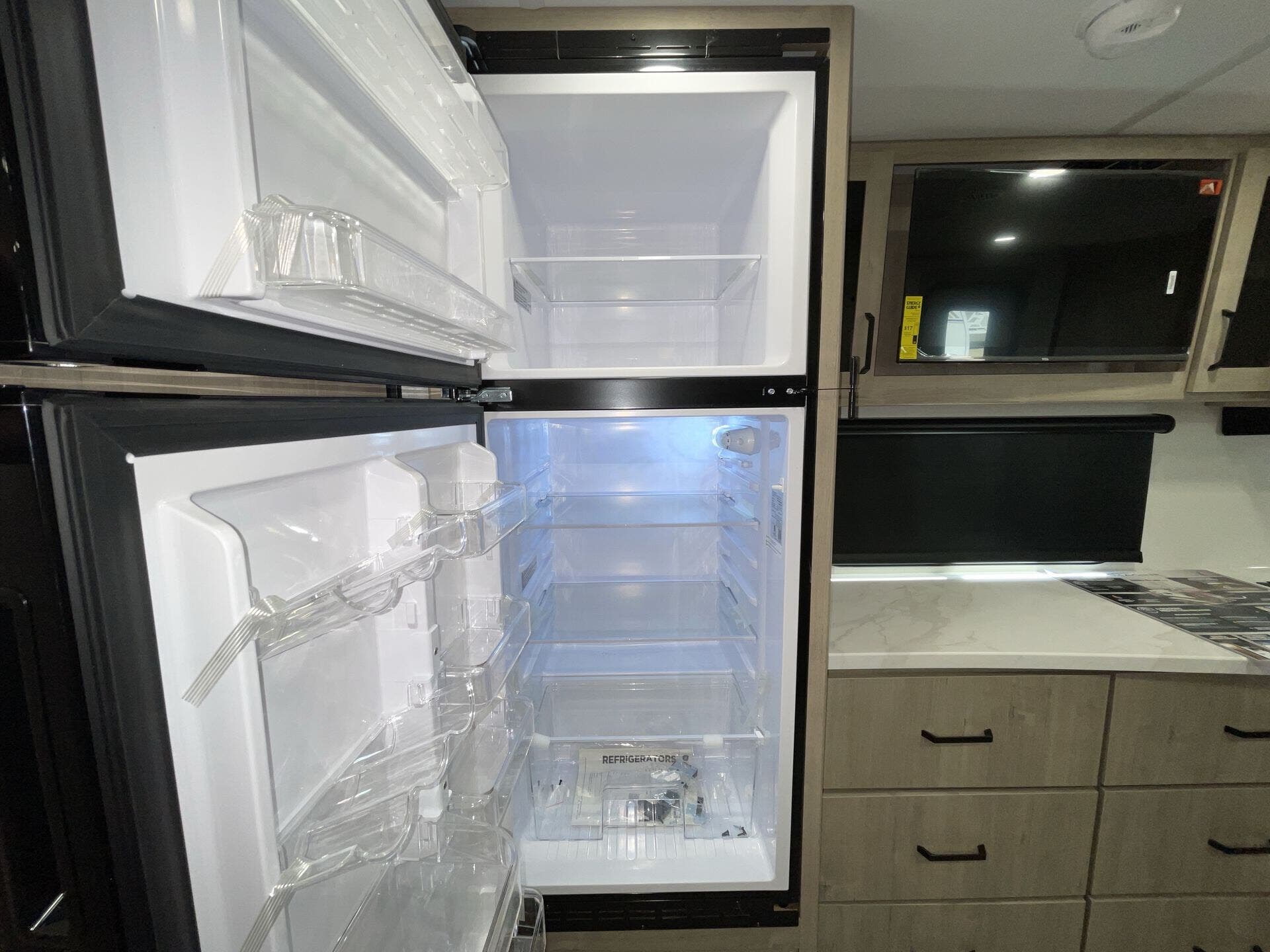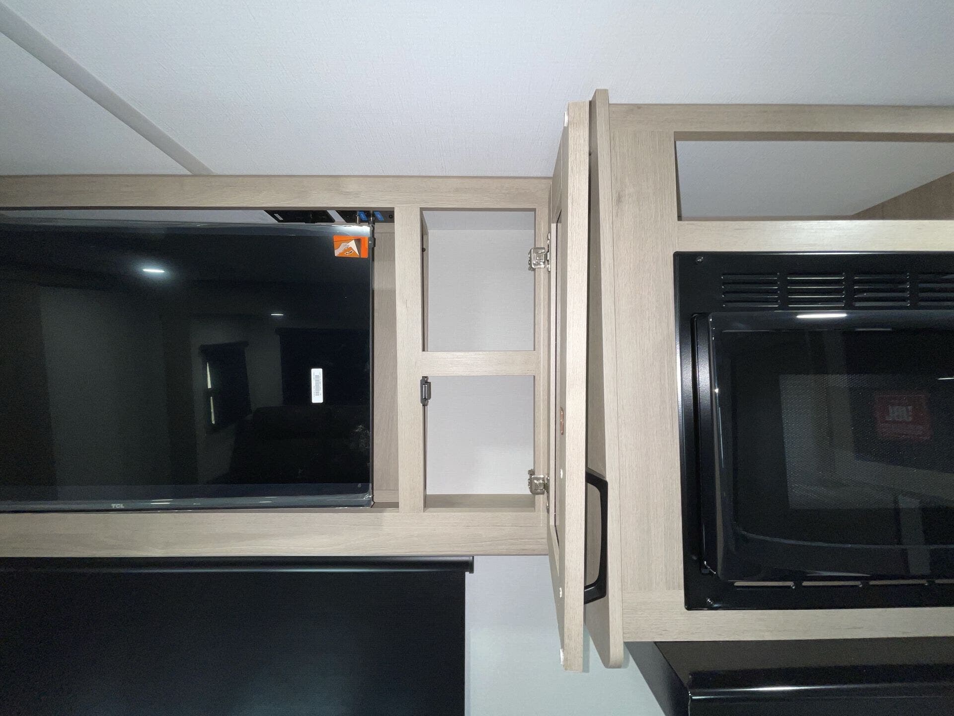 Inside, the open-concept living area is enhanced by a large panoramic window, filling the space with natural light. Relax at the theater dinette or unwind after a long day while enjoying the entertainment setup. The kitchen is fully equipped with modern appliances, including a three-burner cooktop, oven, microwave, and generous refrigerator, making meal prep simple wherever you travel.