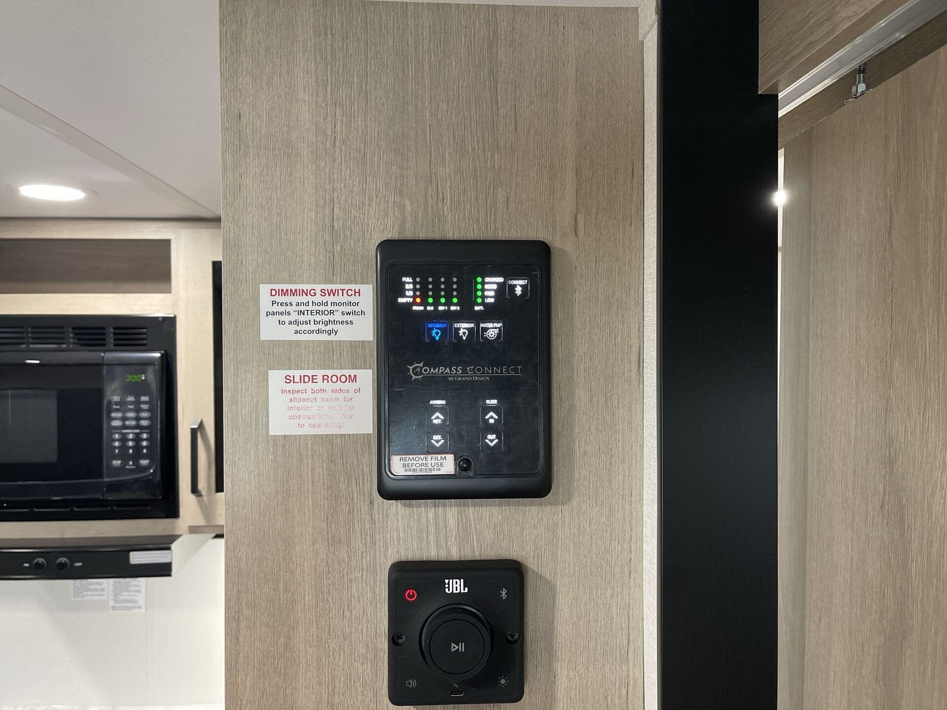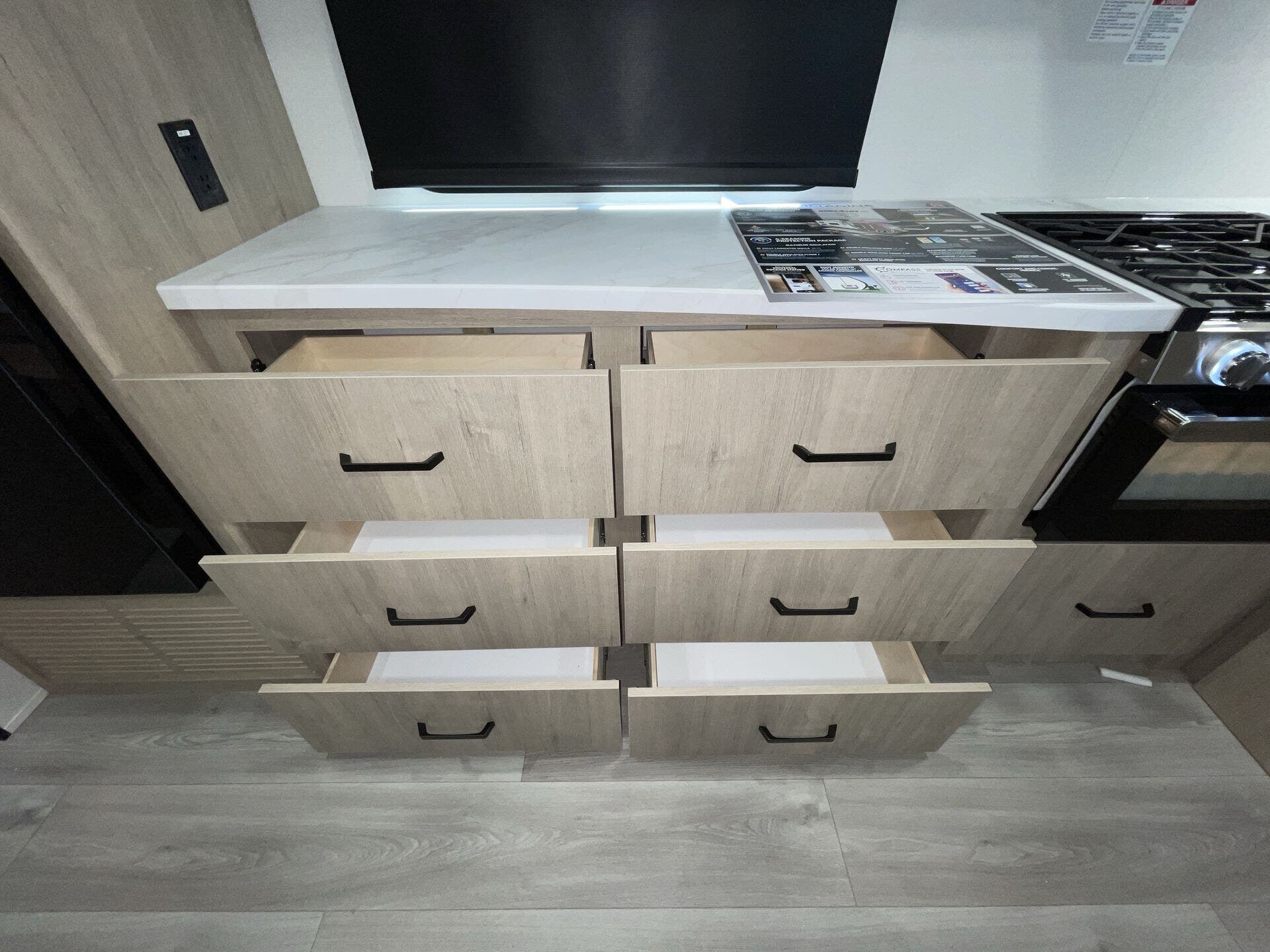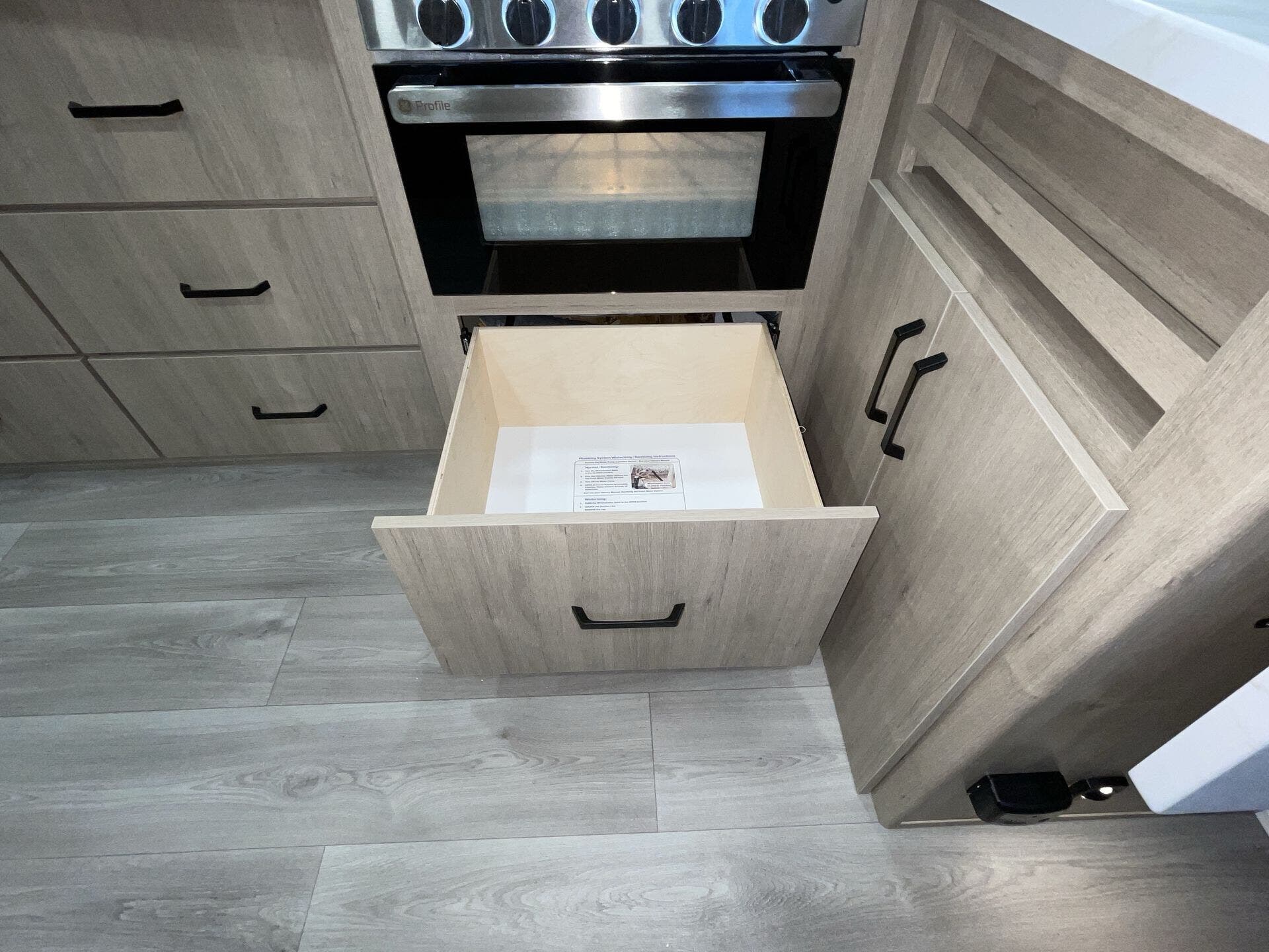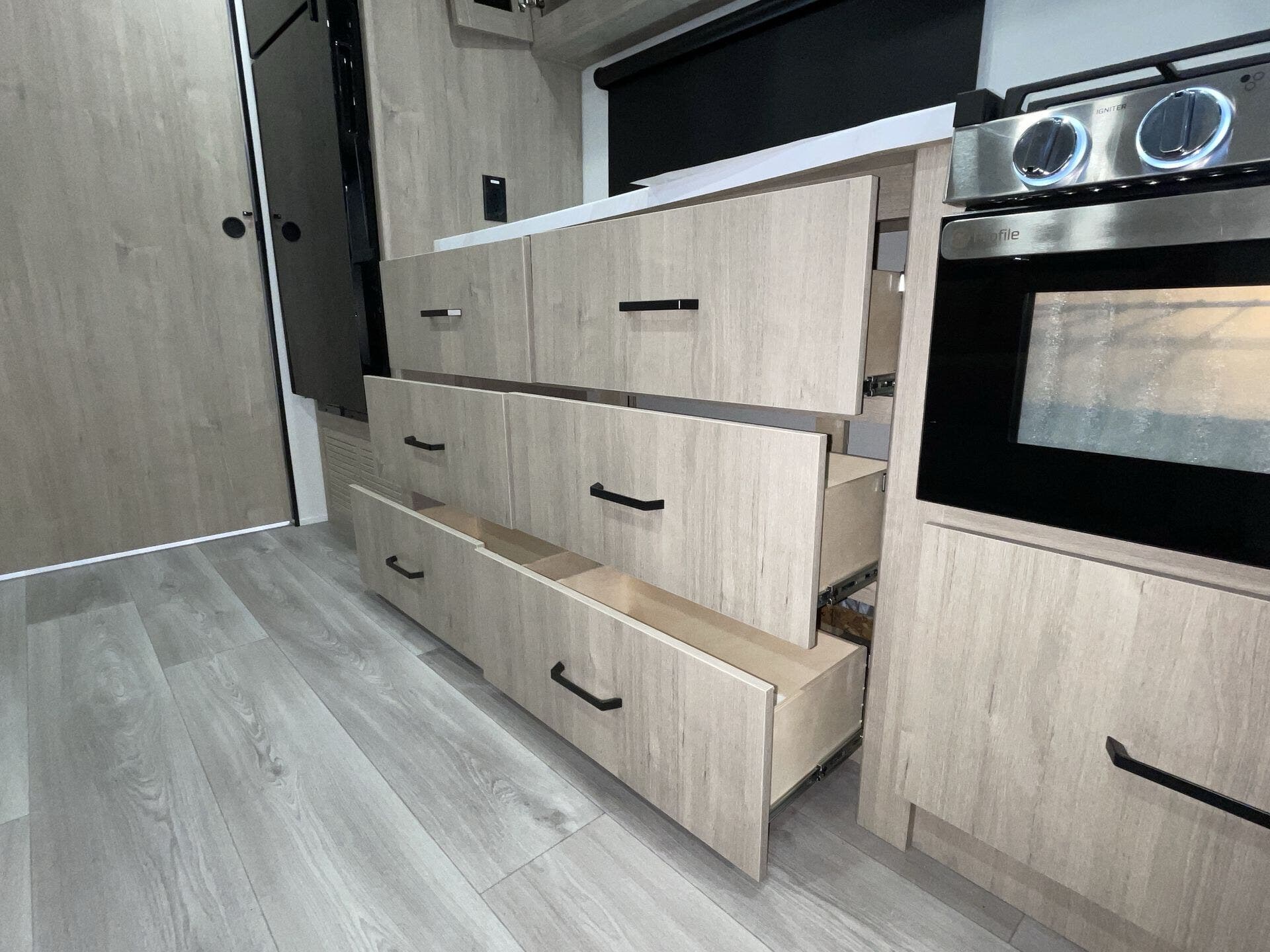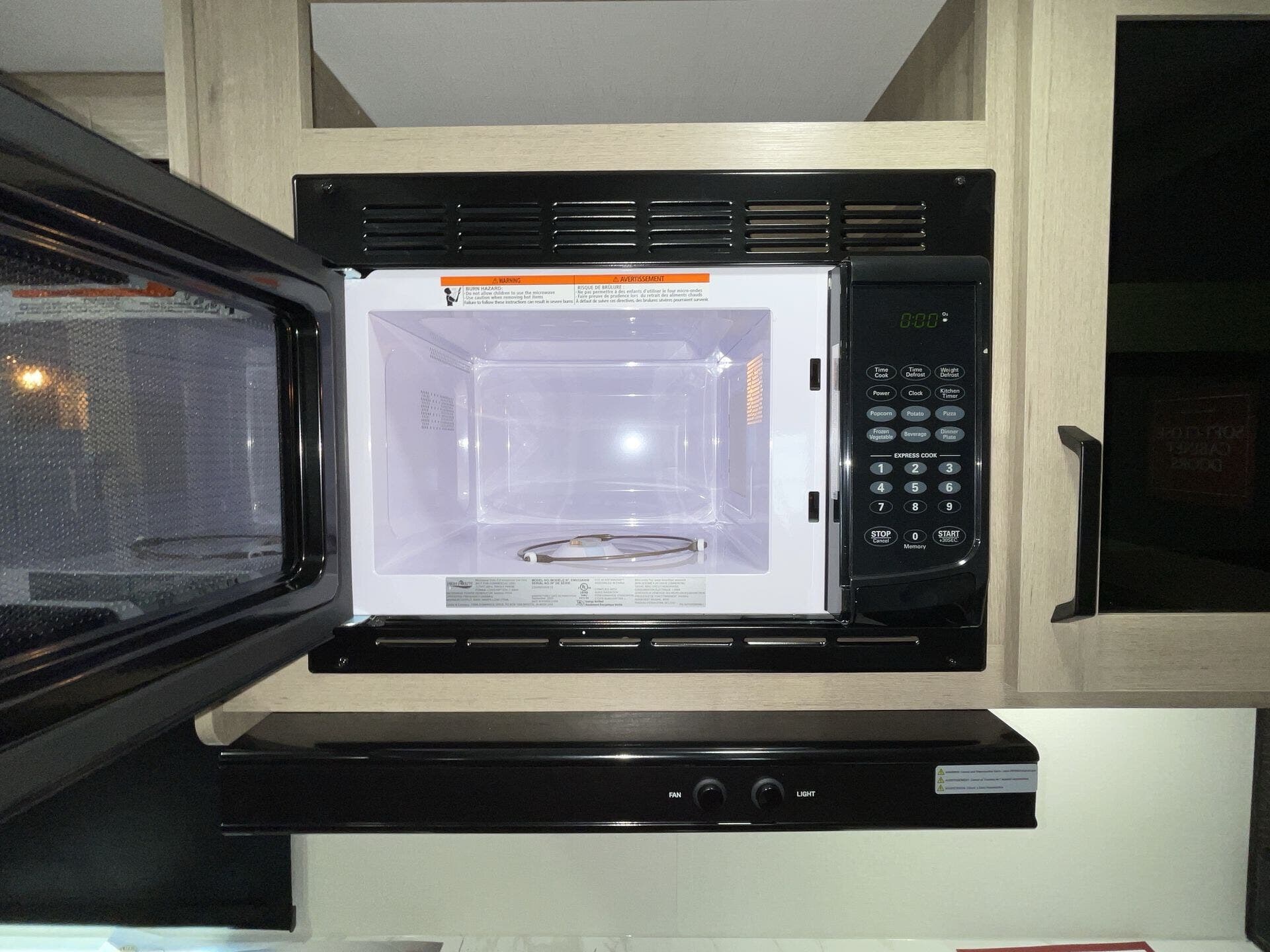 Inside, the open-concept living area is enhanced by a large panoramic window, filling the space with natural light. Relax at the theater dinette or unwind after a long day while enjoying the entertainment setup. The kitchen is fully equipped with modern appliances, including a three-burner cooktop, oven, microwave, and generous refrigerator, making meal prep simple wherever you travel.