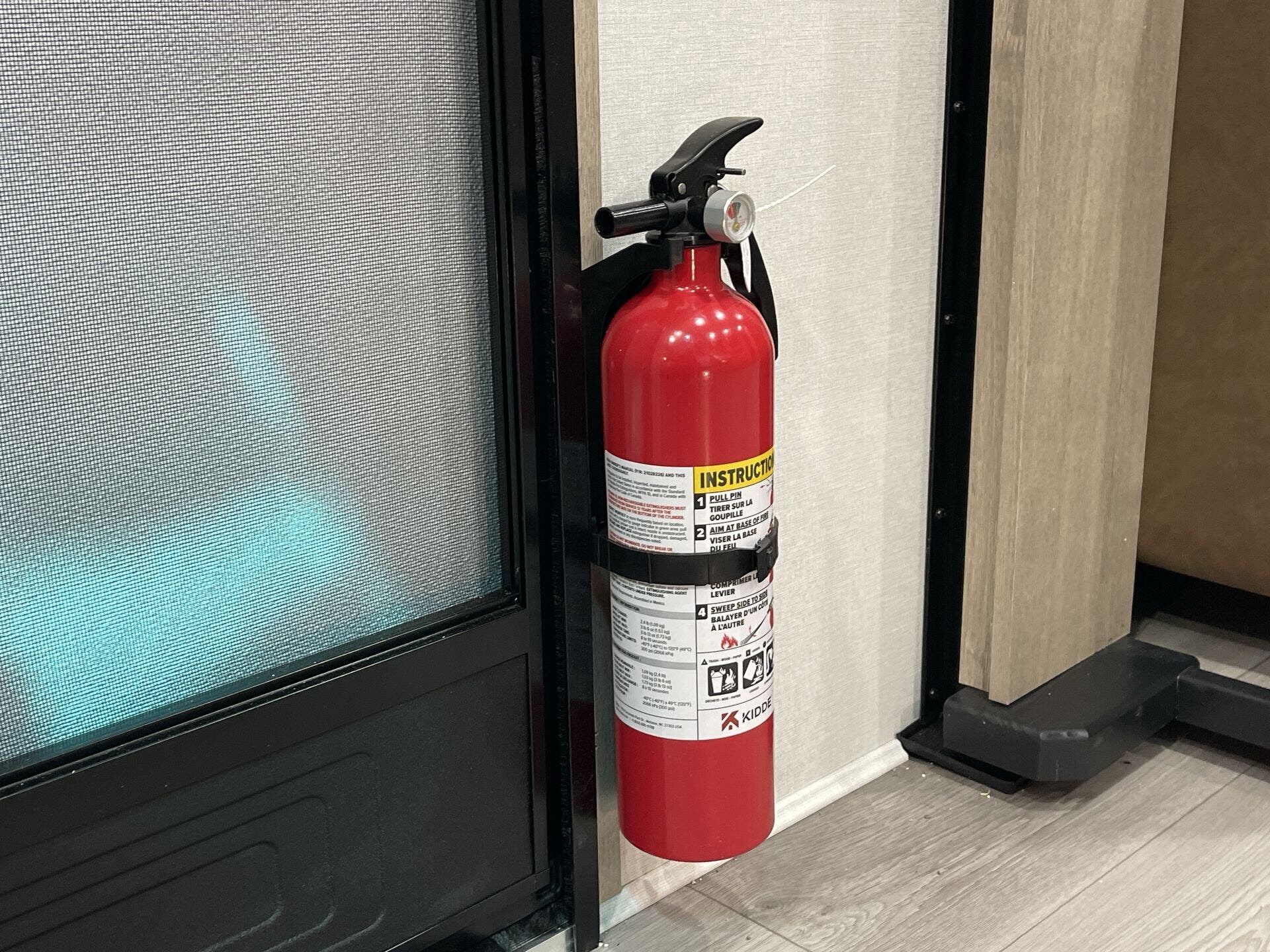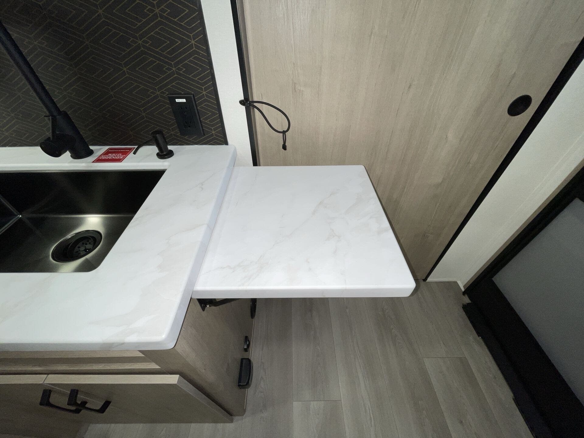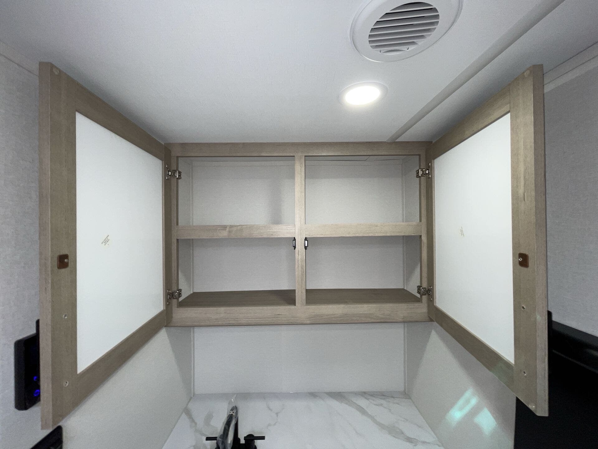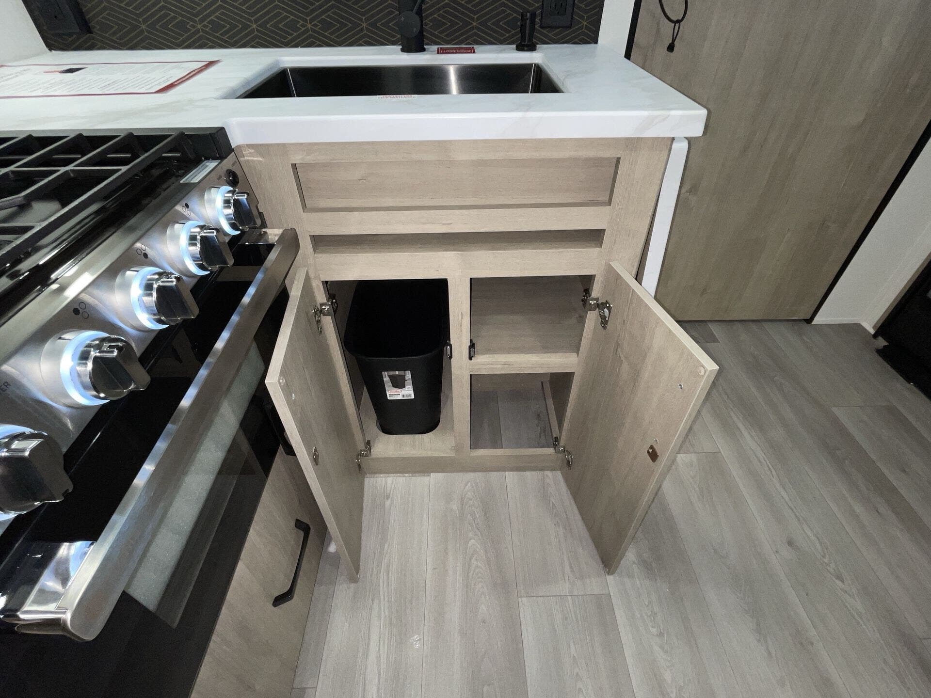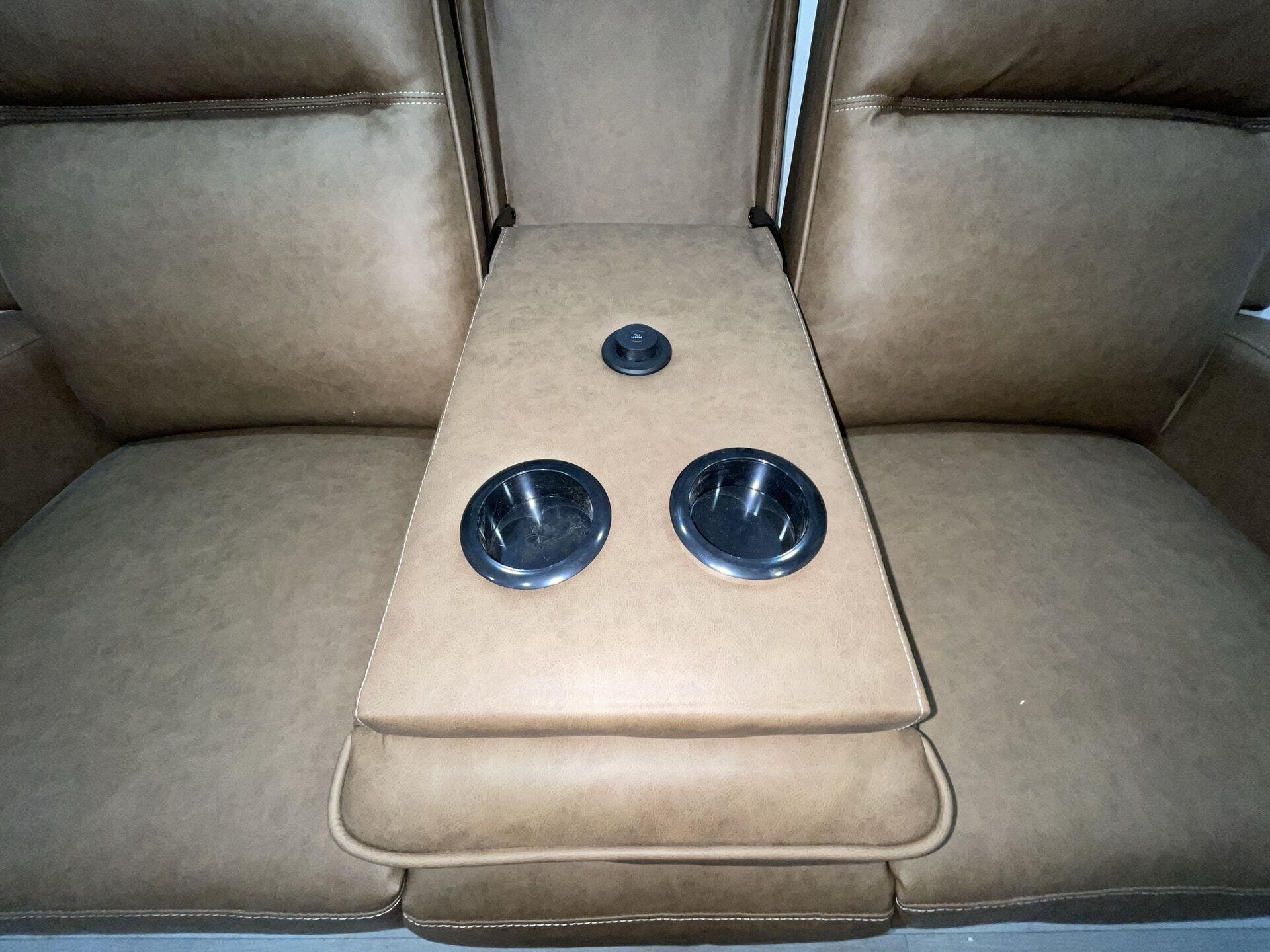 Inside, the open-concept living area is enhanced by a large panoramic window, filling the space with natural light. Relax at the theater dinette or unwind after a long day while enjoying the entertainment setup. The kitchen is fully equipped with modern appliances, including a three-burner cooktop, oven, microwave, and generous refrigerator, making meal prep simple wherever you travel.