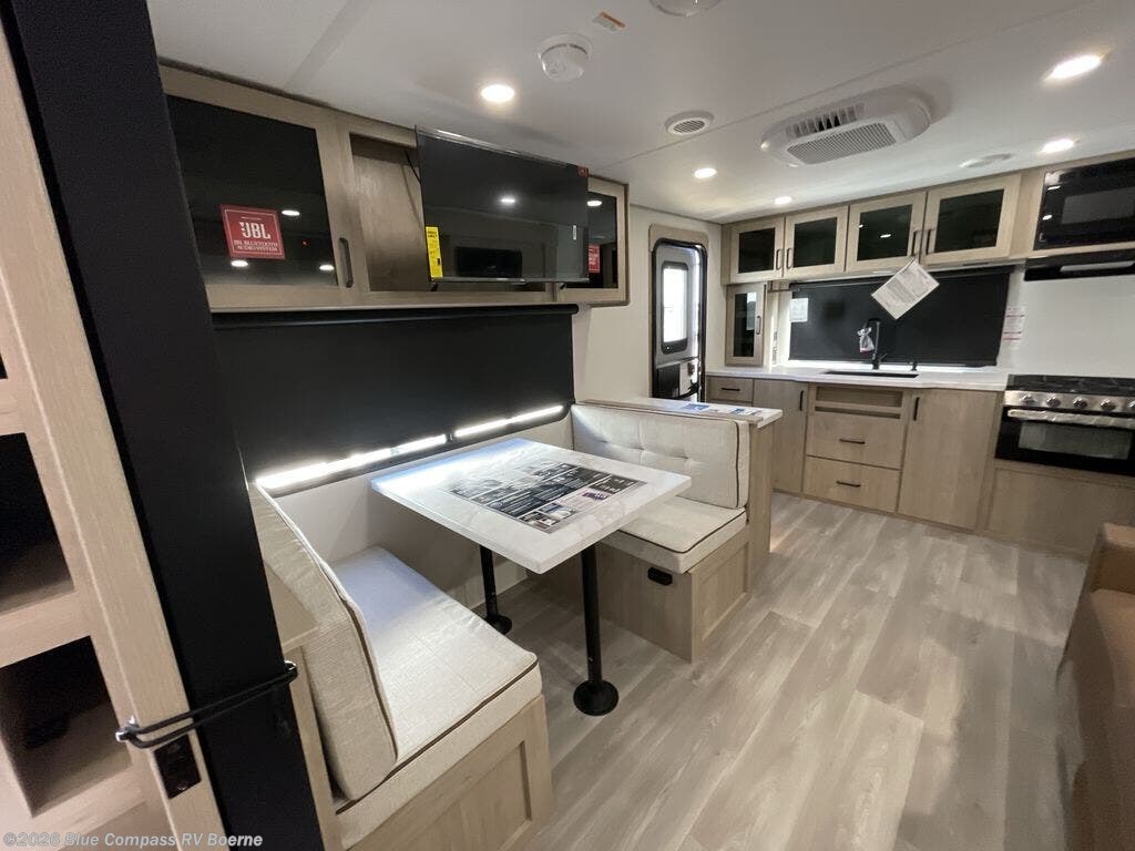 Treat yourself to a weekend of fun in this Imagine XLS travel trailer! Whether it's just you and your spouse, or you've chosen to bring along a group of friends, this trailer will meet your needs. The front bedroom can sleep two people on the walk-around queen-size bed. The bedroom is quite functional because it not only contains the second exterior entry door, but it also has a private entrance into the walk-through bathroom since it is located on the other side of the bathroom. The booth dinette is functional too because it can transform from a dining location into a sleeping location, and the theater seating is directly across from the LED TV for easy viewing. The rear kitchen is fit for the chef on the trip, it features residential countertops, a stainless-steel sink and a 3-burner range with oven for you to cook your meals in comfort.