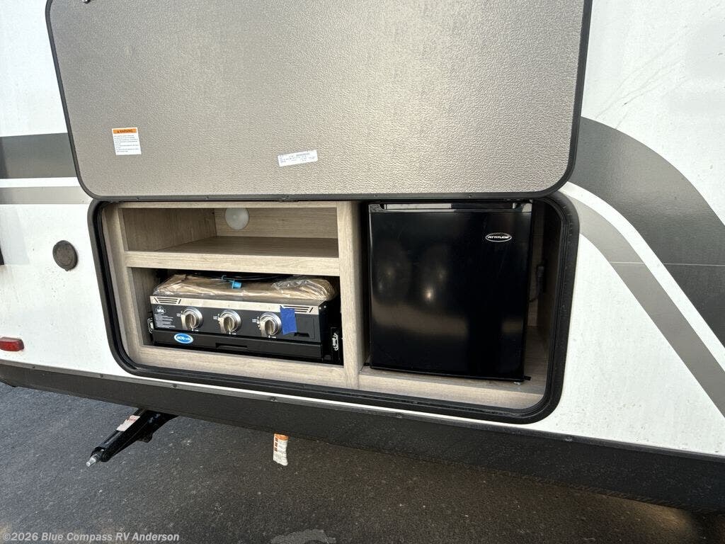 The dual entry doors make it easy to enter and exit this travel trailer! You will find a walk-around queen-size bed up front in the private bedroom, and one of the entry/exit doors to the unit so you can quietly slip out for an early morning fishing trip. The U-shaped dinette is right next to the window, so you can look out at your surroundings while you enjoy breakfast. The double-size bunks have some privacy curtains, and the bunks are right next to the full bathroom for easy access in the middle of the night. The fully equipped kitchen has everything you need to get dinner in the oven, and you can have some more prep space by using the flip-up countertop extension. You even have an outdoor griddle and an outdoor 1.6 cu. ft. refrigerator to enjoy a cold beverage while you cook under the 22' electric awning!