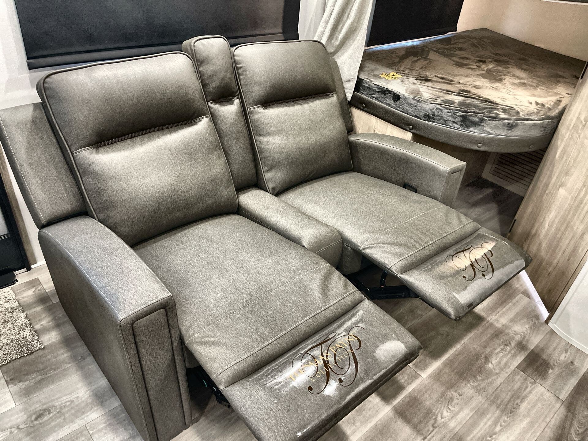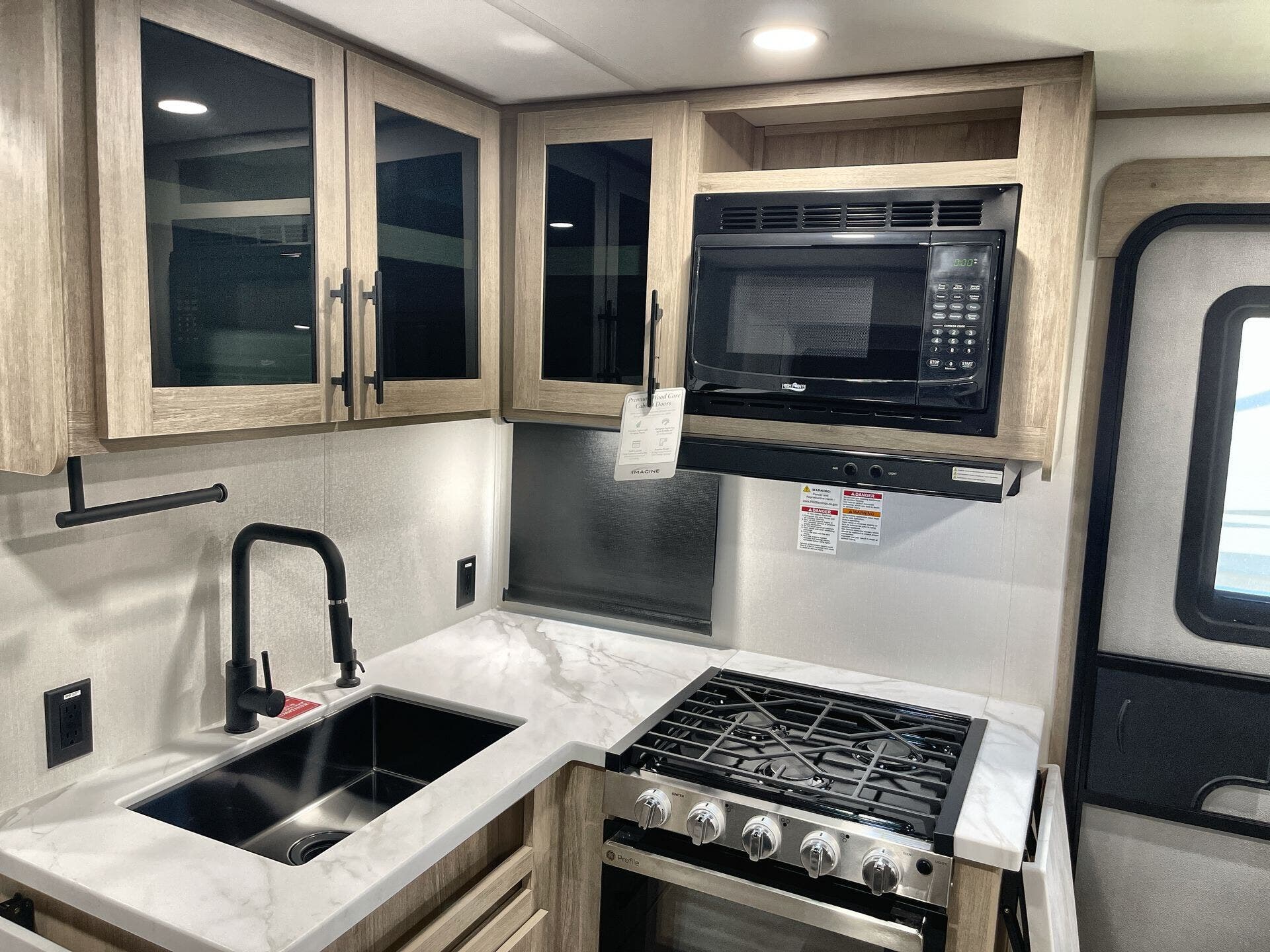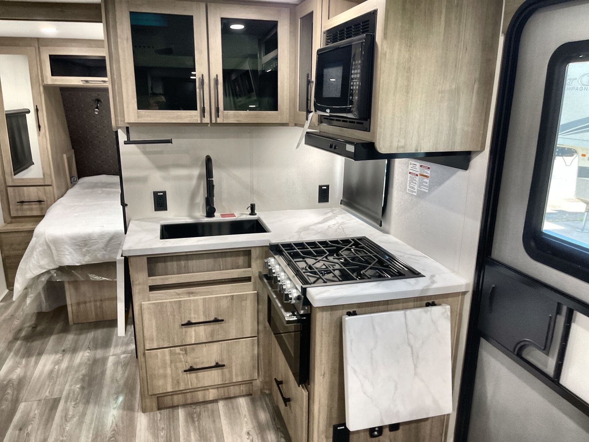 The kitchen is fully equipped with a three-burner cooktop, oven, microwave, large refrigerator, and spacious countertops, making meal preparation effortless. The midship bathroom includes a walk-in shower, vanity, and linen storage for convenience.