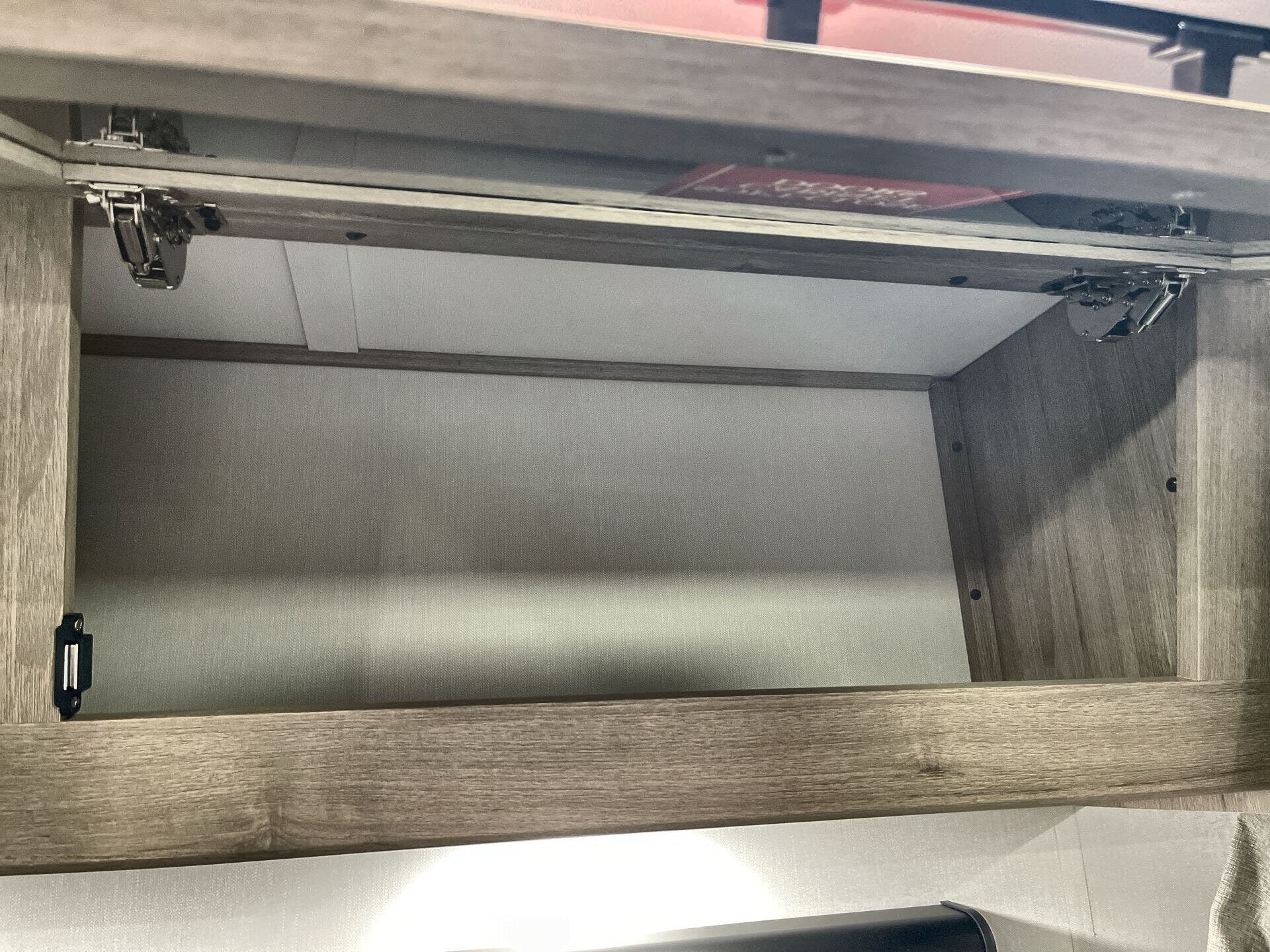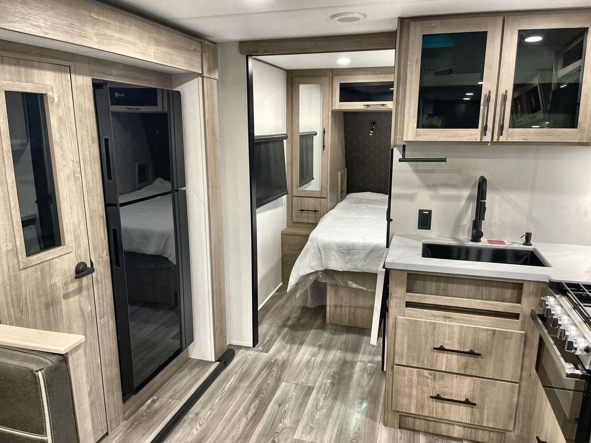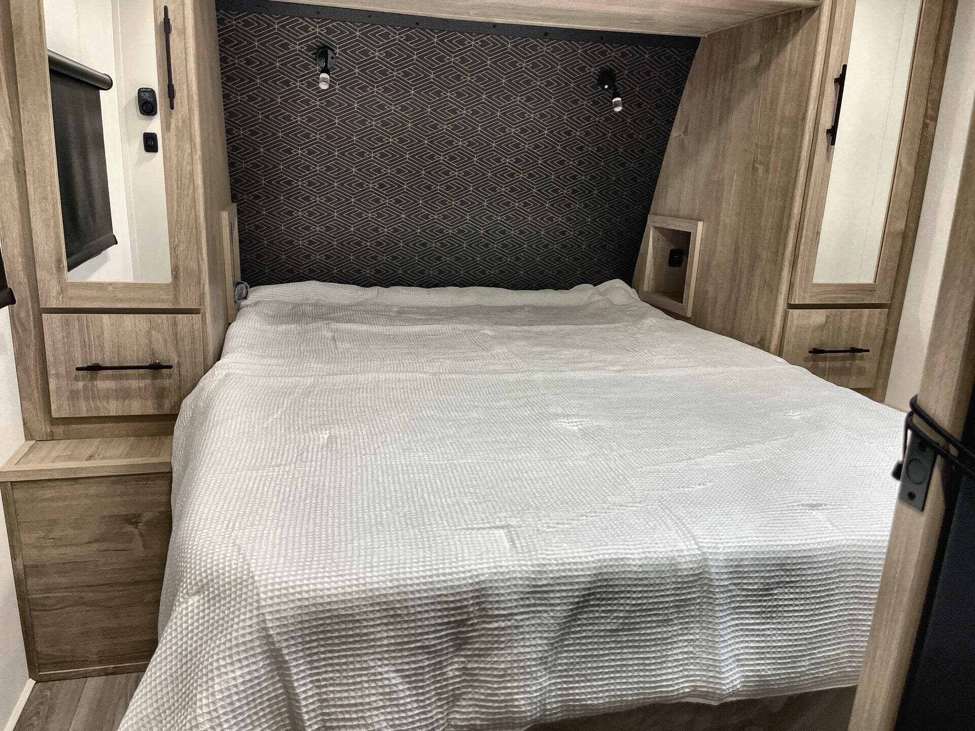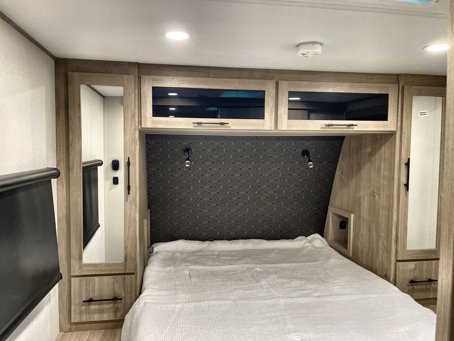 The 25DBE features a thoughtfully designed floor plan with sleeping accommodations for up to eight. A private master bedroom at the front offers a walkaround queen bed with overhead storage and bedside wardrobes, ensuring comfort and privacy. In the rear, double-over-double bunks provide ample space for kids or guests, while the convertible dinette and tri-fold sofa offer additional sleeping options.