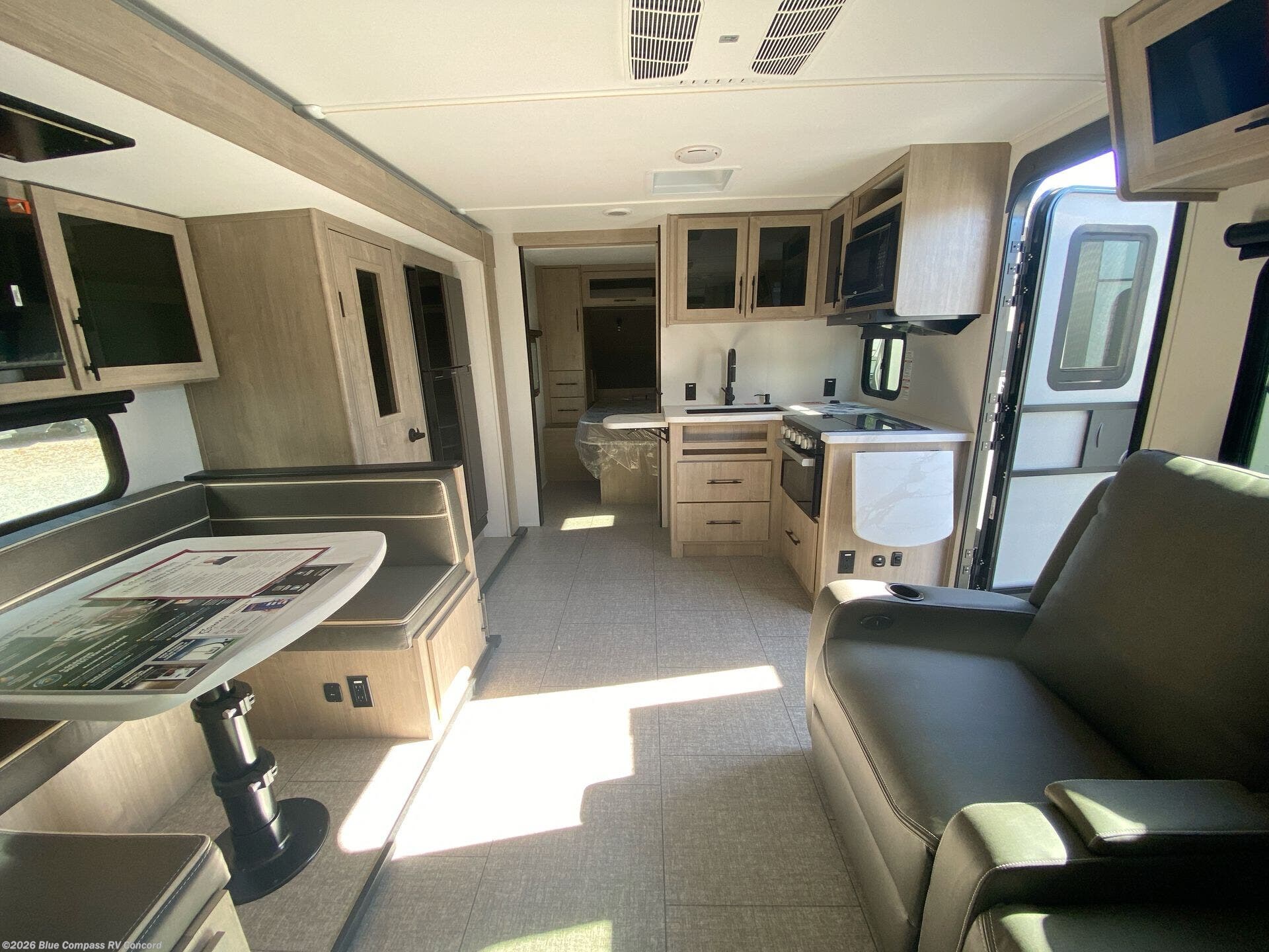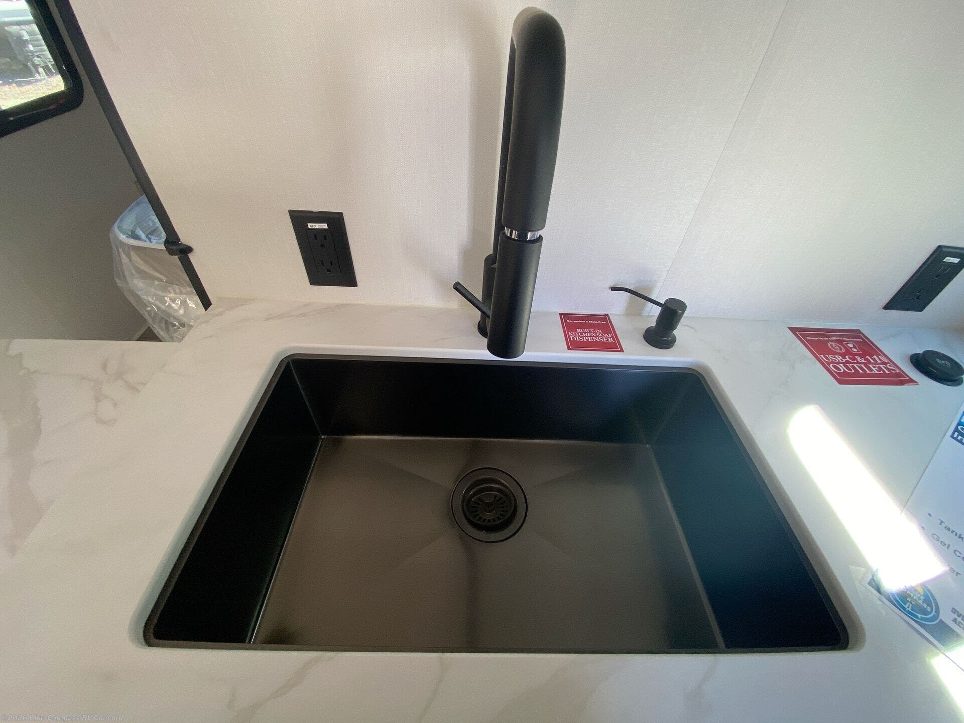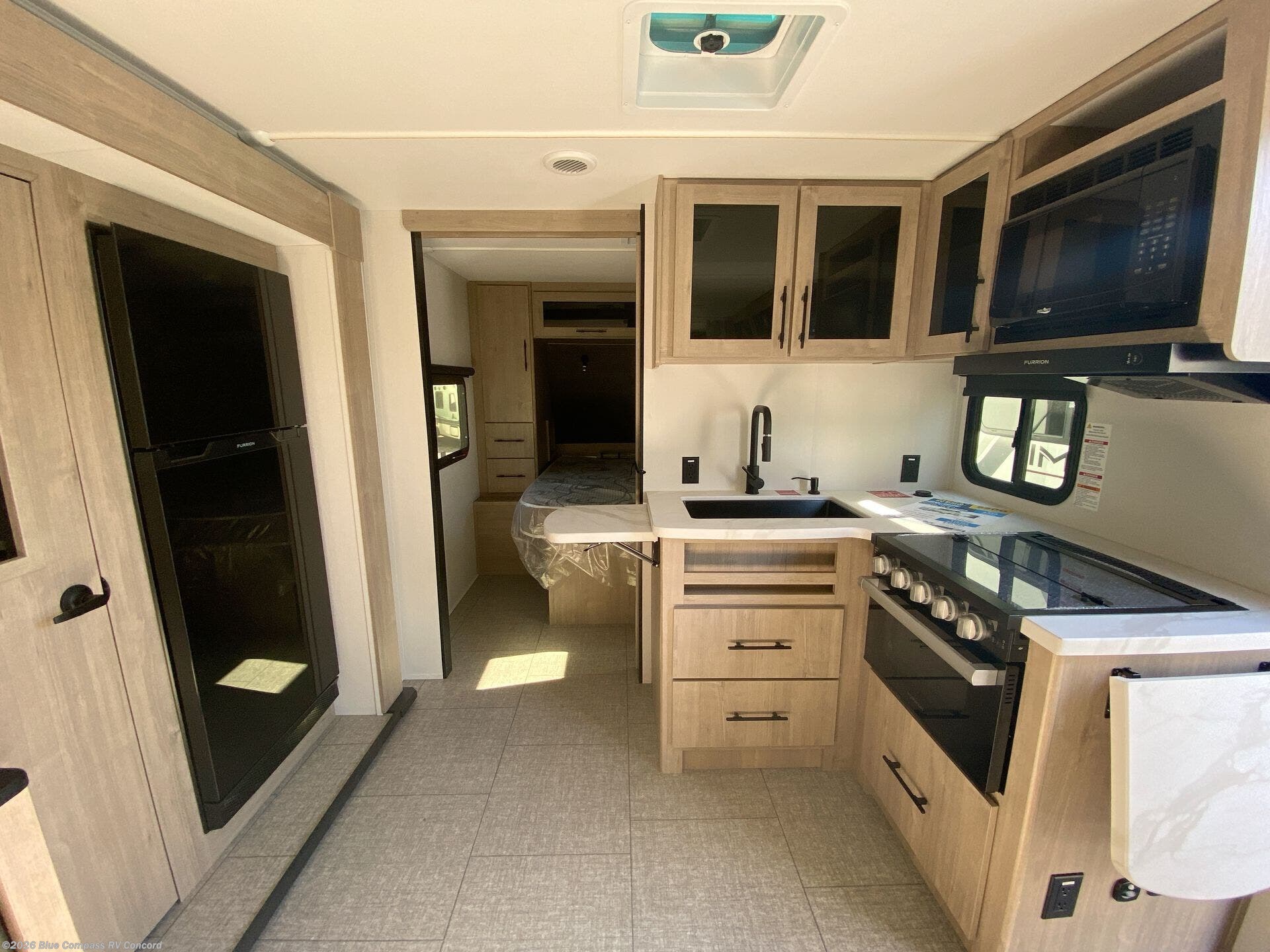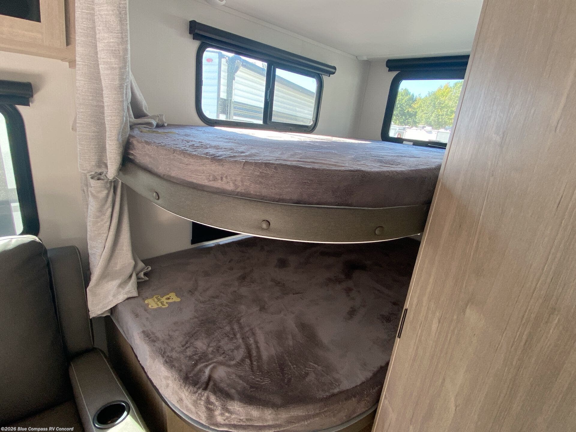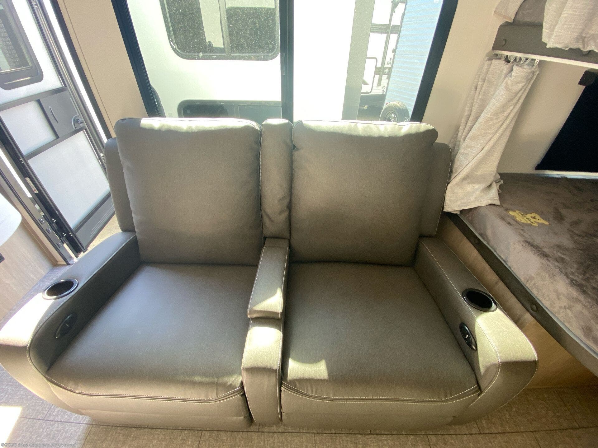 The dual entry doors make it easy to enter and exit this travel trailer! You will find a walk-around queen-size bed up front in the private bedroom, and one of the entry/exit doors to the unit so you can quietly slip out for an early morning fishing trip. The U-shaped dinette is right next to the window, so you can look out at your surroundings while you enjoy breakfast. The double-size bunks have some privacy curtains, and the bunks are right next to the full bathroom for easy access in the middle of the night. The fully equipped kitchen has everything you need to get dinner in the oven, and you can have some more prep space by using the flip-up countertop extension. You even have an outdoor griddle and an outdoor 1.6 cu. ft. refrigerator to enjoy a cold beverage while you cook under the 22' electric awning!