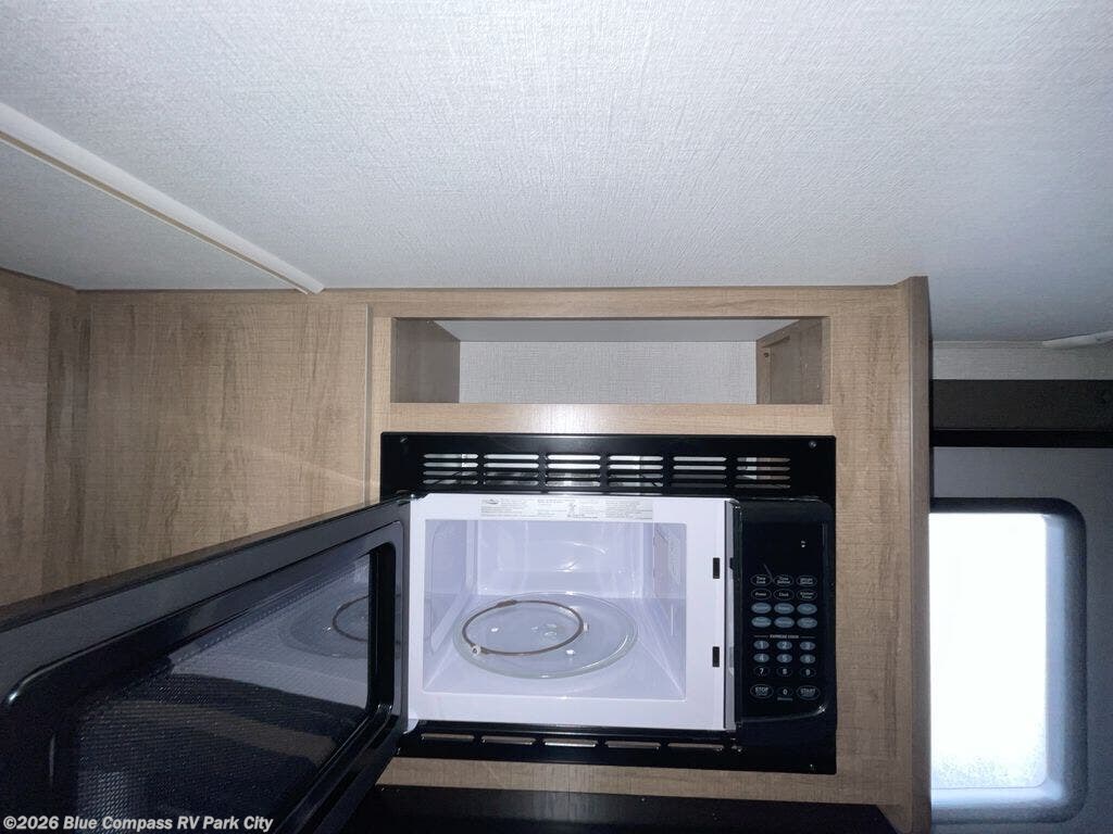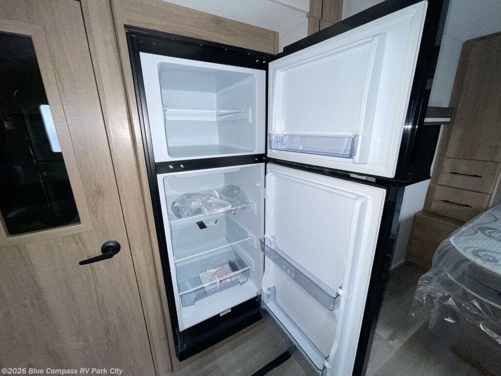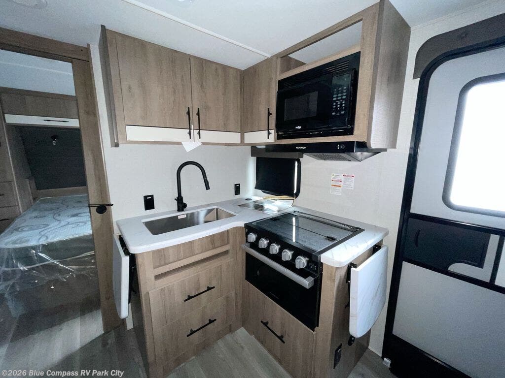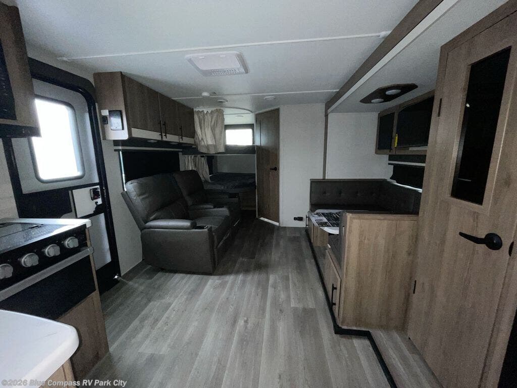 The dual entry doors make it easy to enter and exit this travel trailer! You will find a walk-around queen-size bed up front in the private bedroom, and one of the entry/exit doors to the unit so you can quietly slip out for an early morning fishing trip. The U-shaped dinette is right next to the window, so you can look out at your surroundings while you enjoy breakfast. The double-size bunks have some privacy curtains, and the bunks are right next to the full bathroom for easy access in the middle of the night. The fully equipped kitchen has everything you need to get dinner like a 3 burner range with oven and microwave, and you can have some more prep space by using the flip-up countertop extension. You even have an outdoor griddle and an outdoor 1.6 cu. ft. refrigerator to enjoy a cold beverage while you cook under the 22' electric awning!