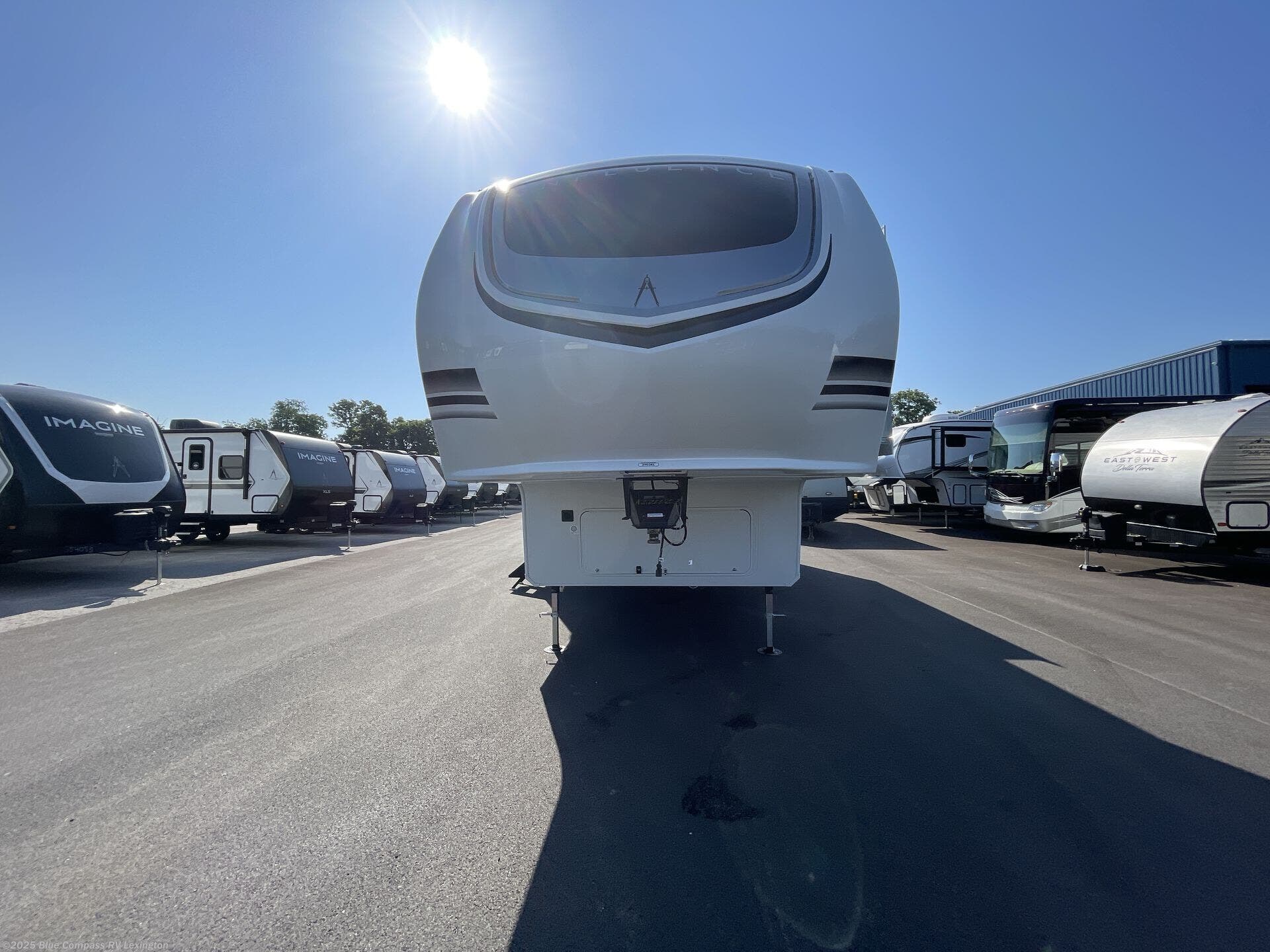 You'll feel right at home in this spacious fifth wheel with triple slides, a front master bedroom, and a kitchen island with extra counter space. The theatre seating is right across from the entertainment center which includes a 40" TV and fireplace, and there is a rear tri-fold sofa if you have any guests staying over. This model includes a hutch in the kitchen with cabinets above to store you nice dishes, plus there is a large pantry with washer and dryer prep if you plan to go full-time. Head to the dual entry bath that includes a linen closet and a spacious shower, and check out the front master bedroom with its queen bed, and slide out wardrobe. You can choose the optional king bed if you enjoy a bit more room in bed!